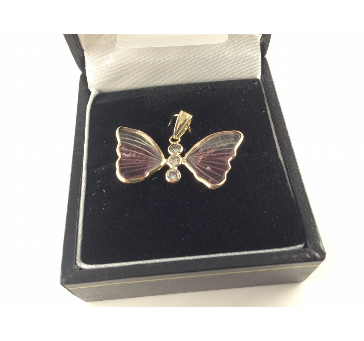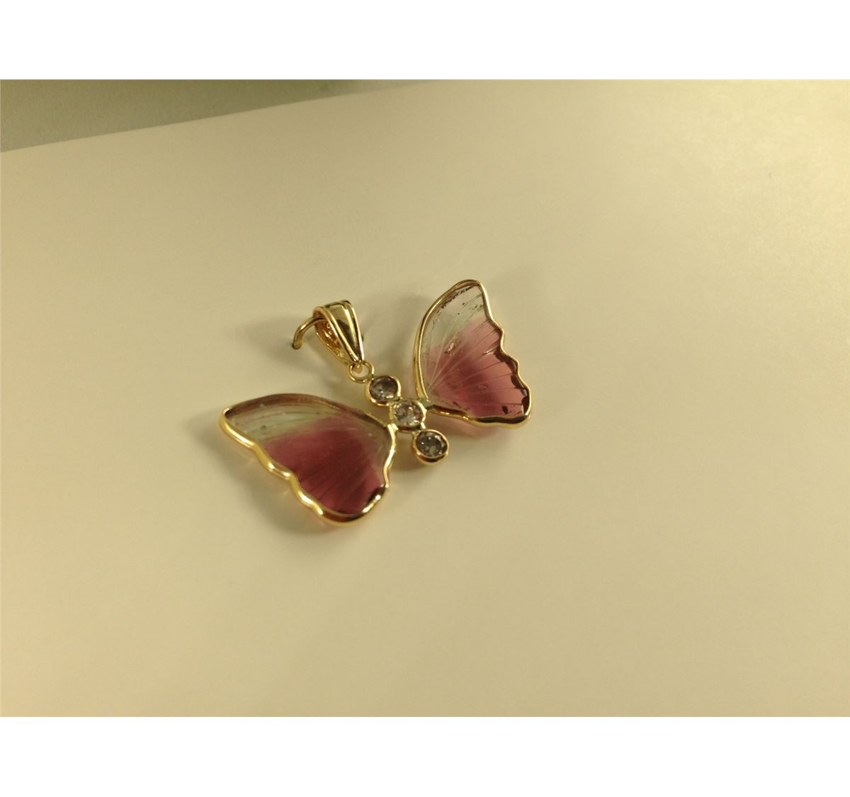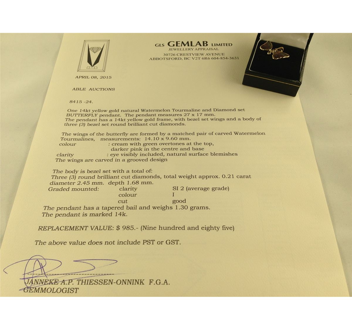 ONE 14KT YELLOW GOLD NATURAL WATERMELON TOURMALINE AND DIAMOND SET BUTTERFLY PENDANT. THE WINGS ARE FOREMED BY MATCHED PAIR OF TOURMALINES AND SET WITH THREE ROUND BRILLIANT CUT DIAMONDS SI2, I, GOOD CUT WITH GEMMOLOGIST APPRAISAL $985