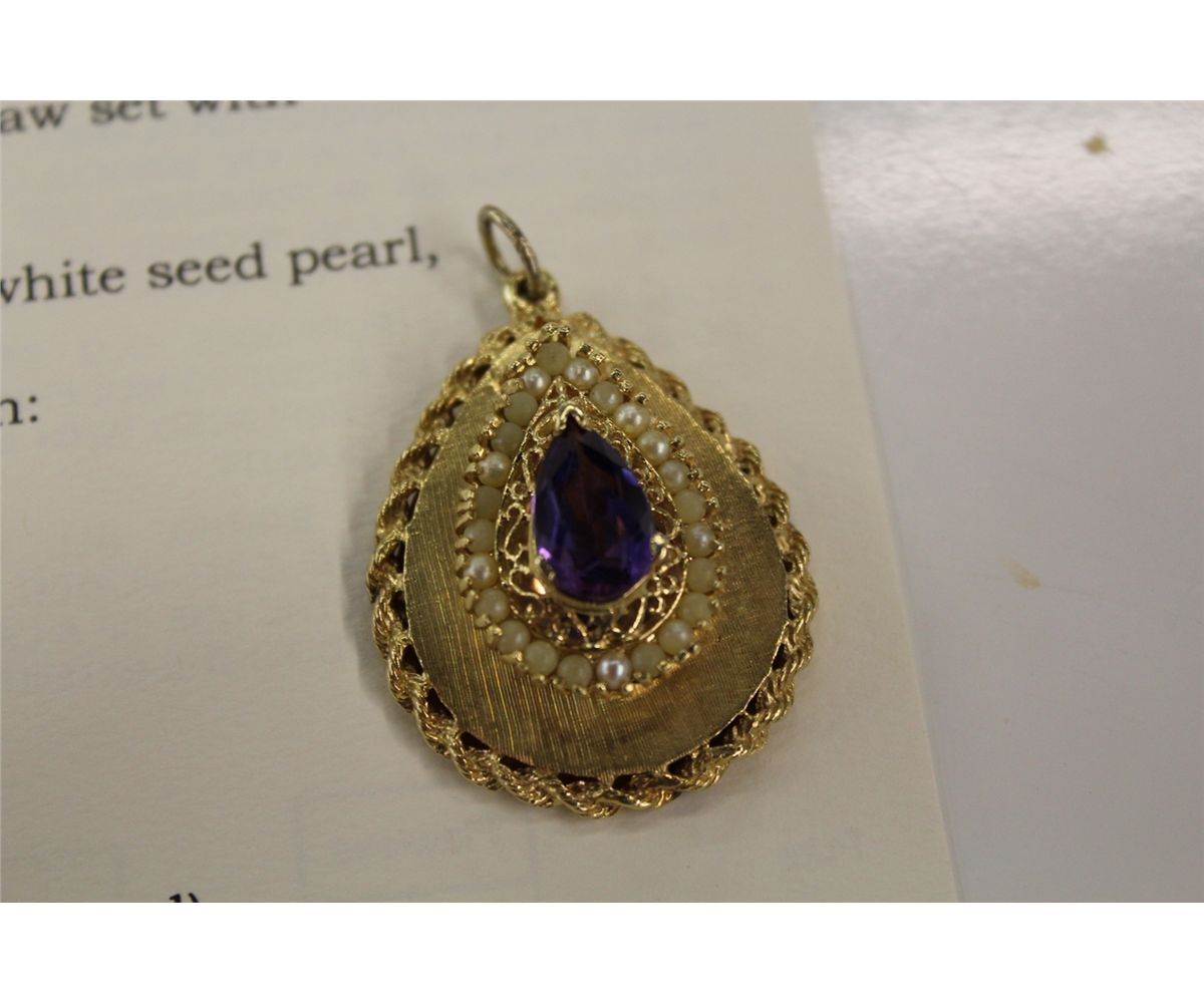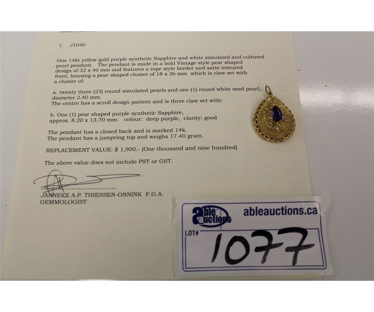 ONE 14KT YELLOW GOLD PURPLE SYNTHETIC SAPPHIRE AND WHITE SIMULATED AND CULTURED PEARL PENDANT. REPLACEMENT VALUE $1,900 INCLUDES PROFESSIONAL APPRAISAL