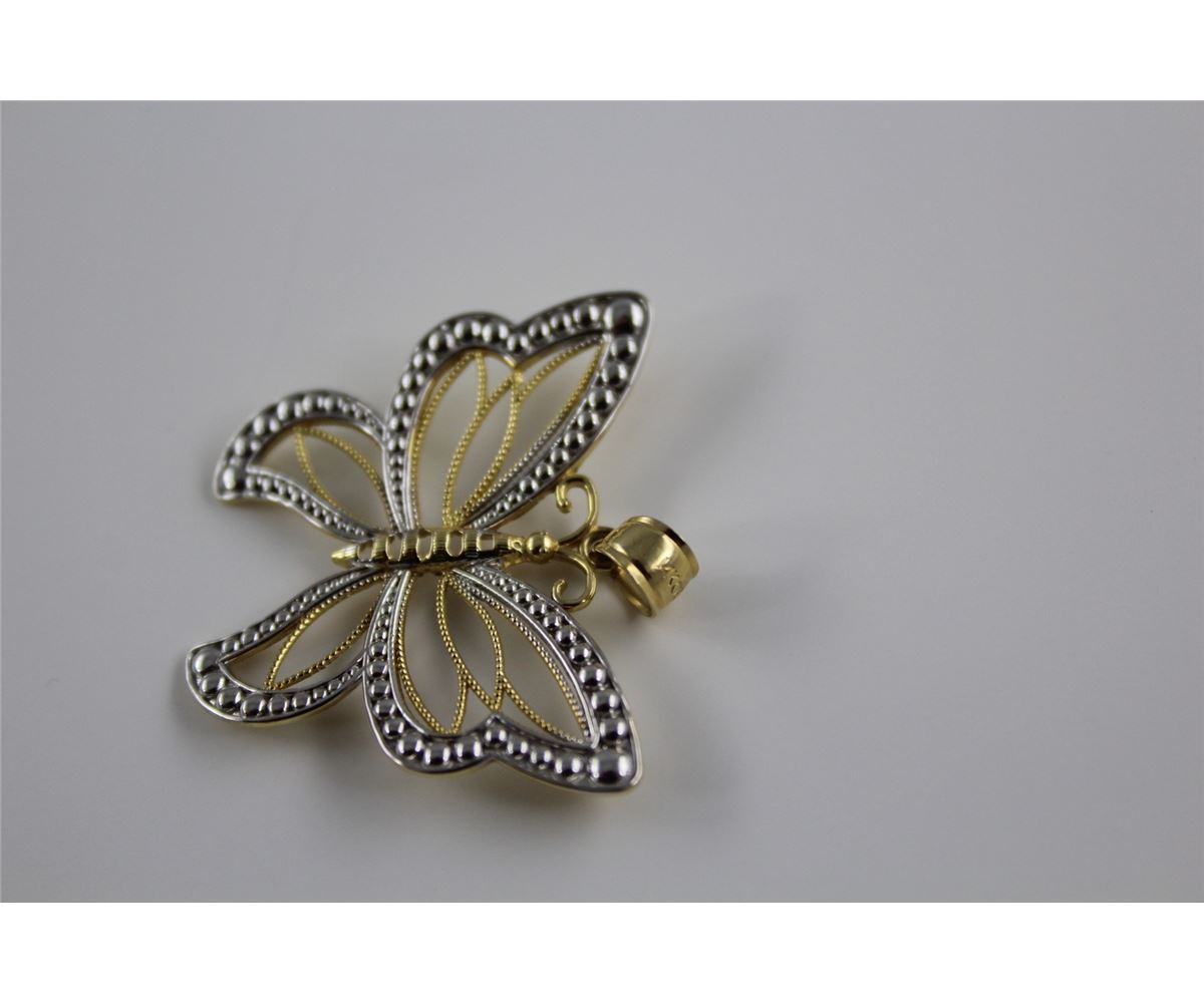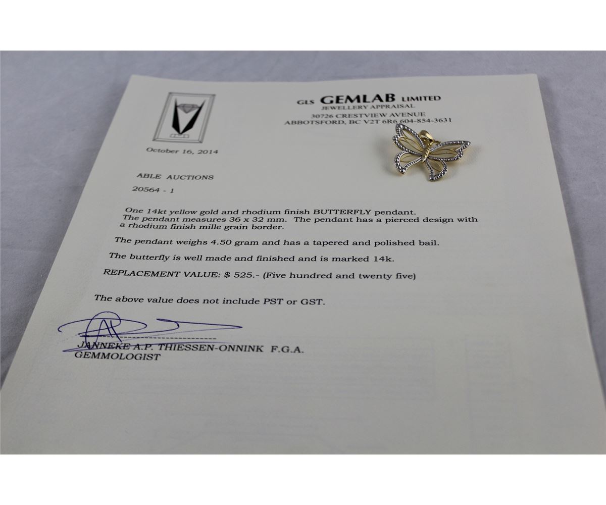 ONE 14KT YELLOW GOLD & RHODIUM FINISH BUTTERFLY PENDANT. REPLACEMENT VALUE$525.00