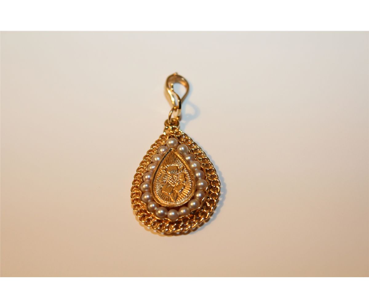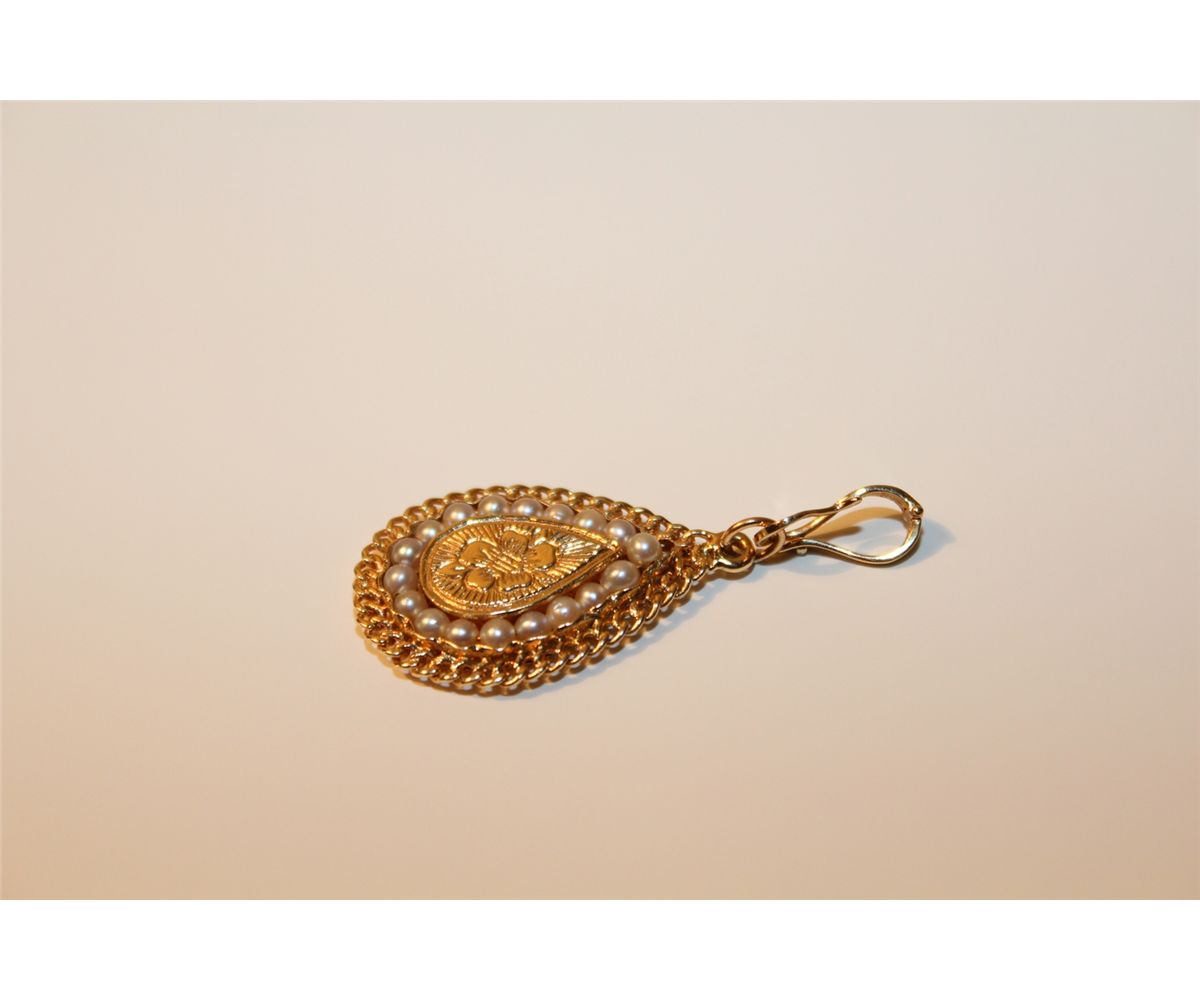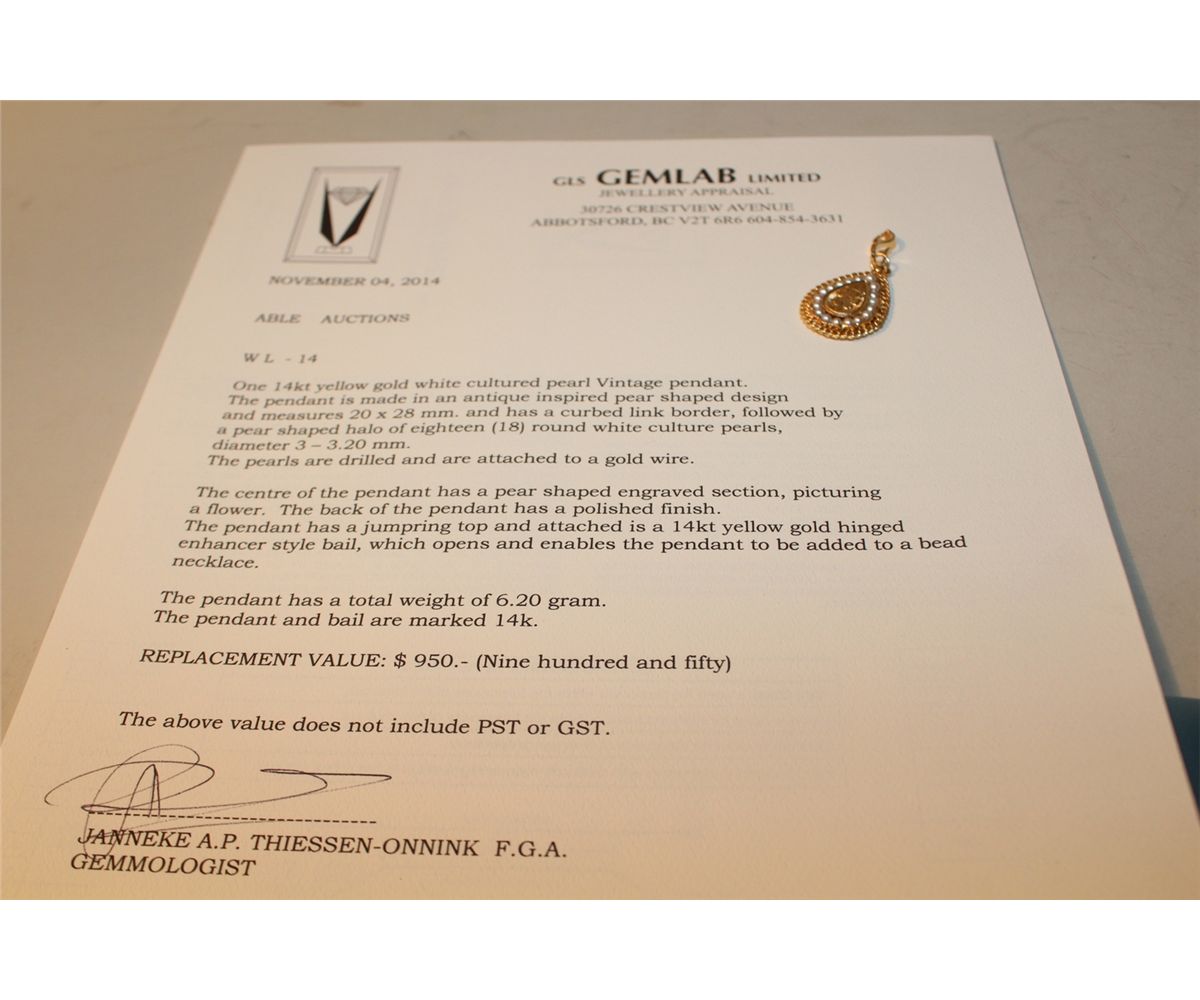 ONE 14KT. YELLOW GOLD WHITE CULTURED PEARL VINTAGE PENDANT ANTIQUE PEAR SHAPED HALO OF 18 ROUND WHITE CULTURED PEARLS. CENTER OF PENDANT HAS A ENGRAVED FLOWER . REPLACEMENT VALUE: $950.00