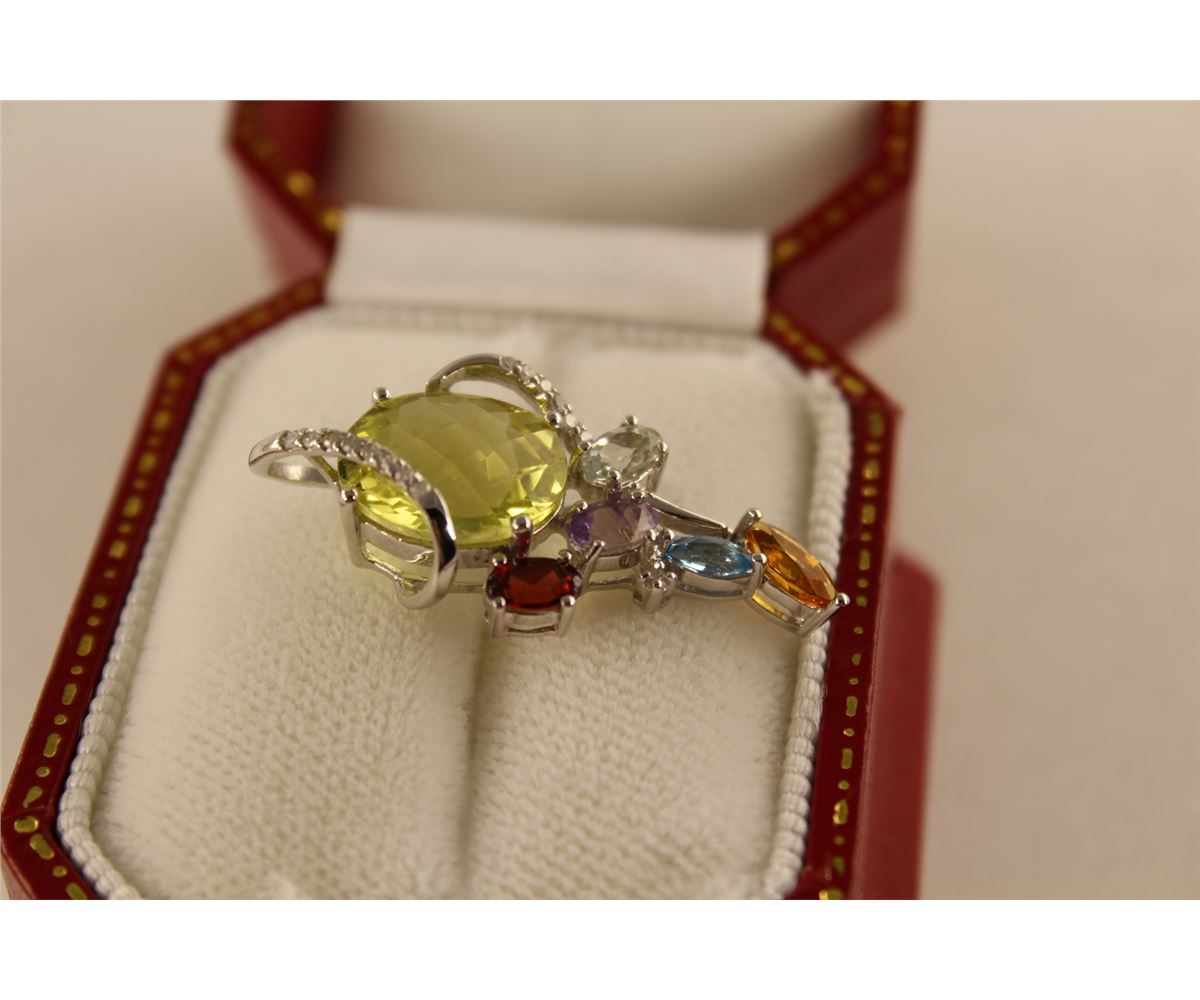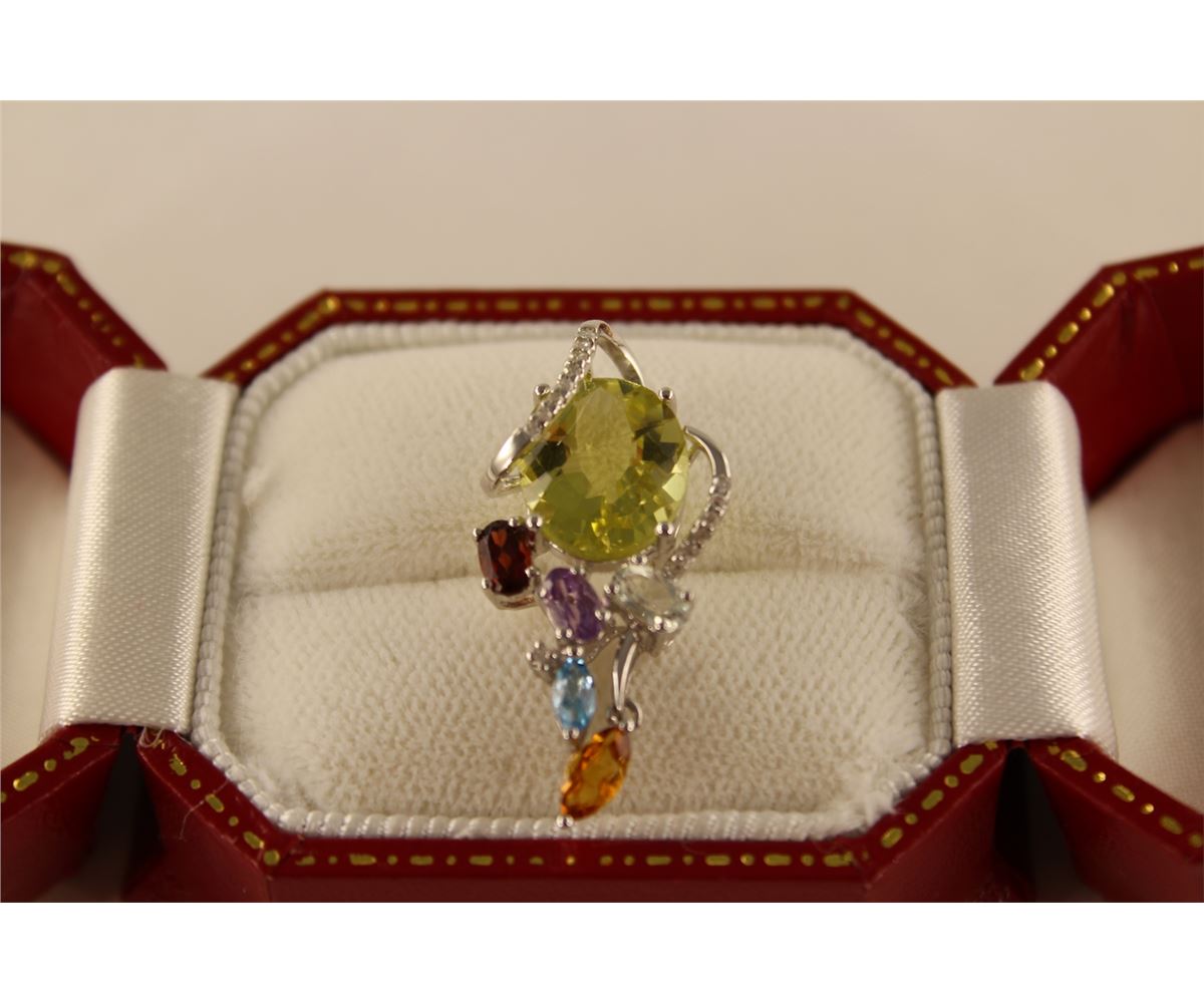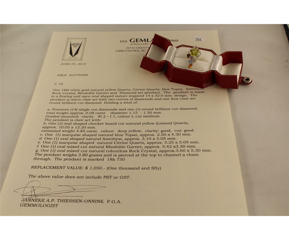 ONE 18KT WHITE GOLD NATURAL YELLOW QUARTZ, CITRINE QUARTZ, BLUE TOPAZ, AMETHYST, ROCK CRYSTAL, RHODOLITE GARNET AND DIAMOND SET PENDANT. INCL. 14 SINGLE CUT DIAMONDS 0.08CT, ONE OVAL NATURALY LEMON QUARTZ 4.85CT AND MORE. REPLACEMENT VALUE $1050