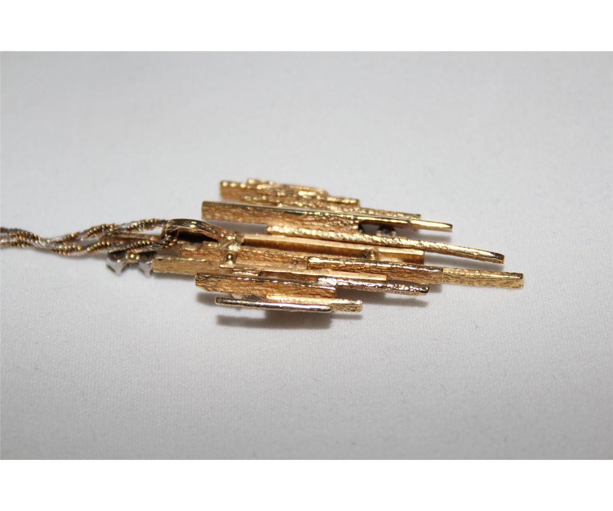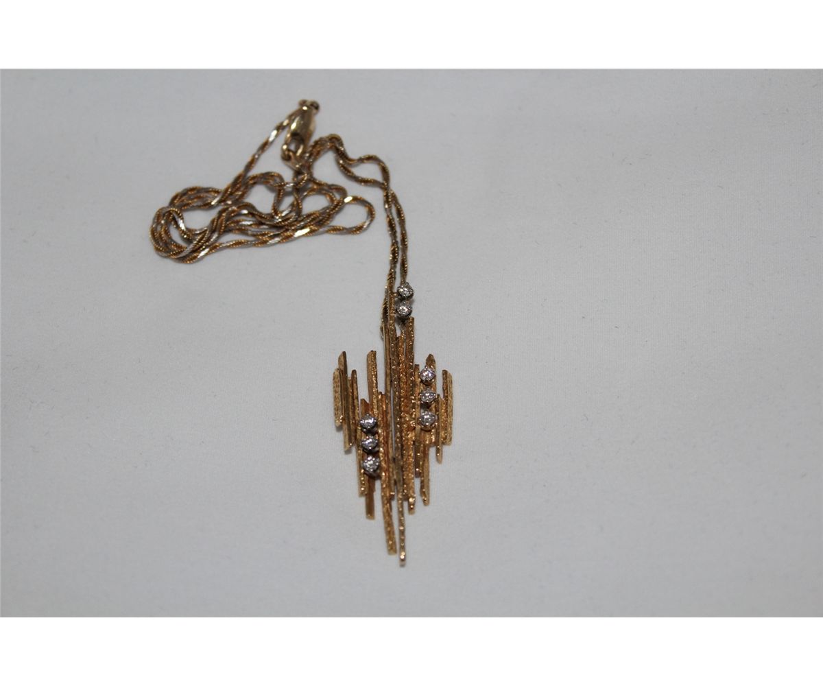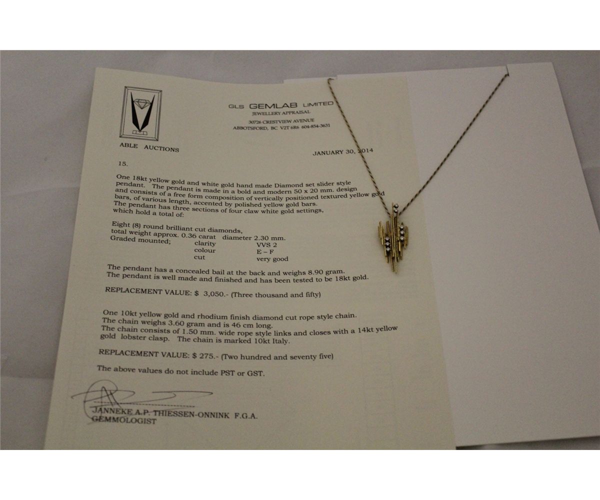 ONE 18KT YELLOW GOLD AND WHITE GOLD HAND MADE DIAMOND SET SLIDER STYLE PENDANT. THE RING IS MADE IN A BOLD AND MODERN FREE FORM COMPOSITION CONSISTING OF VERTICALLY POSITIONED TEXTURED YELLOW GOLD BARS OF VARIOUS LENGTH. THE PENDANT HAS THREE SECTIONS OF FOUR CLAW WHITE GOLD SETTINGS, WHICH HOLD A TOTAL OF: EIGHT (8) ROUND BRILLIANT CUT DIAMONDS, TOTAL WEIGHT APPROX. 0.36 CARATS. THE PENDANT HAS A CONCEALED BAIL AT THE BACK AND WEIGHS 8.90 GRAMS. INCL. GEMOLOGIST APPRAISAL WITH A REPLACEMENT VALUE OF $3,050 PLUS ONE 14KT YELLOW GOLD WHEAT LINK CHAIN