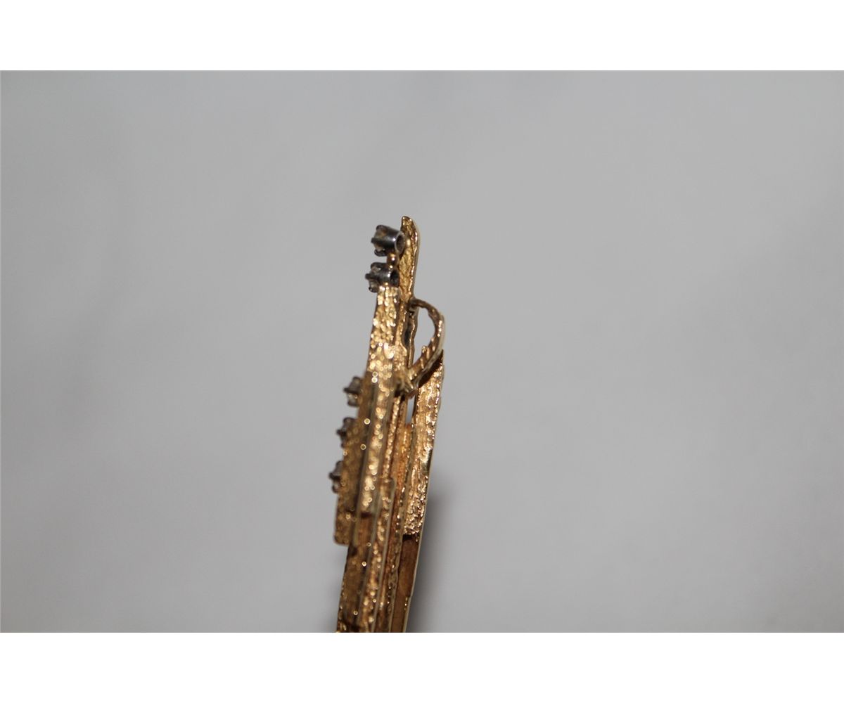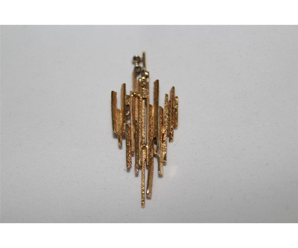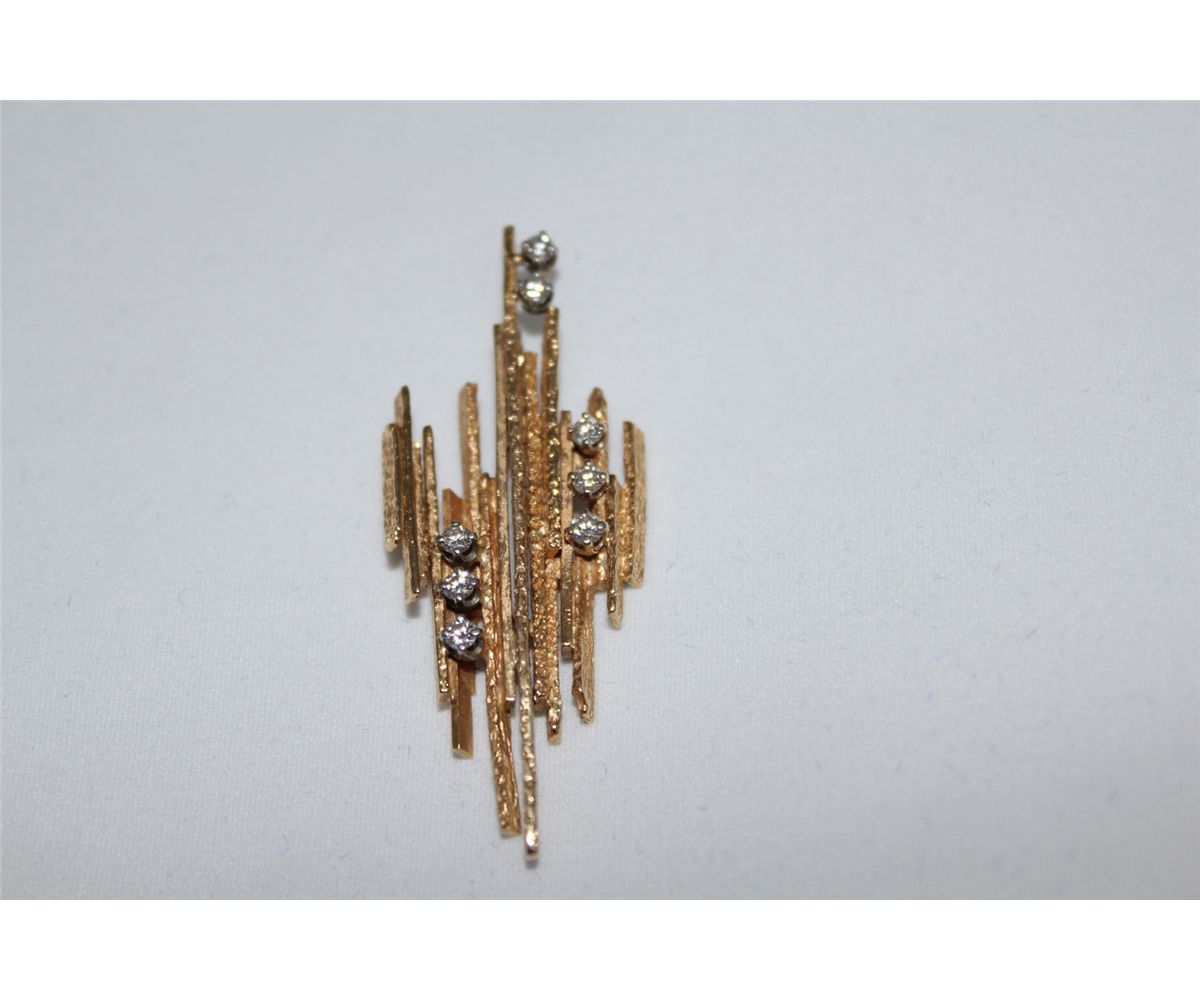 ONE 18KT YELLOW GOLD AND WHITE GOLD HAND MADE DIAMOND SET SLIDER STYLE PENDANT. THE RING IS MADE IN A BOLD AND MODERN FREE FORM COMPOSITION CONSISTING OF VERTICALLY POSITIONED TEXTURED YELLOW GOLD BARS OF VARIOUS LENGTH. THE PENDANT HAS THREE SECTIONS OF FOUR CLAW WHITE GOLD SETTINGS, WHICH HOLD A TOTAL OF: EIGHT (8) ROUND BRILLIANT CUT DIAMONDS, TOTAL WEIGHT APPROX. 0.36 CARATS. THE PENDANT HAS A CONCEALED BAIL AT THE BACK AND WEIGHS 8.90 GRAMS. INCL. GEMOLOGIST APPRAISAL WITH A REPLACEMENT VALUE OF $3,050 PLUS ONE 14KT YELLOW GOLD WHEAT LINK CHAIN