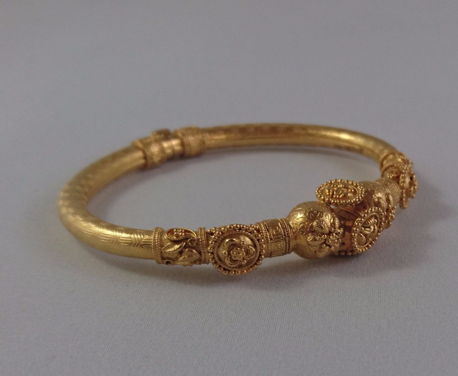 ONE 22KT YELLOW GOLD BANGLE 8.35MM WIDE DECORATIVE GROOVED LINES CREATING A BLOCK LIKE PATTERN 2 SPHERES WITH FILIGREE SECTIONS 12.30 MM WIDE WEIGHT 23.50 GRAMS REPLACEMENT VALUE $2,600