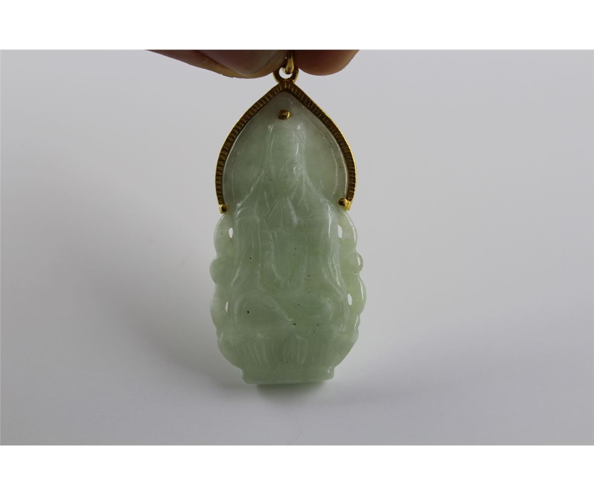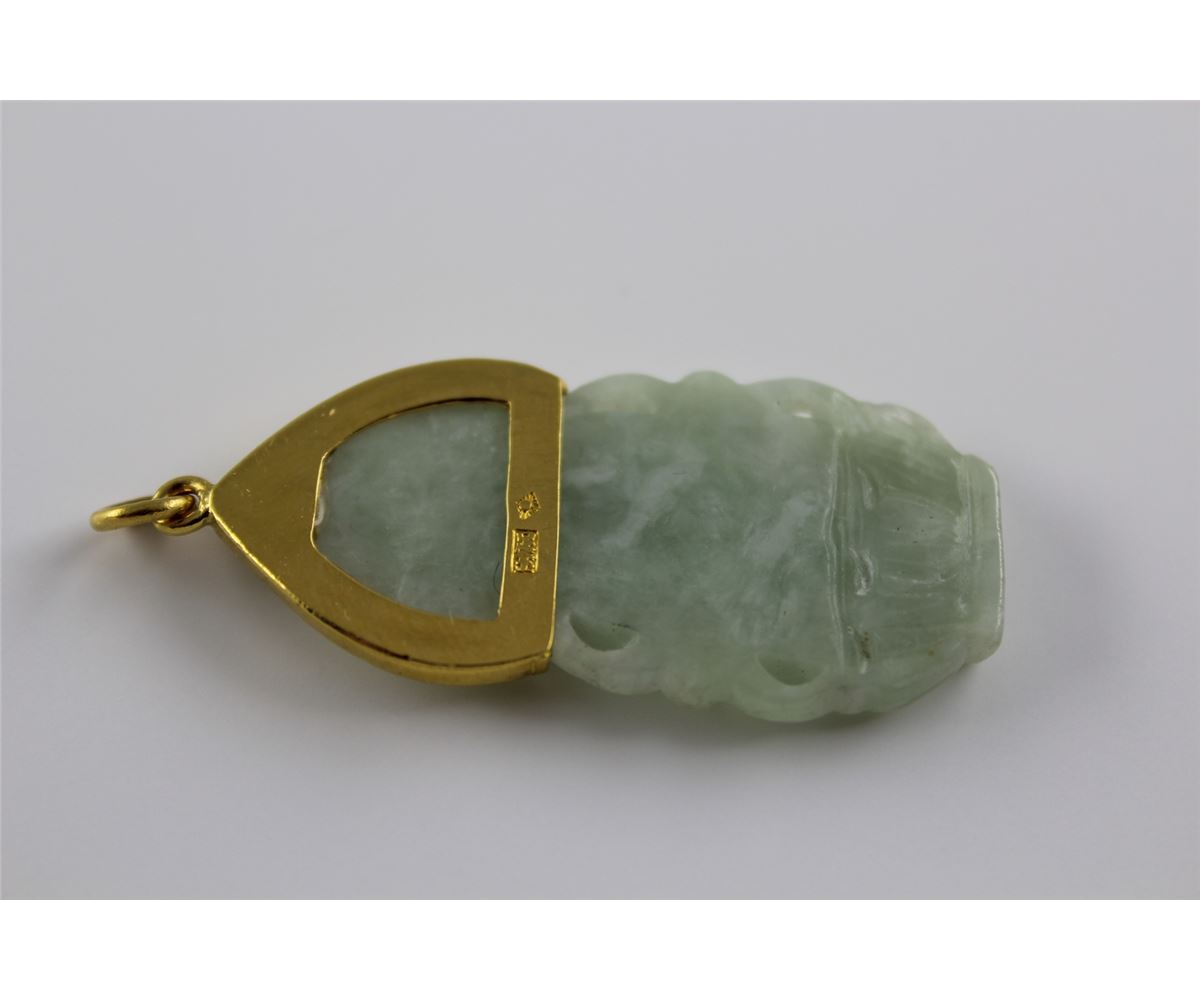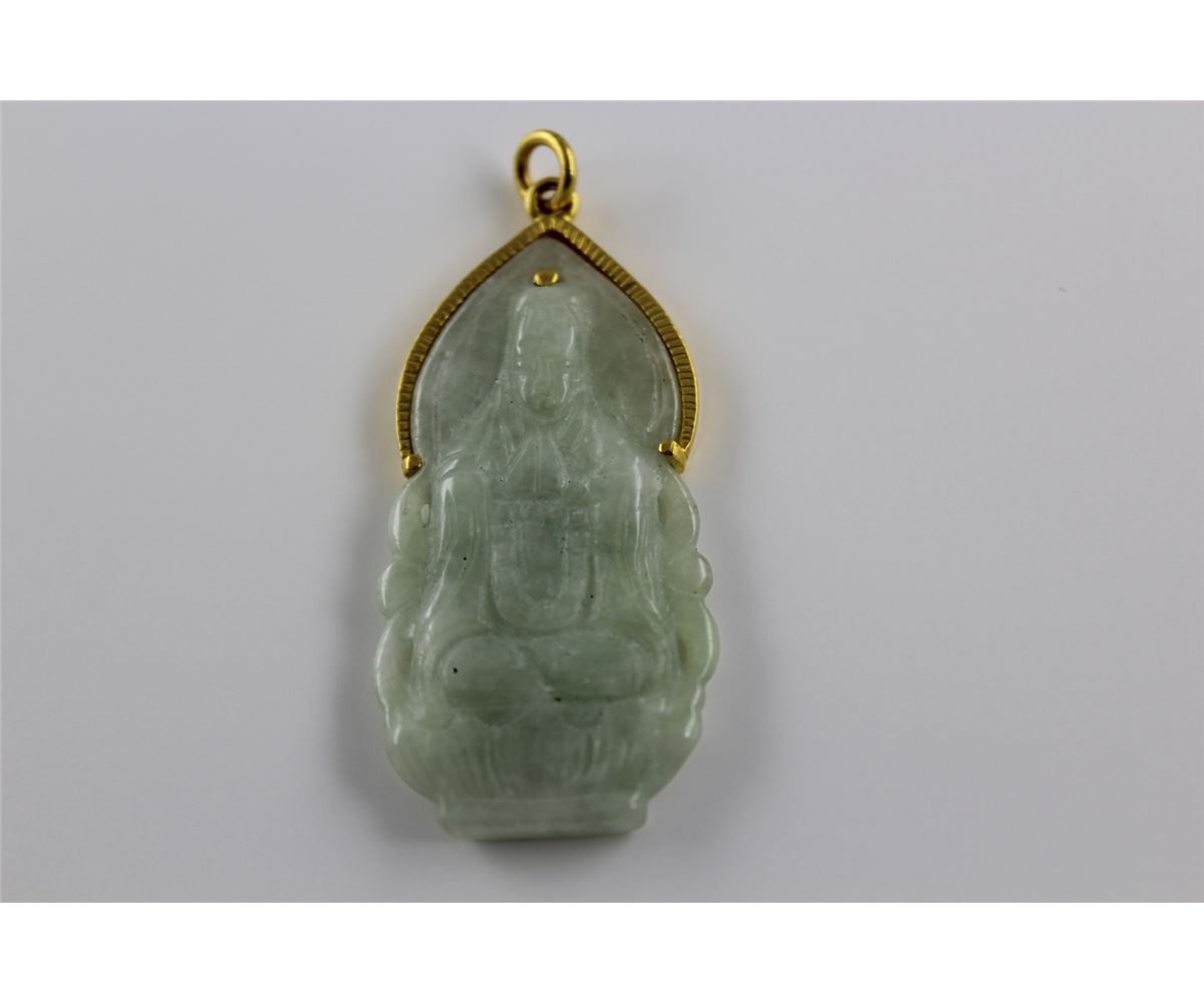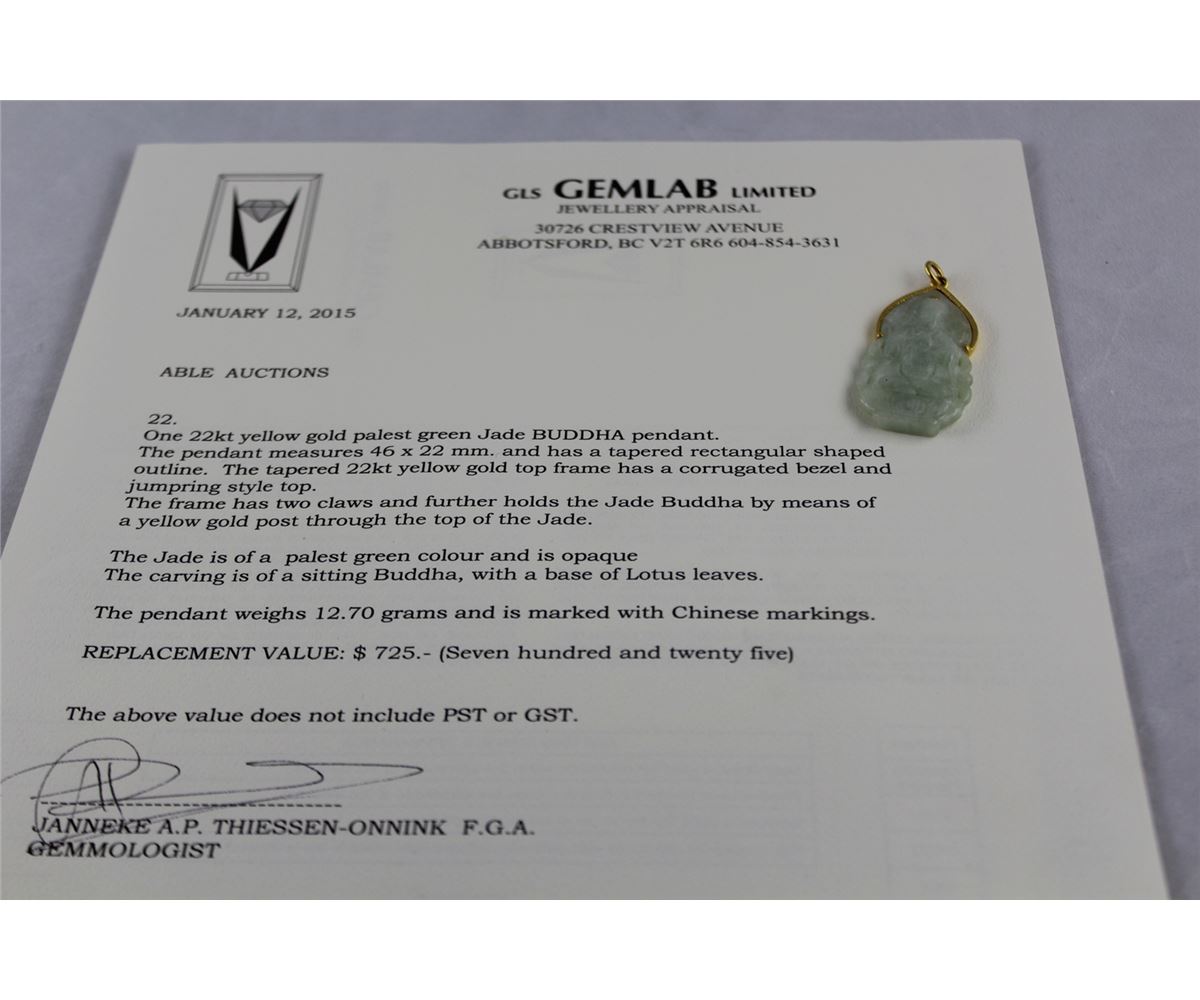 ONE 22KT YELLOW GOLD & PALEST GREEN JADE BUDDHA PENDANT. THE CARVING IS OF A SITTING BUDDHA WITH A BASE OF LOTUS LEAVES. REPLACEMENT VALUE: $725.00