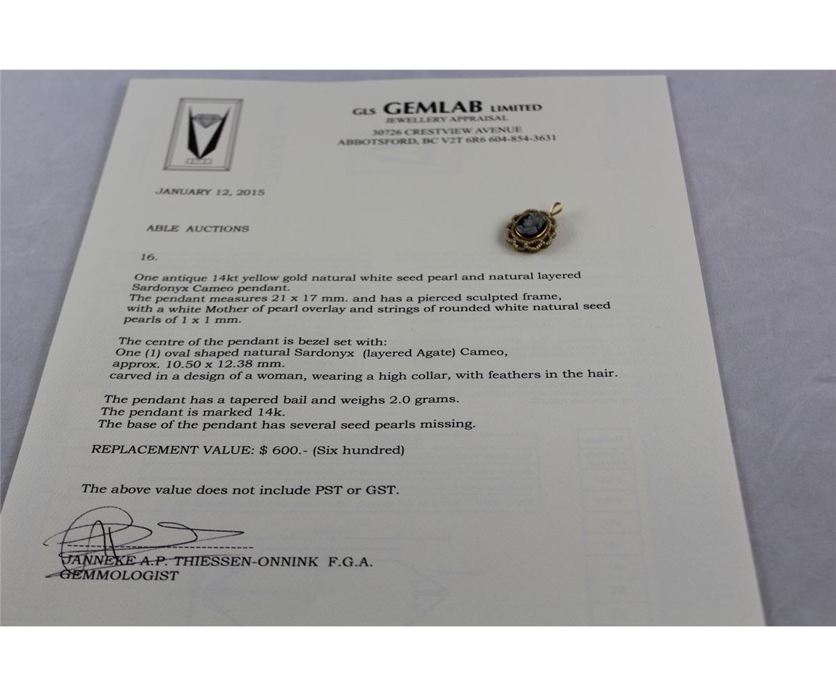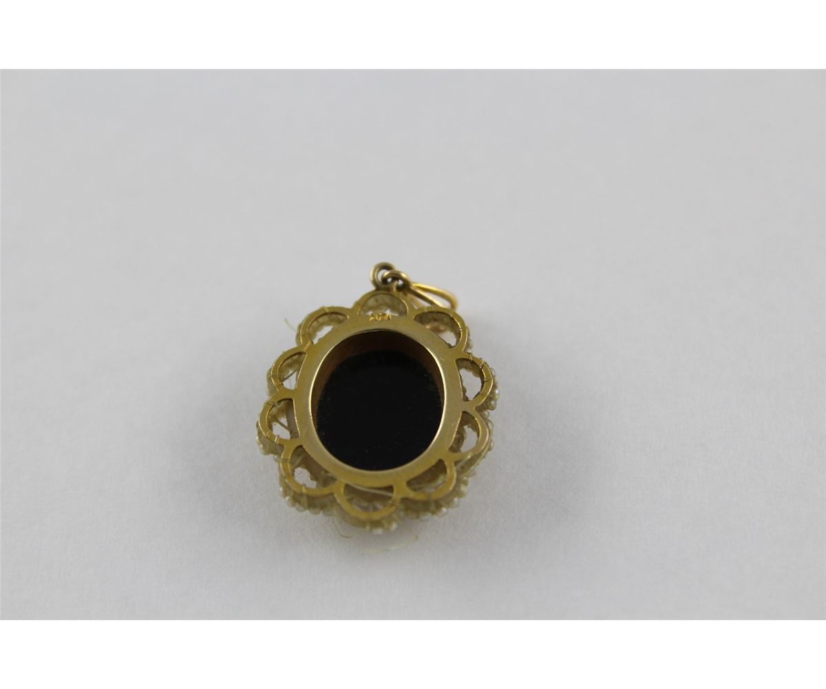ONE ANTIQUE 14KT YELLOW GOLD NATURAL WHITE SEED PEARL AND NATURAL LAYERED SARDONYX CAMEO PENDANT. BEZEL SET WITH 1 OVAL SHAPED NATURAL SARDONYX (INLAYED AGATE) CAMEO CARVED IN A DESIGN OF A WOMAN WEARING A HIGH COLLAR WITH FEATHERS IN HAIR. REPLACEMENT VALUE: $600.00