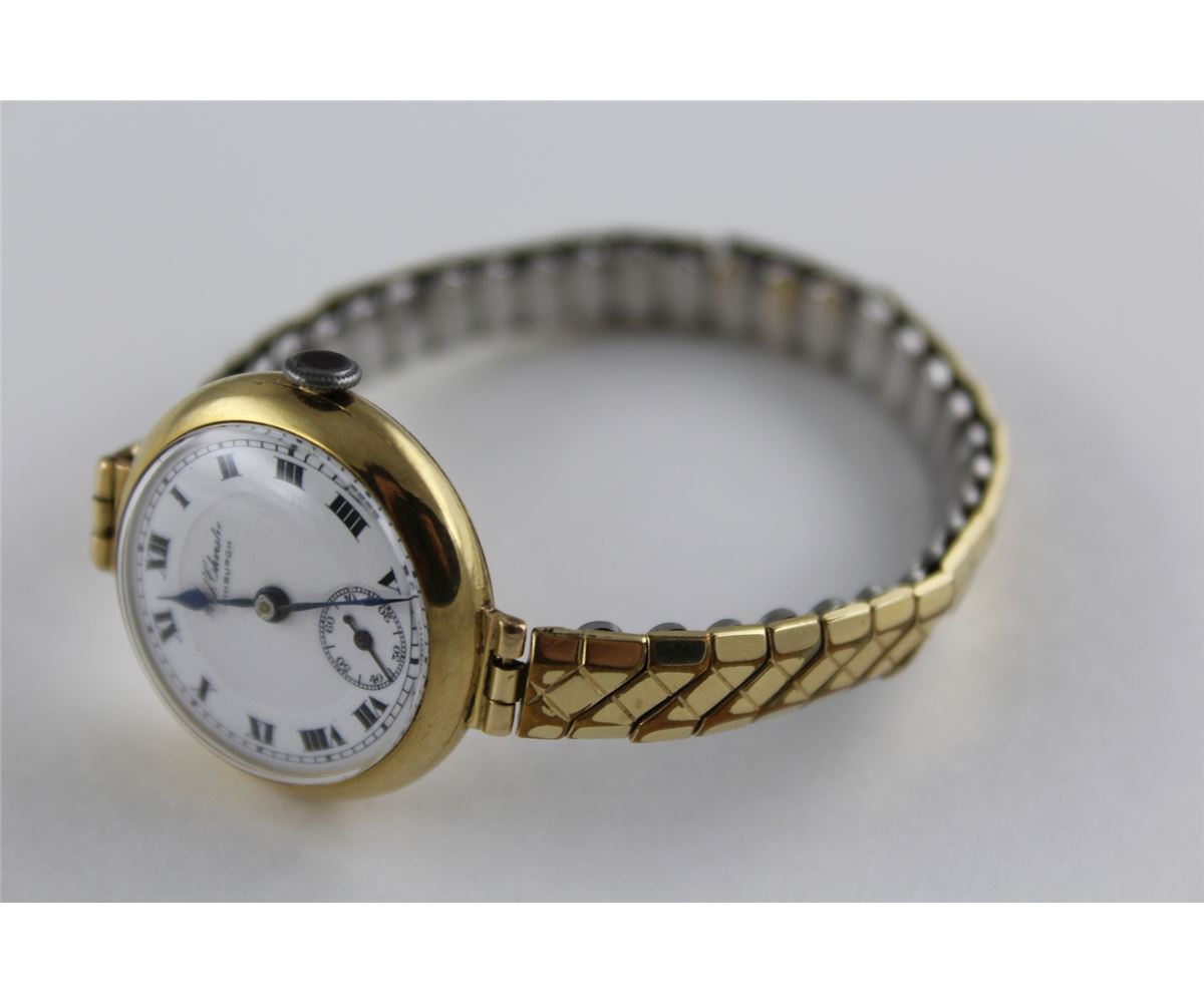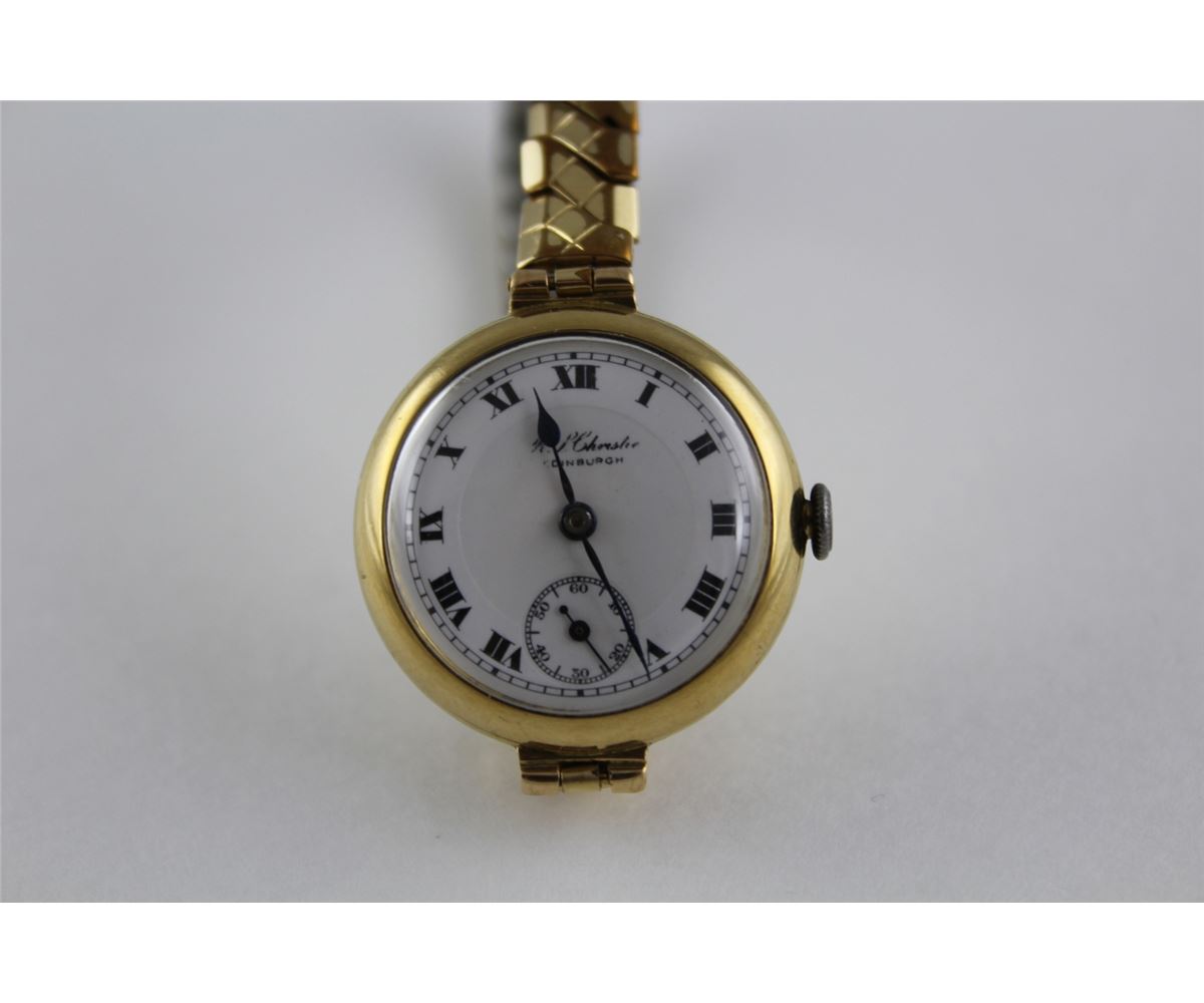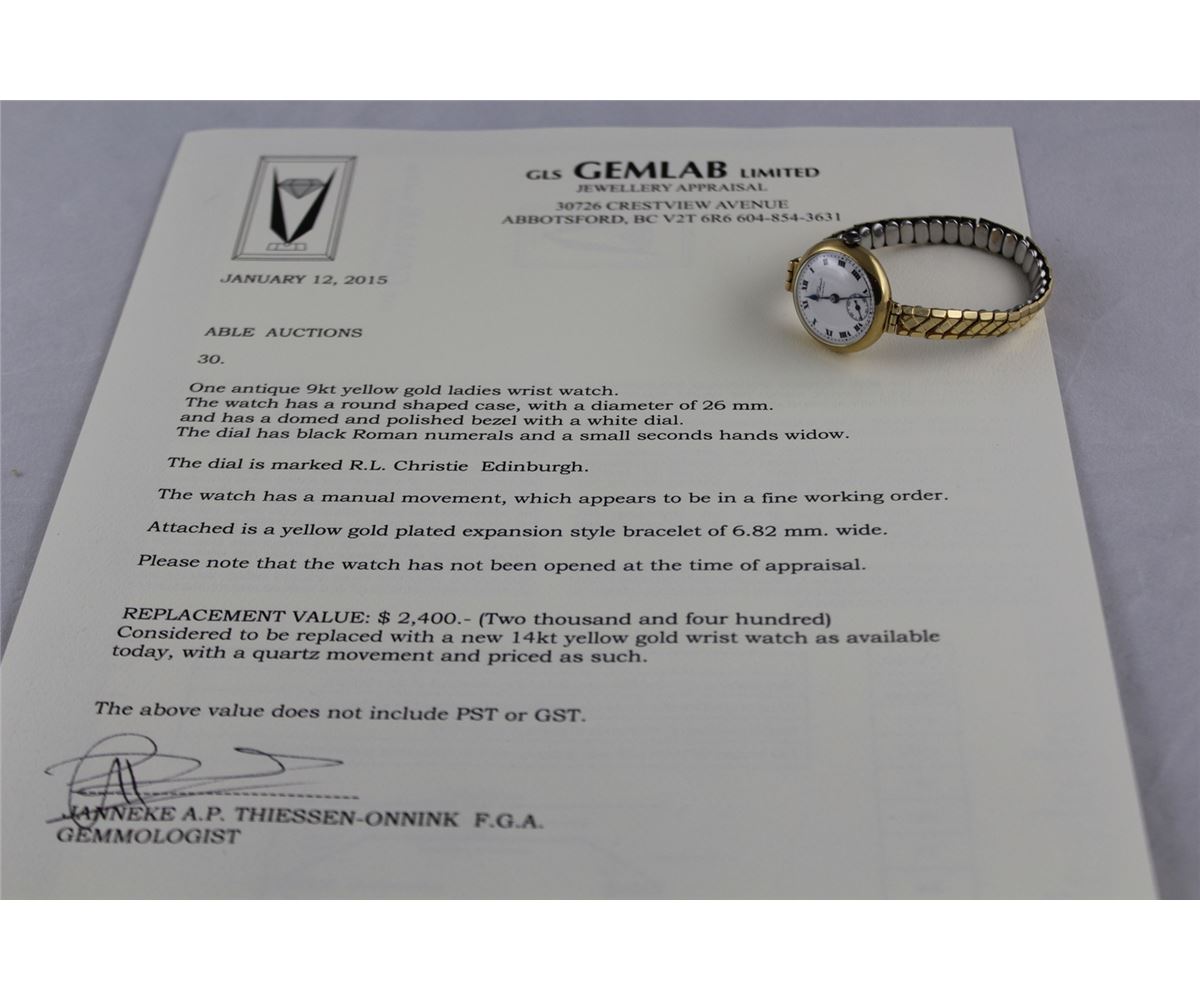 ONE ANTIQUE  9KT. YELLOW GOLD LADIES WRIST WATCH .  DIAL IS MARKED R.L. CHRISTIE EDINBURGH. ATTACHED IS A YELLOW  GOLD PLATED EXPANSION STYLE BRACELET.   REPLACEMENT VALUE: $2400.00