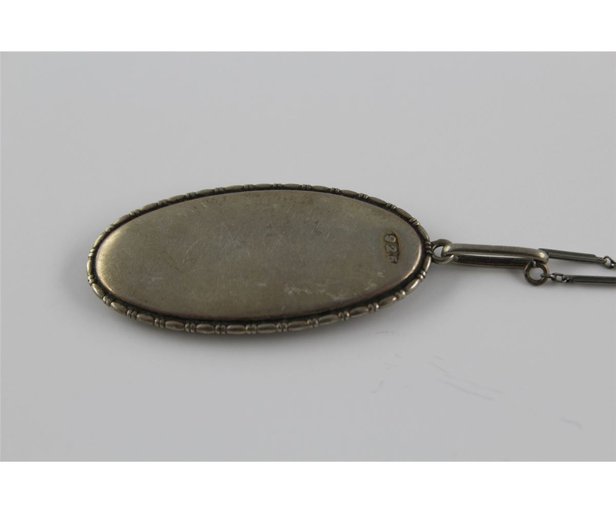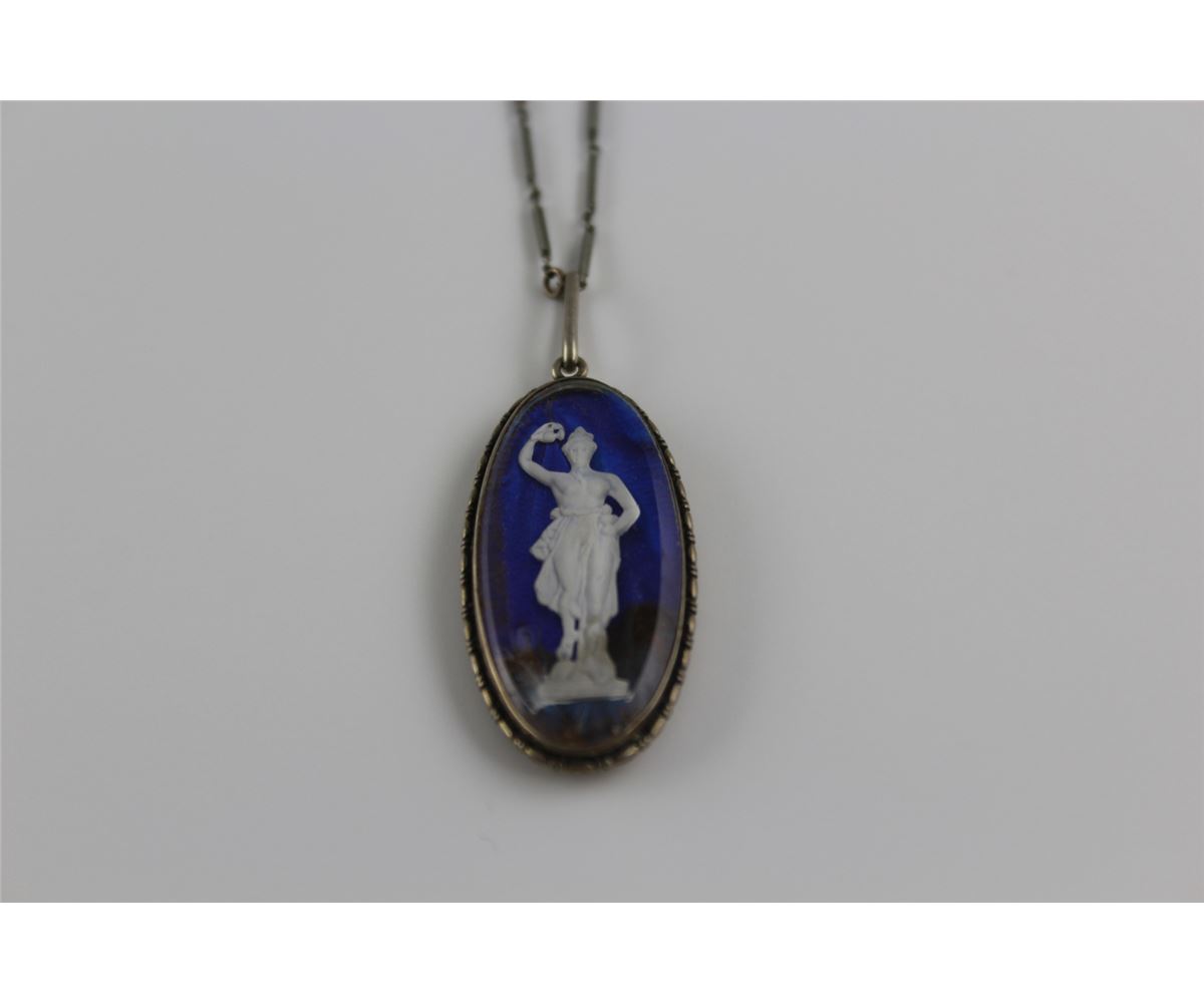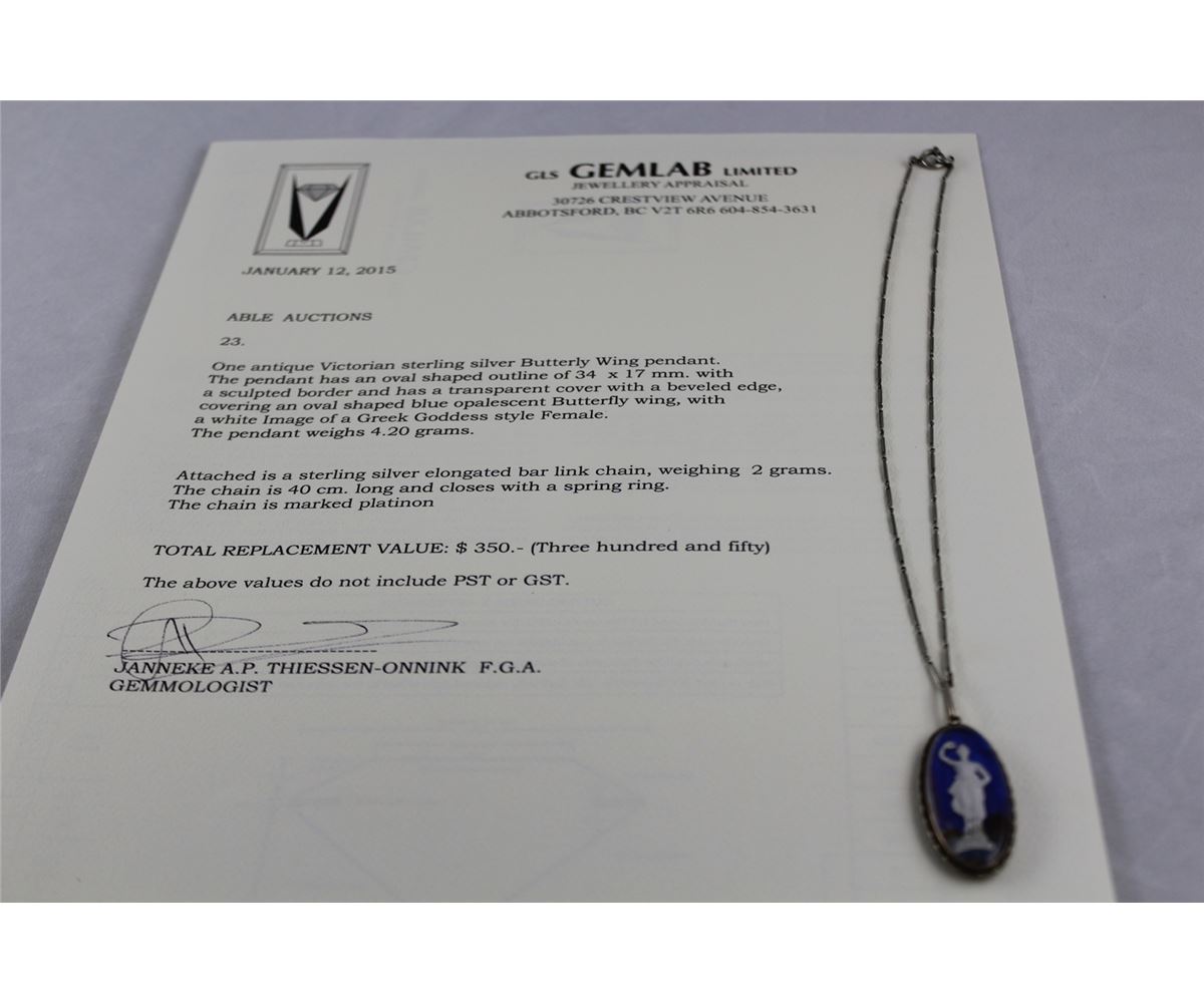 ONE ANTIQUE VICTORIAN STERLING SILVER BUTTERFLY WING PENDANT. HAS A TRANSPARENT COVER WITH A BEVELED EDGE, COVERING AN OVAL SHAPED BLUE OPALESCENT BUTTERFLY WING WITH A WHITE IMAGE OF A GREEK GODDESS STYLE FEMALE. ATTACHED IS A STERLING SILVER BAR CHAIN. REPLACEMENT VALUE:$350.00