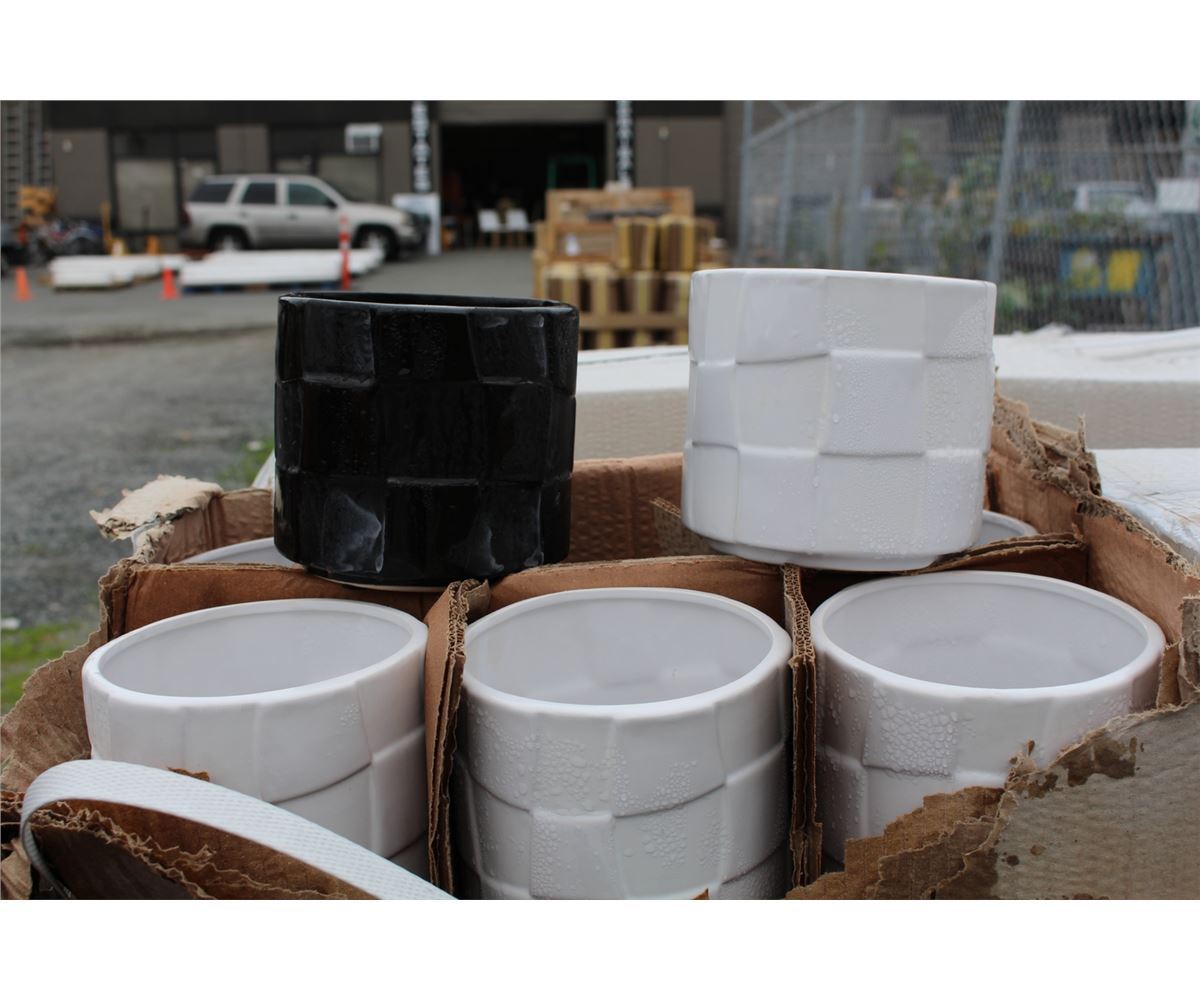 ONE BOX OF 12 SMALL CERAMIC PLANTERS (6 WHITE, 6 BLACK PER BOX)