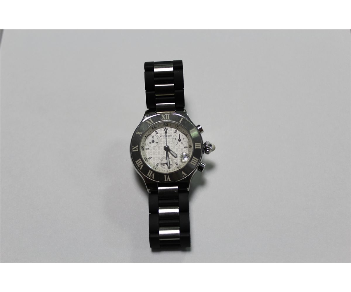 ONE CARTIER STAINLESS STEEL LADIES OR GENTS CHRONOGRAPH 21 WRIST WACTH. THE WATCH HAS A QUARTZ MOVEMENT AND APPEARS TO BE IN WORKING ORDER. REPLACEMENT VALUE $4,200