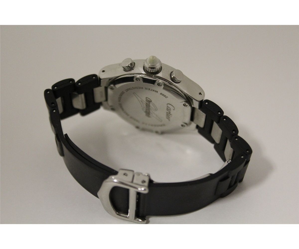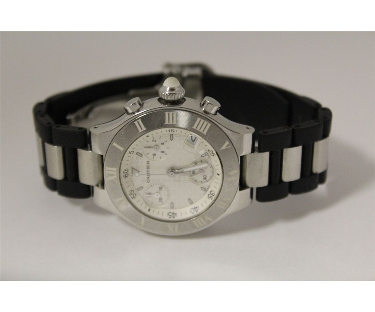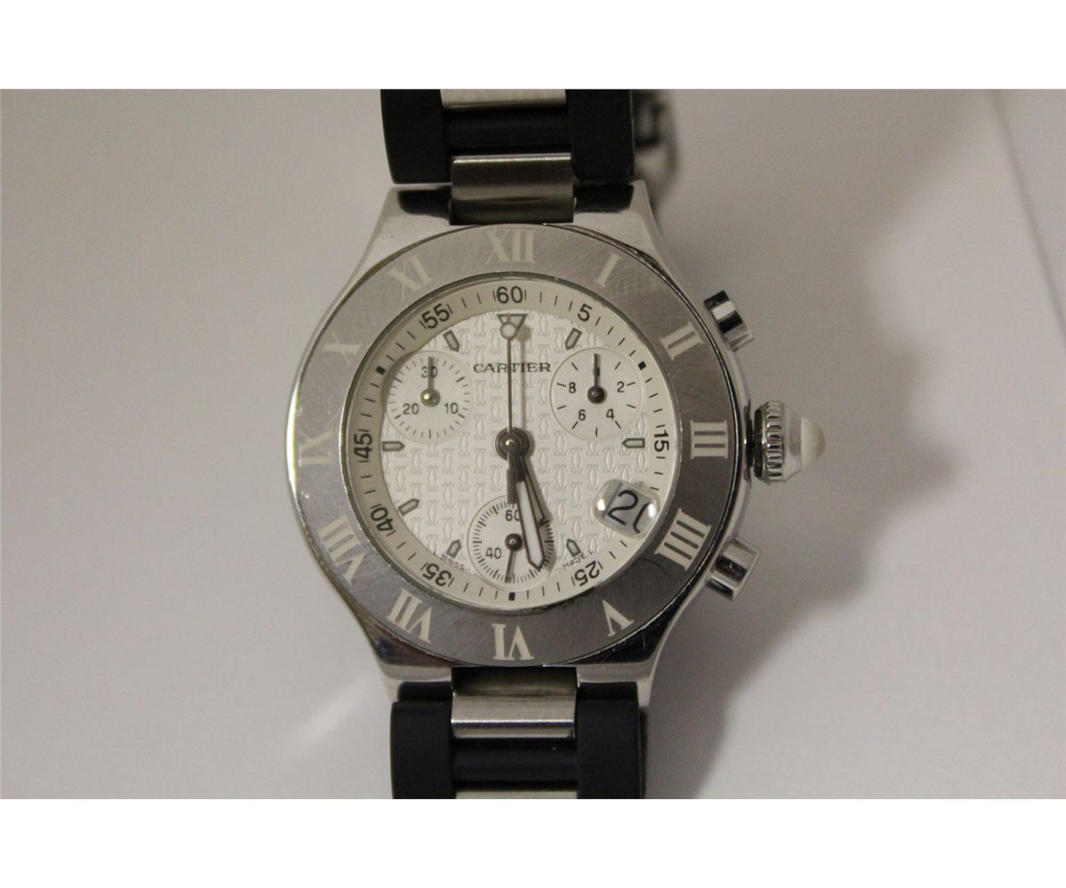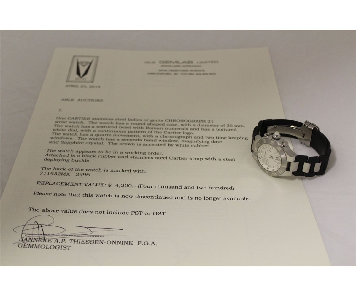 ONE CARTIER STAINLESS STEEL LADIES OR GENTS CHRONOGRAPH 21 WRIST WATCH. THE WATCH HAS A QUARTZ MOVEMENT, WITH A CHRONOGRAPH AND TWO TIME KEEPING WINDOWS. THE BACK OF THE WATCH IS MARKED 711932MX 2996 INCL. COMBINED GEMMOLOGIST APPRAISAL OF 4200