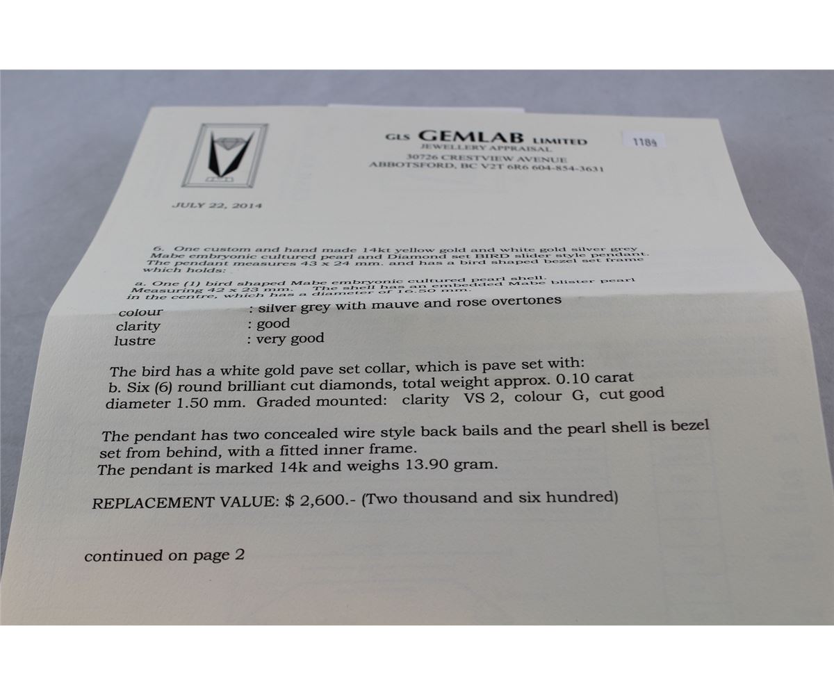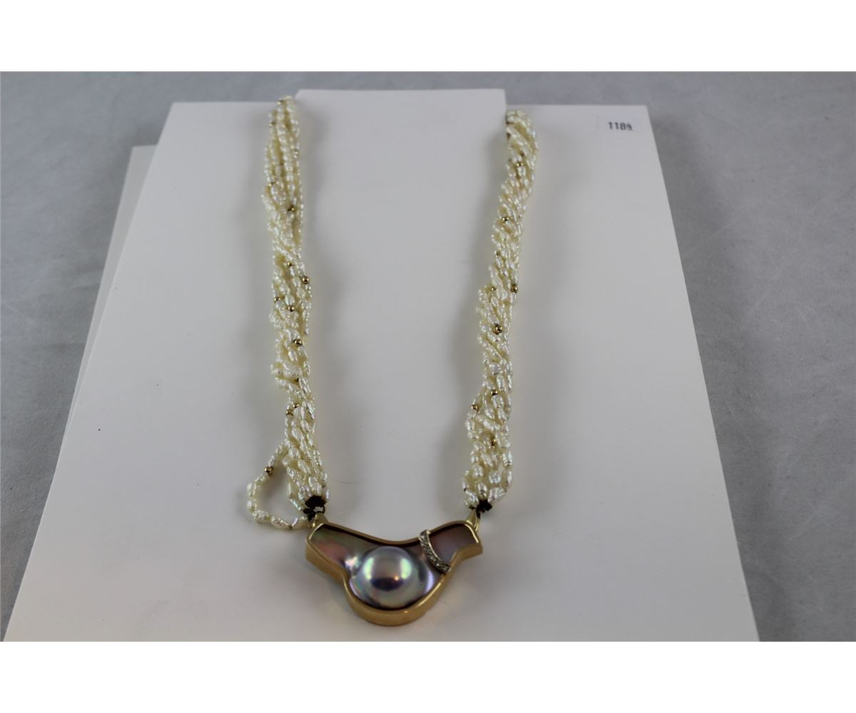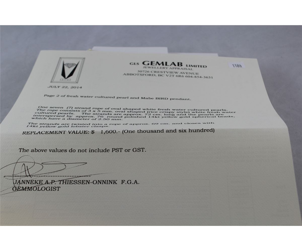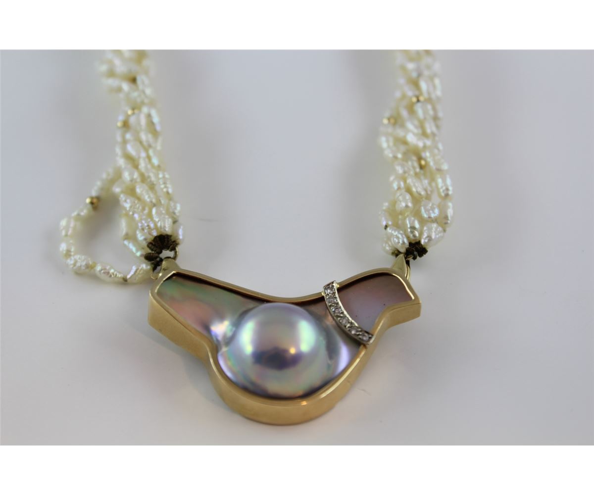 ONE CUSTOM AND HAND MADE 14KT YELLOW GOLD AND WHITE GOLD SILVER GREY MABE EBRYONIC CULTURED PEARL SLIDER SET ON A 7 STRAND ROPE OF OVAL SHAPED WHITE FRESH WATER CULTURED PEARLS. COMBINED REPLACEMENT VALUE $4200