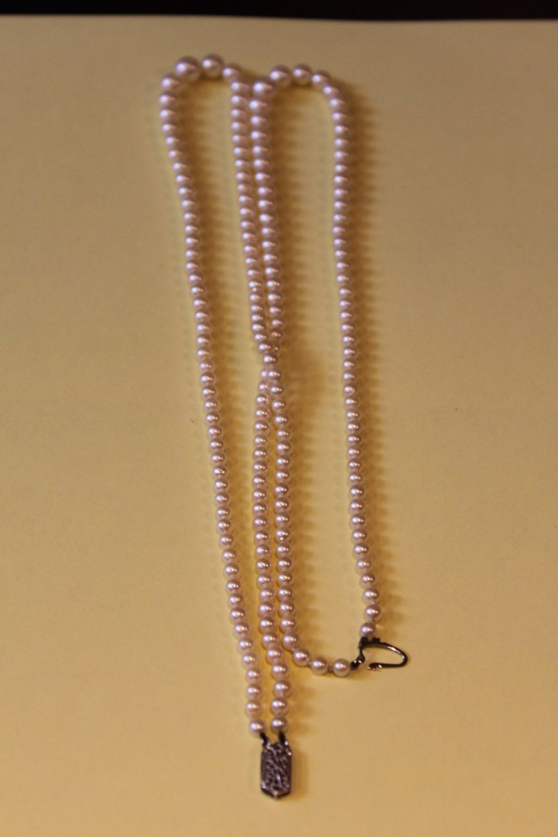 The strand closes with a 10kt white gold filigree style fish hook clasp.