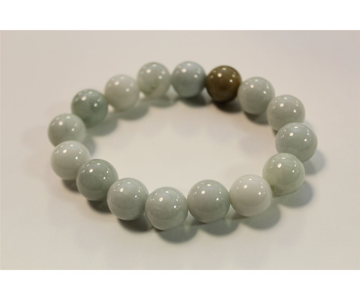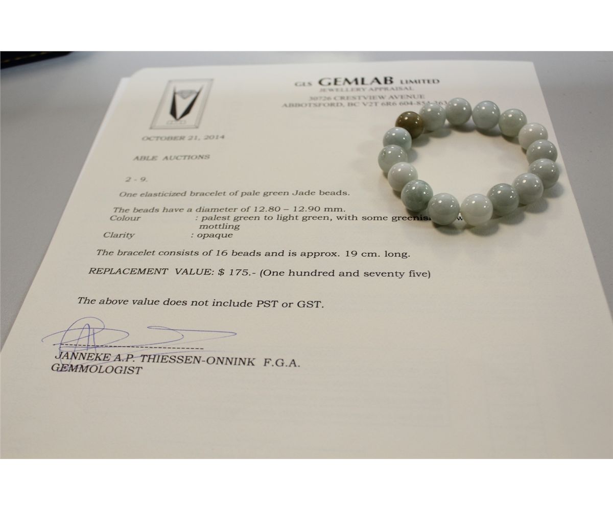 ONE ELASTICISED BRACELET OF 16 PALE GREEN JADE BEADS. APPROX. 19CM LONG. REPLACEMENT VALUE: 175