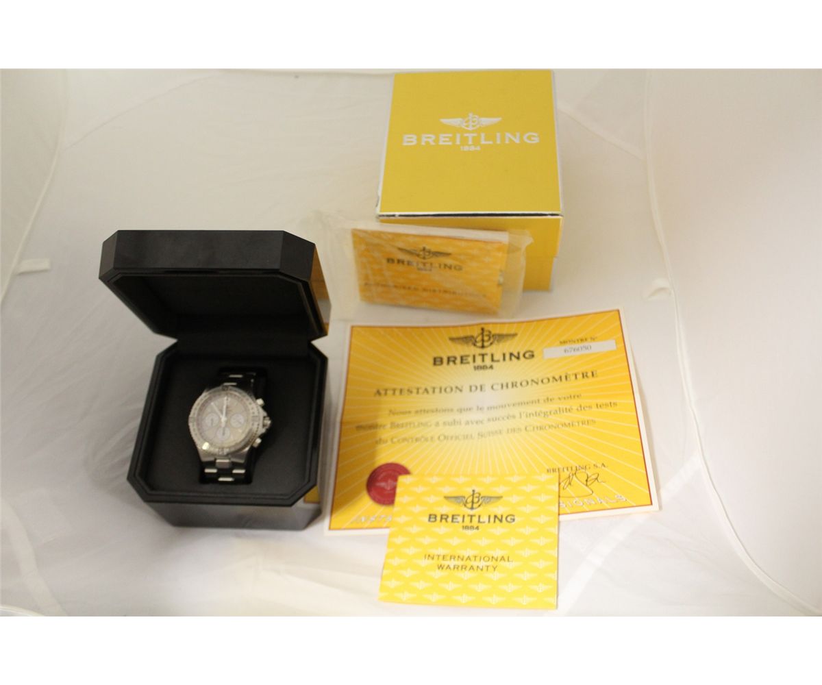 ONE GENTS STAINLESS STEEL BREITLING HERCULES WRIST WATCH. THE WATCH FEATURES AN AUTOMATIC MOVEMENT AND A CHRONOGRAPH AND INCLUDES ORIGINAL BOX AND PAPERWORK. RECENTLY SERVICED BY BREITLING WITH RECEIPT. THE MODEL # IS A39363 SERIAL 676050 INCL. GEMMOLOGIST APPRAISAL OF $5835
