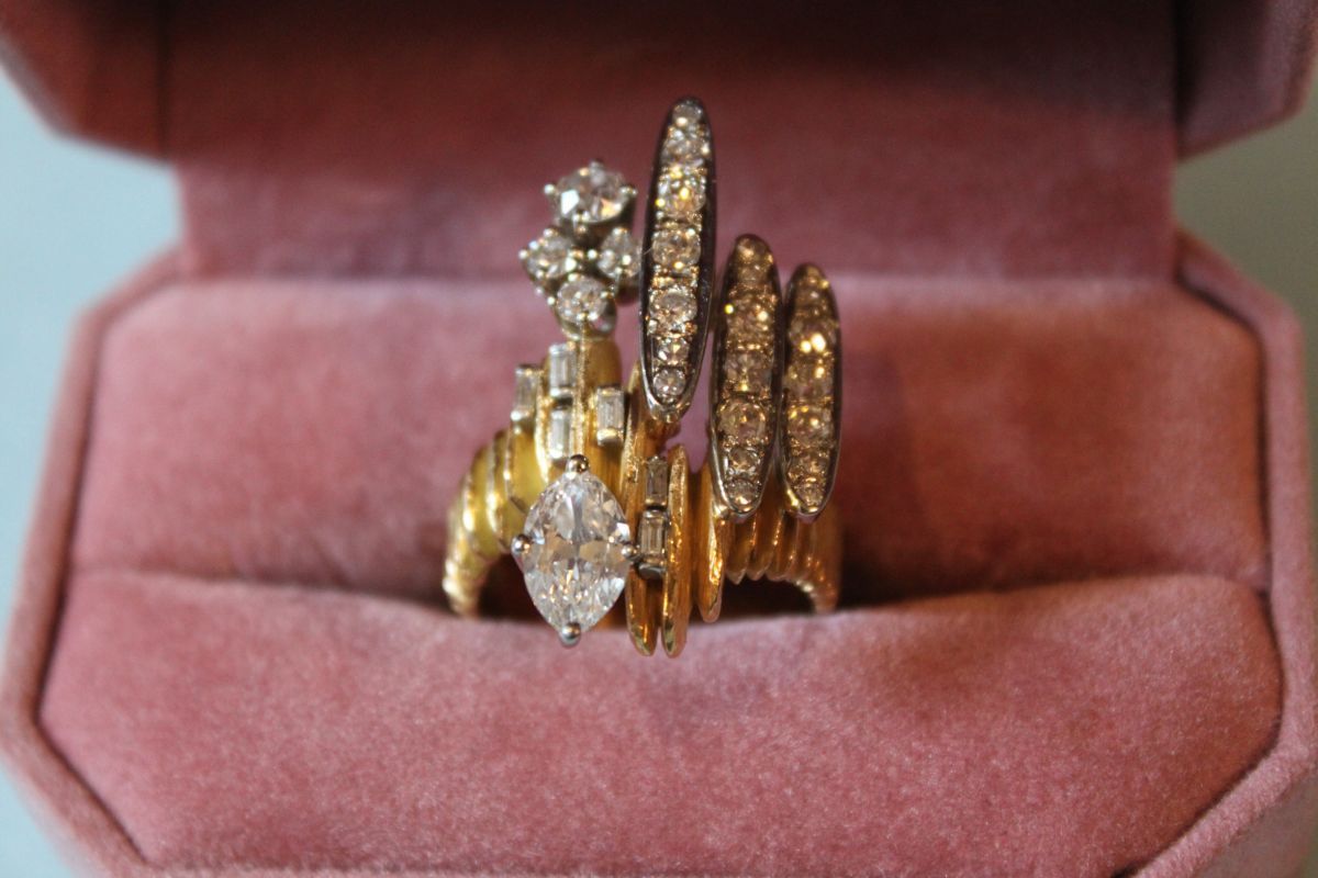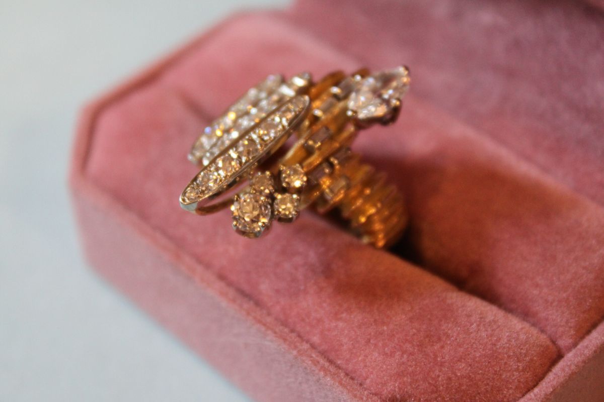 The ring is made in a bold and modern free form cluster design and has a yellow gold body of 32 mm wide with a tree bark textured finish of vertical and grooved lines and a white gold top of hand made wire and claw settings and three vertical bars.  The ring is pave and claw set with single and old European cut diamonds.