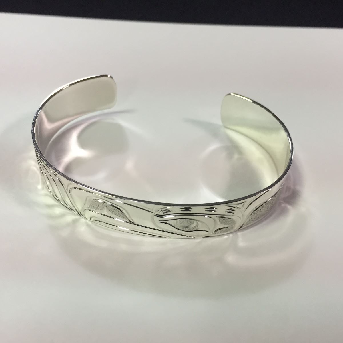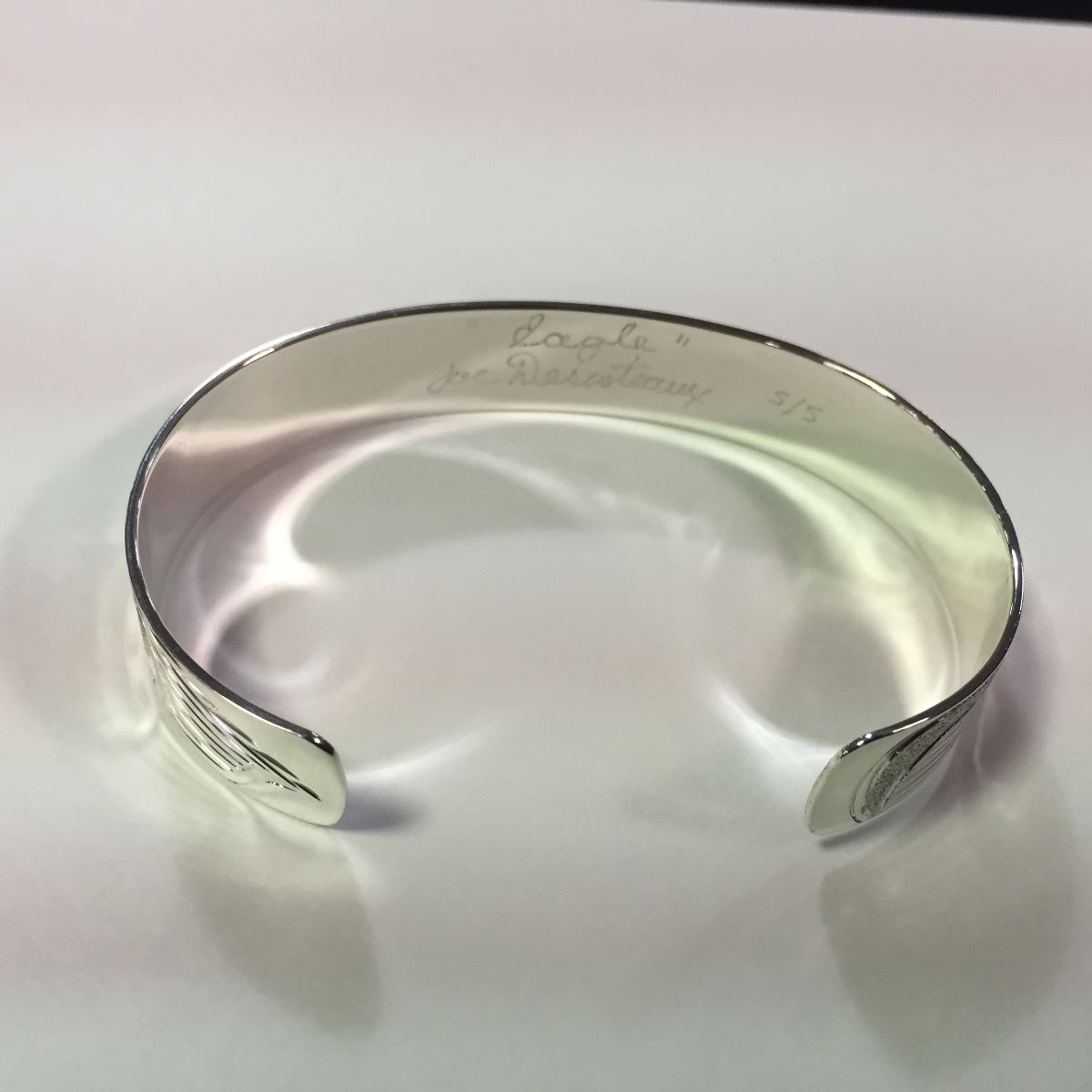 ONE HAND MADE STERLING SILVER FIRST NATIONS 1/2" BANGLE STYLE BRACELET. HAND FORGED BY ARTIST JOE DESCOTEAUX WITH EAGLE DESIGN
