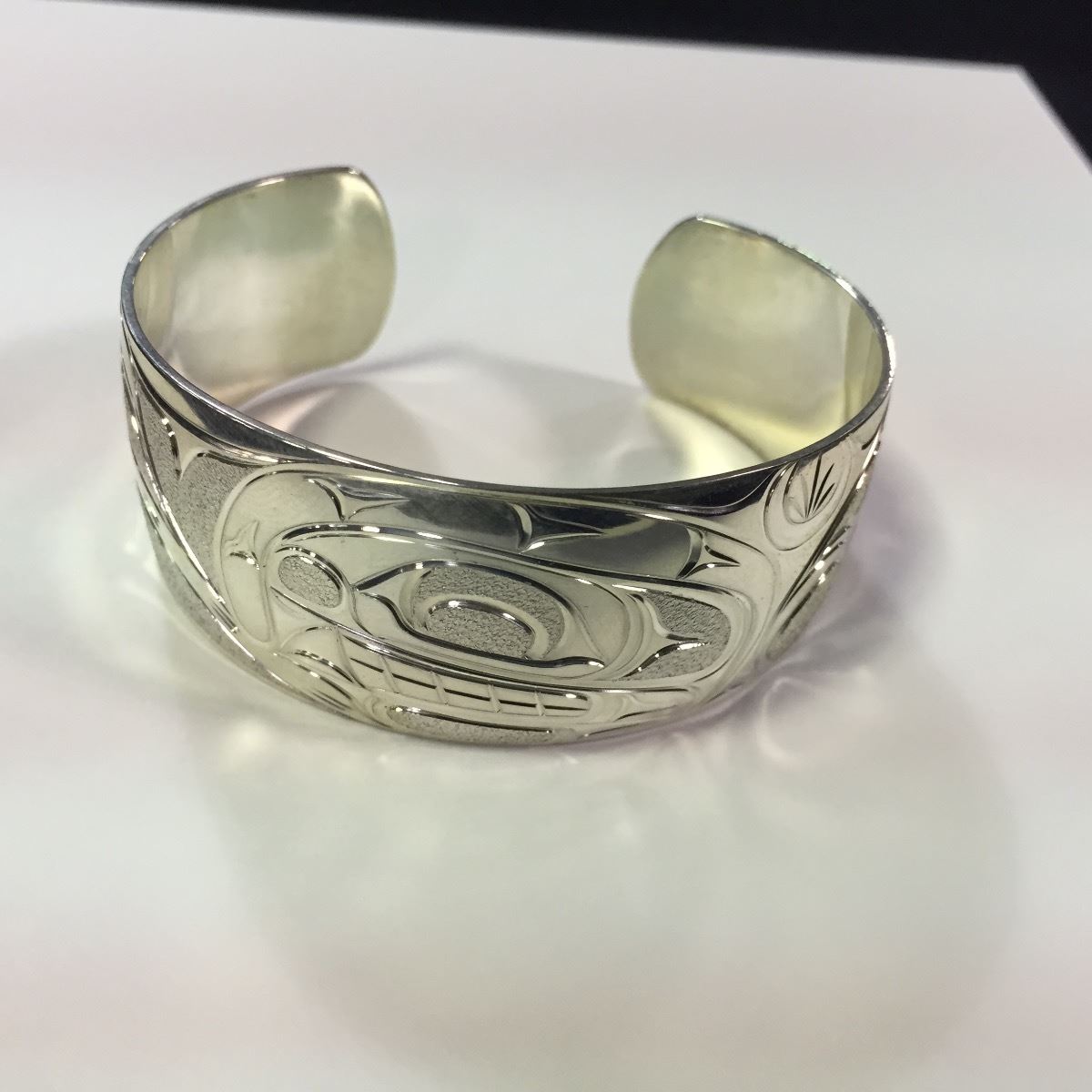 ONE HAND MADE STERLING SILVER FIRST NATIONS 1" BANGLE STYLE BRACELET. HAND FORGED BY ARTIST JOE DESCOTEAUX WITH ORCA DESIGN