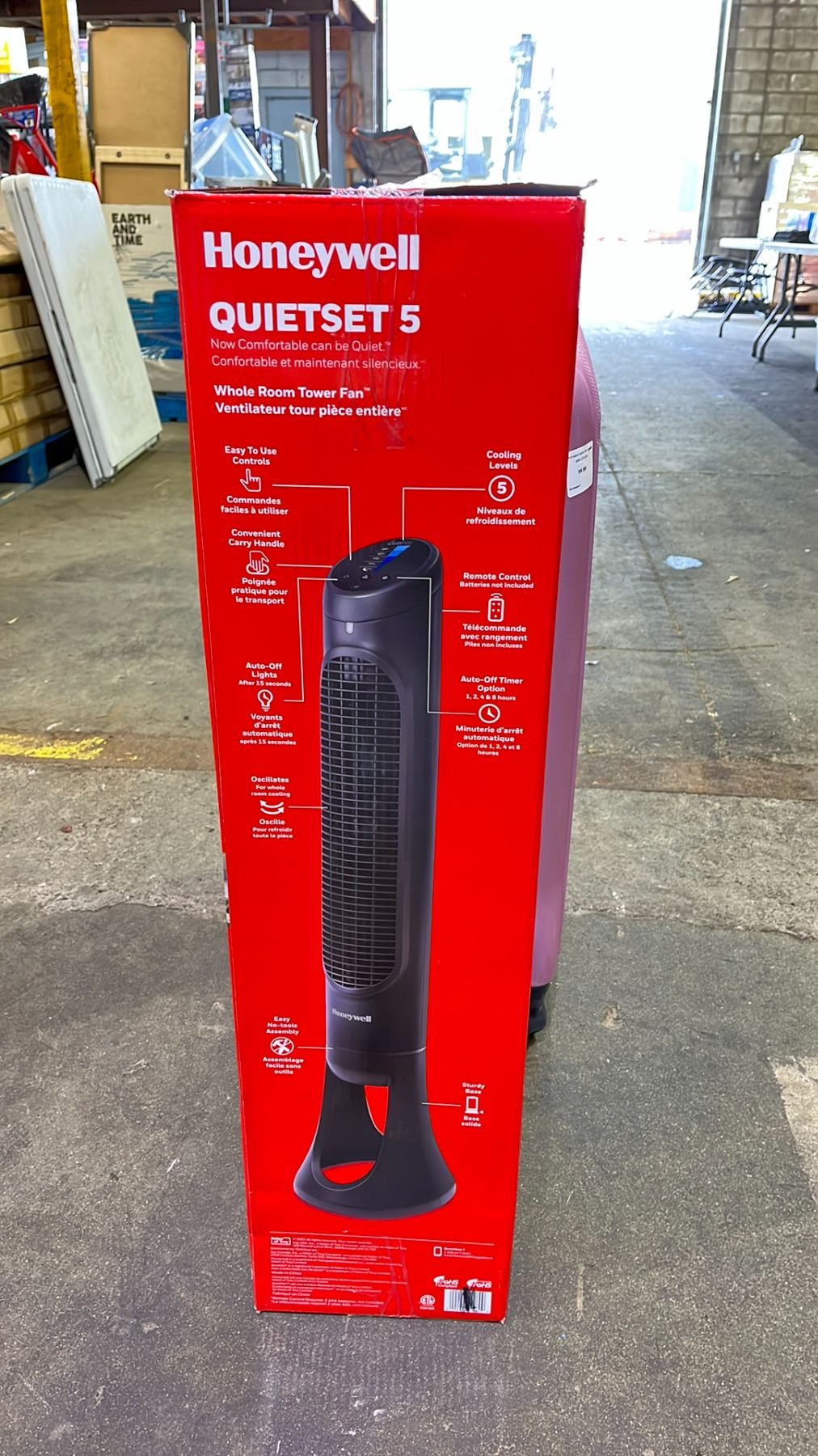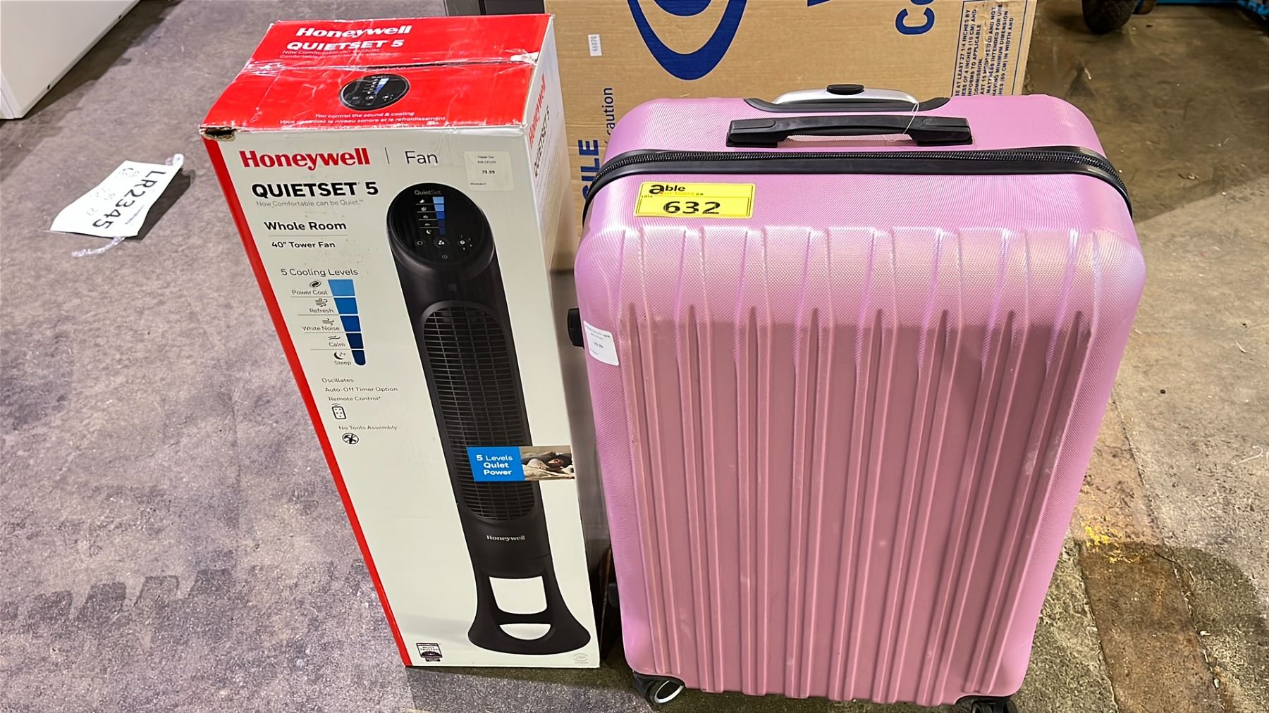 ONE HARD SHELL SUITCASE WITH ROLLING WHEELS AND COMBINATION LOCK COMBINATION UNKNOWN & HONEYWELL QUIET SET FAN 5 40 " TOWER FAN WHOLE ROOM CAPABLITIES