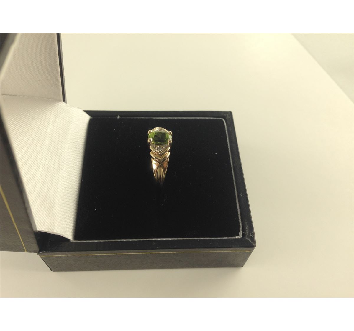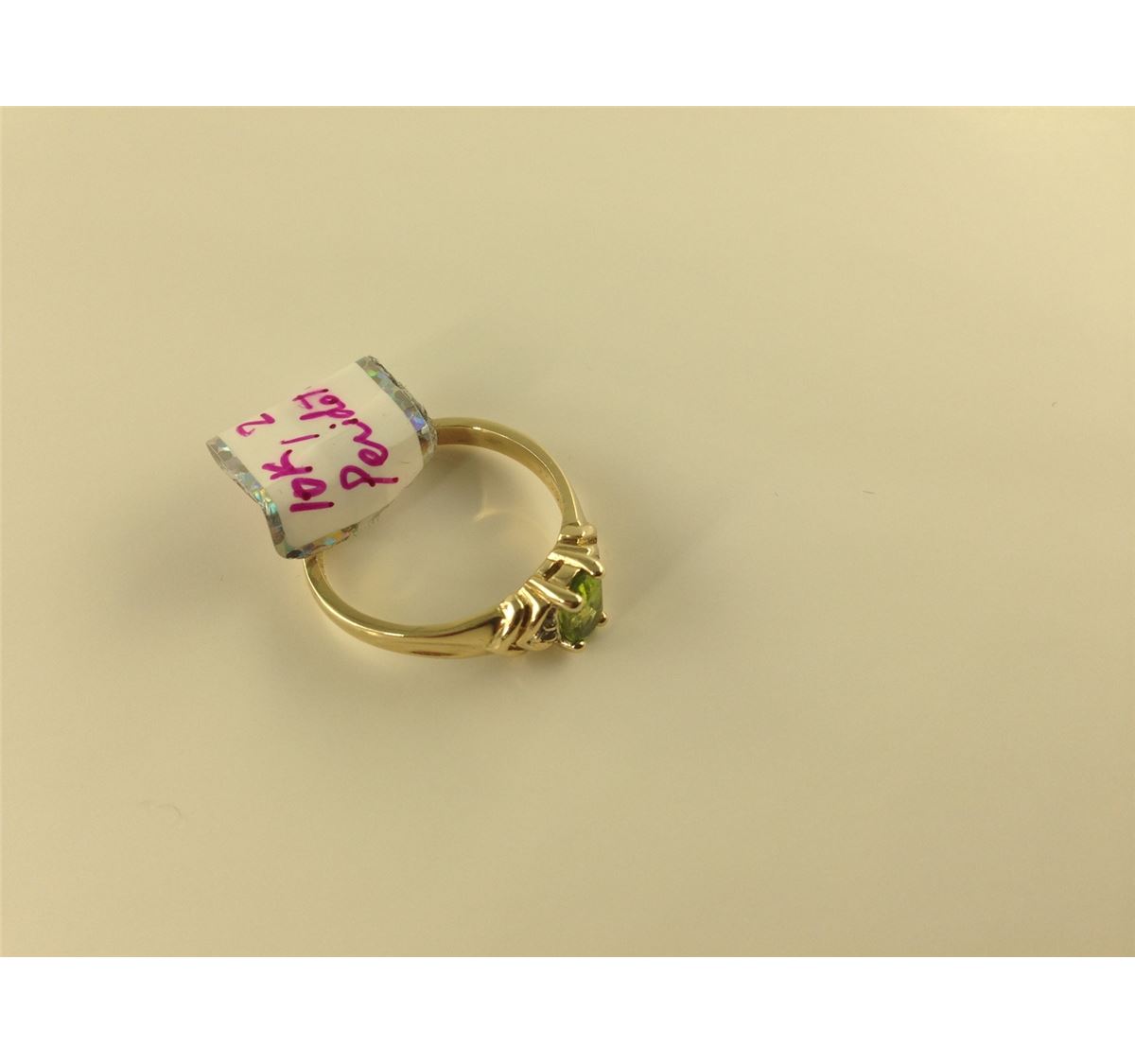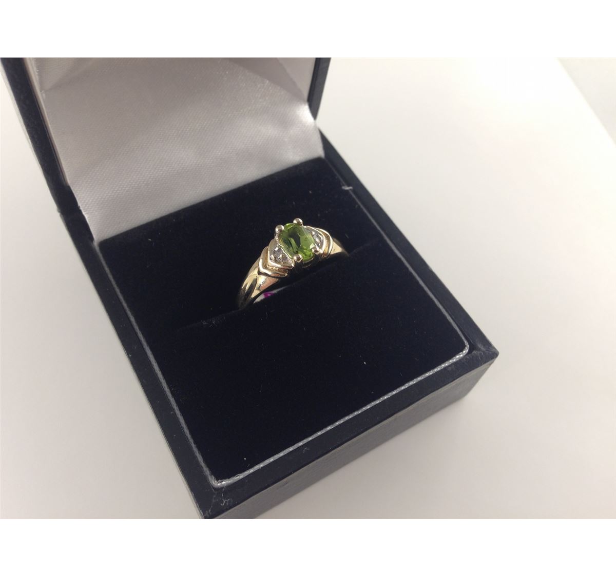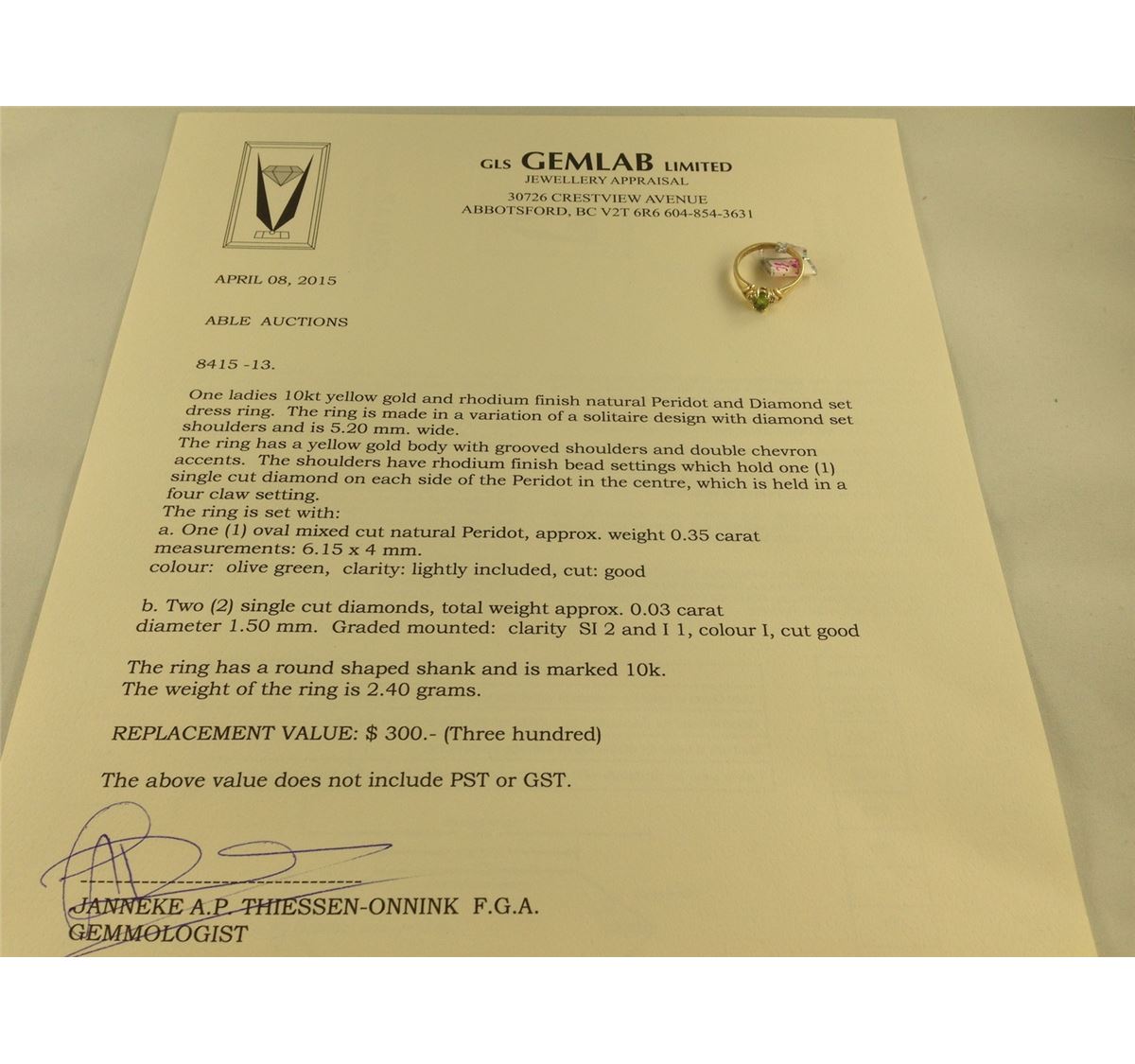 ONE LADIES 10KT YELLOW GOLD AND RHODIUM FINISH NATURAL PERIDOT AND DIAMOND SET DRESS RING. SET WITH ONE OVAL MIXED CUT NATURAL PERIDOT APPROX. 0.35CT AND 2 SINGLE CUT DIAMONDS APPROX. 0.03CT GEMMOLOGIST APPRAISAL $300