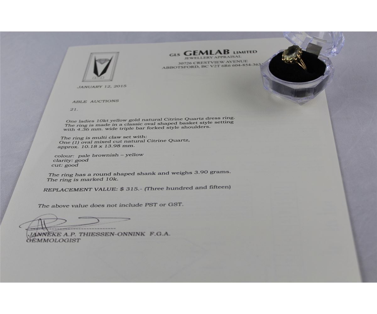 ONE LADIES 10KT YELLOW GOLD NATURAL CITRINE QUARTZ DRESS RING MULTI-CLAW SET WITH 1 OVAL MIXED CUT NATURAL CITRINE QUARTZ. REPLACEMENT VALUE: $315.00