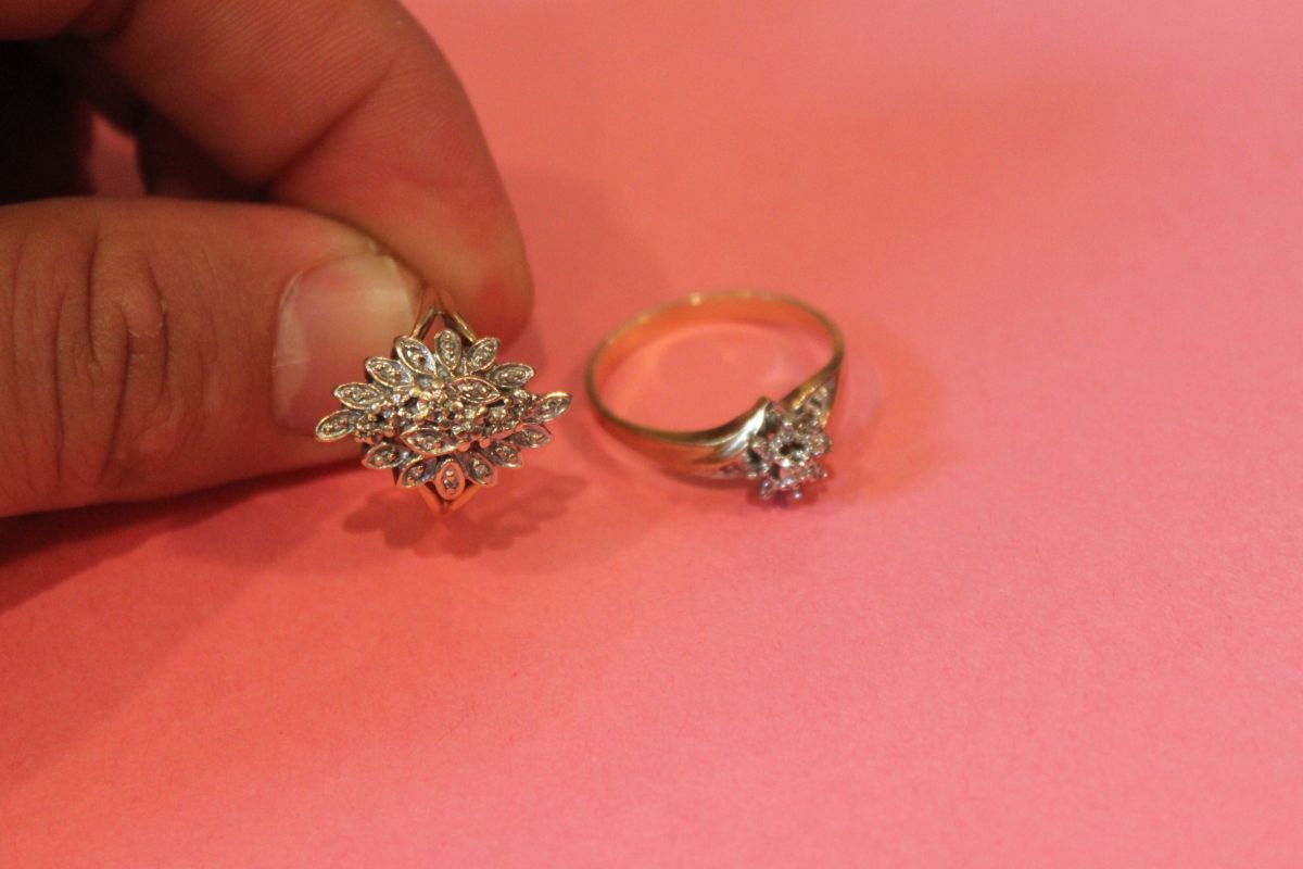 with one (1) single cut diamond on each side of the cluster centre.