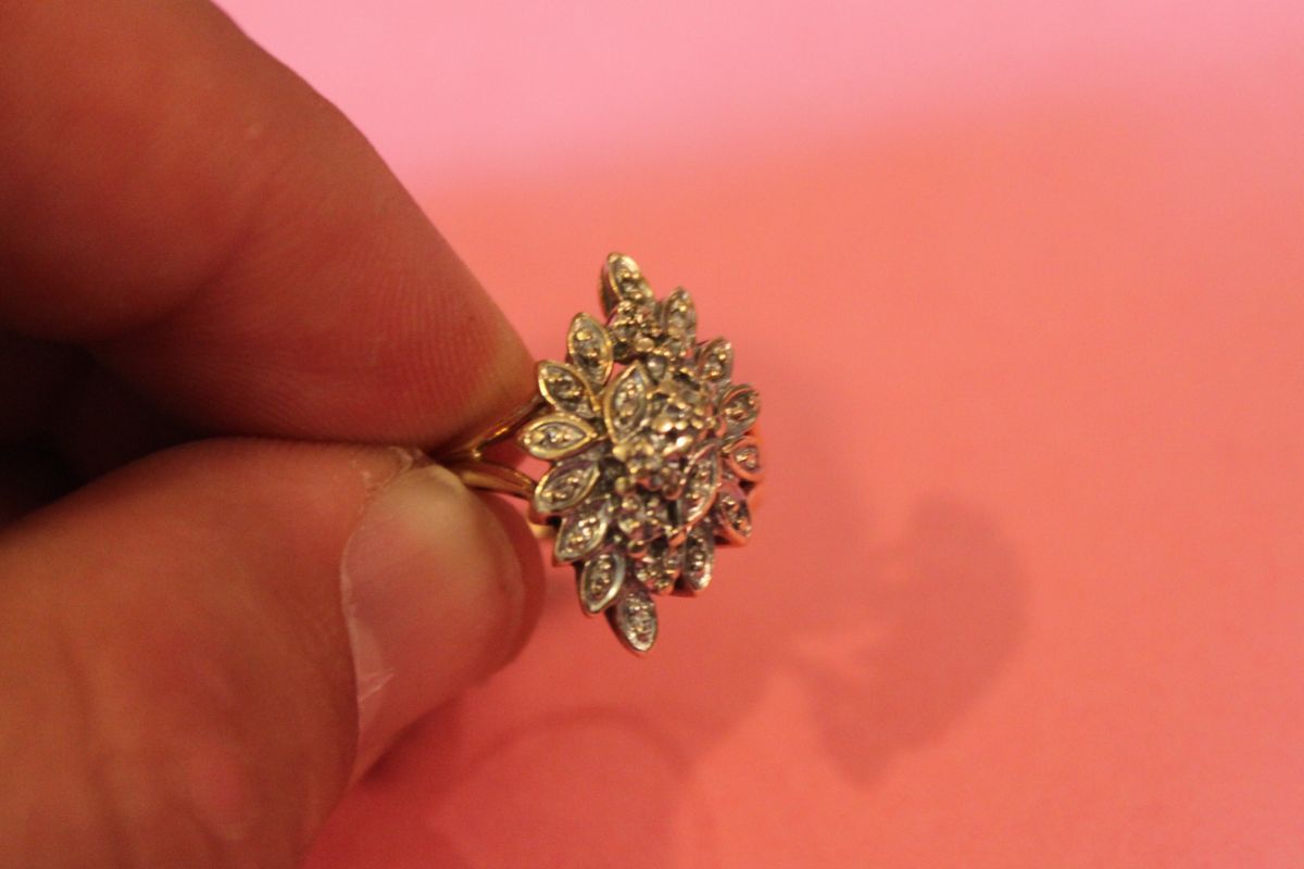 One ladies 10kt yellow gold and rhodium finish Diamond set dress ring.