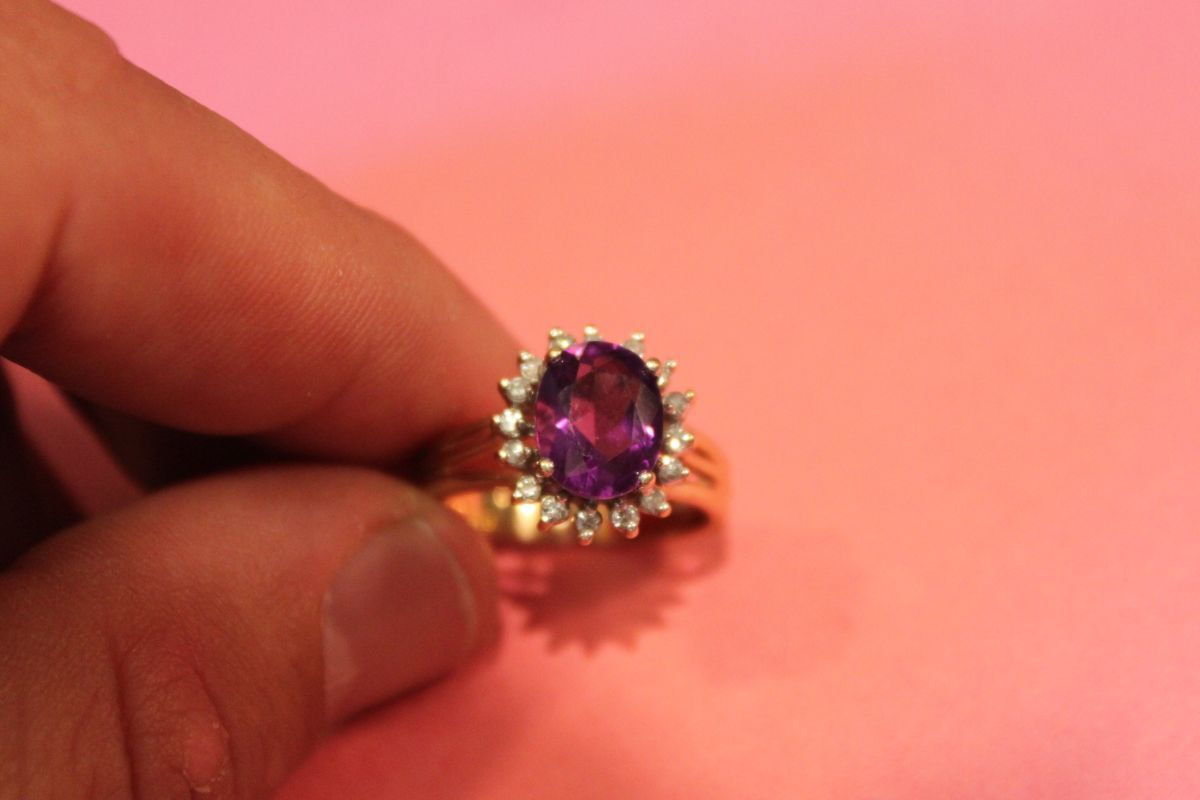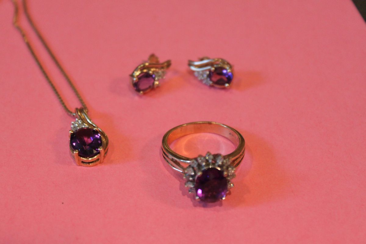 ONE LADIES 10KT YELLOW GOLD & RHODIUM FINISH NATURAL AMETHYST & DIAMOND SET DRESS RING - AV$850, ONE 10KT YELLOW GOLD BOX LINK CHAIN - AV$680, ONE PAIR OF 10KT YELLOW GOLD & RHODIUM FINISH NATURAL AMETHYST & DIAMOND EARRINGS - AV $450