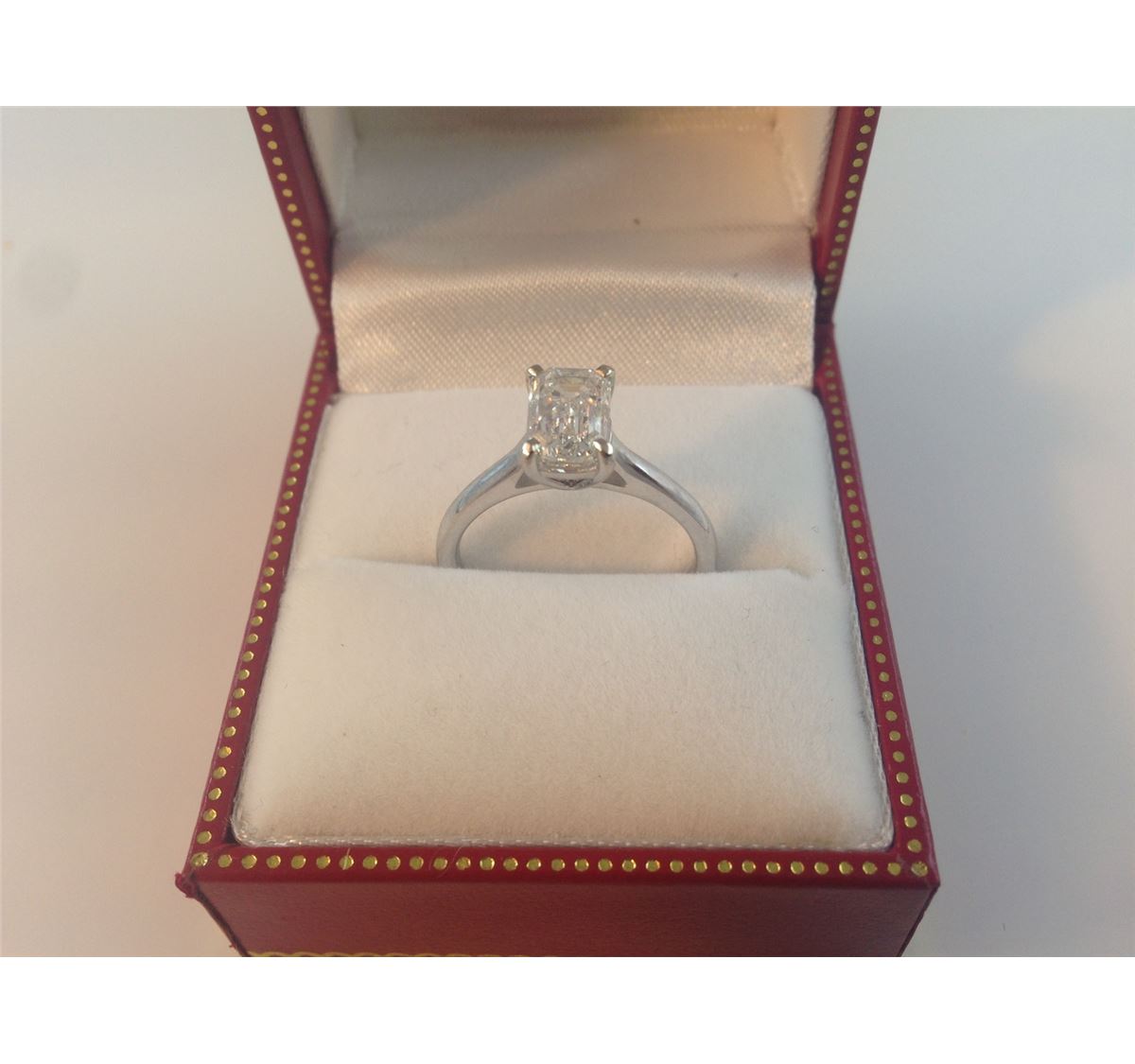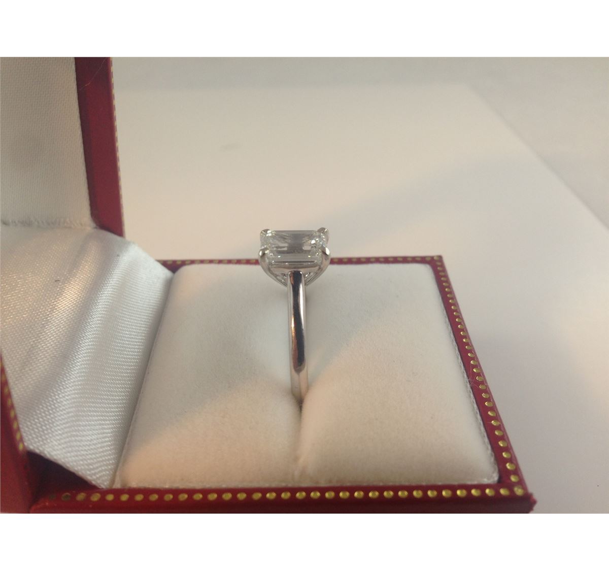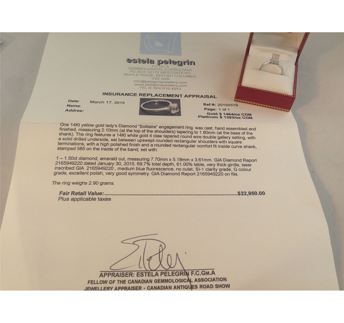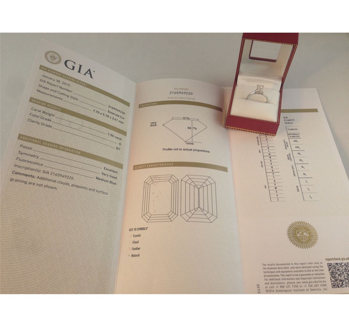 ONE LADIES 14K WHITE GOLD DIAMOND ENGAGEMENT RING SET WITH ONE-1.50CT EMERALD CUT DIAMOND GIA DIAMOND REPORT #2165949220 SI-1, G REPLACEMENT VALUE:$22,950