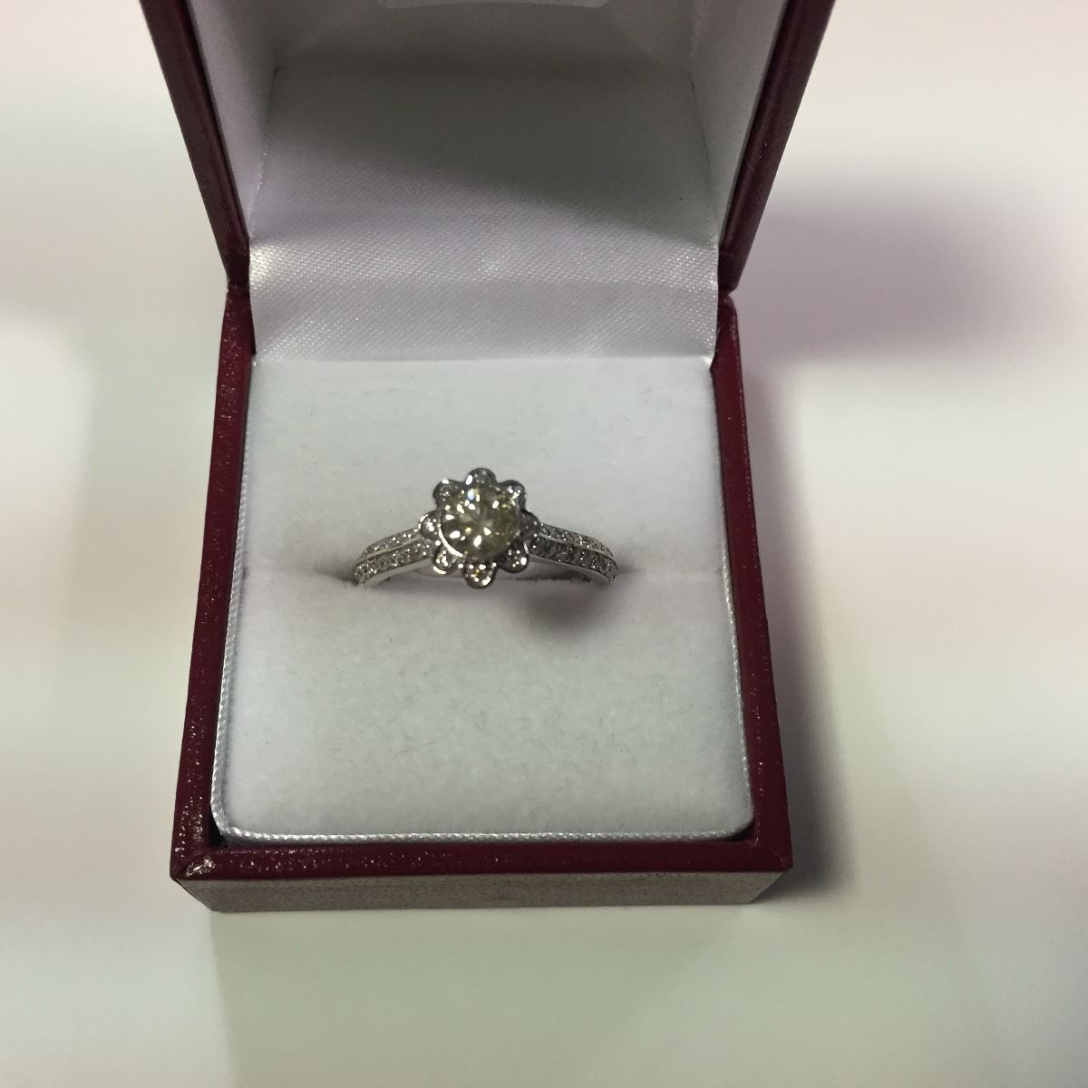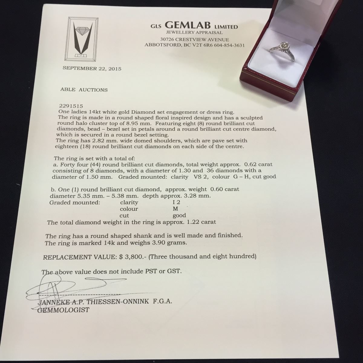 ONE LADIES 14KT WHITE GOLD DIAMOND SET ENGAGEMENT OR DRESS RING. ROUND SHAPED FLORAL INSPIRED DESIGN. 44 ROUND BRILLIANT CUT DIAMONDS APPROX .62CARAT 1 ROUND BRILLIANT CUT DIAMOND APPROX .60CARAT WEIGHT APPROX 3.90GRAMS REPLACEMENT VALUE $3800