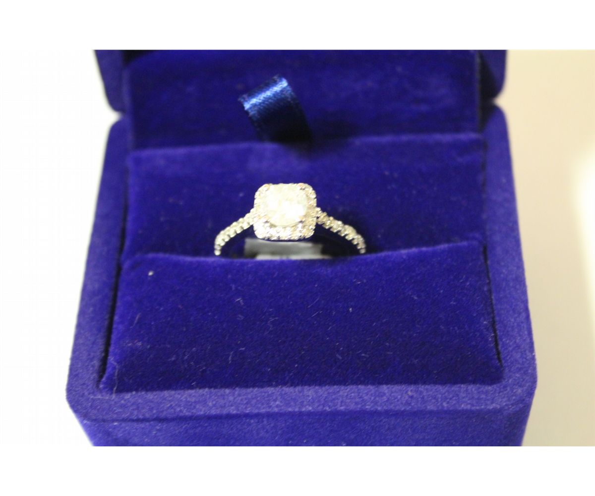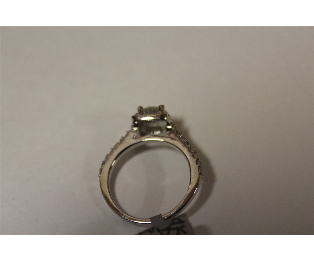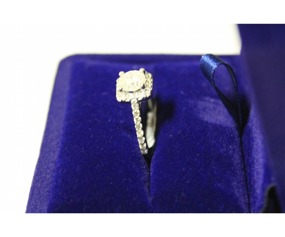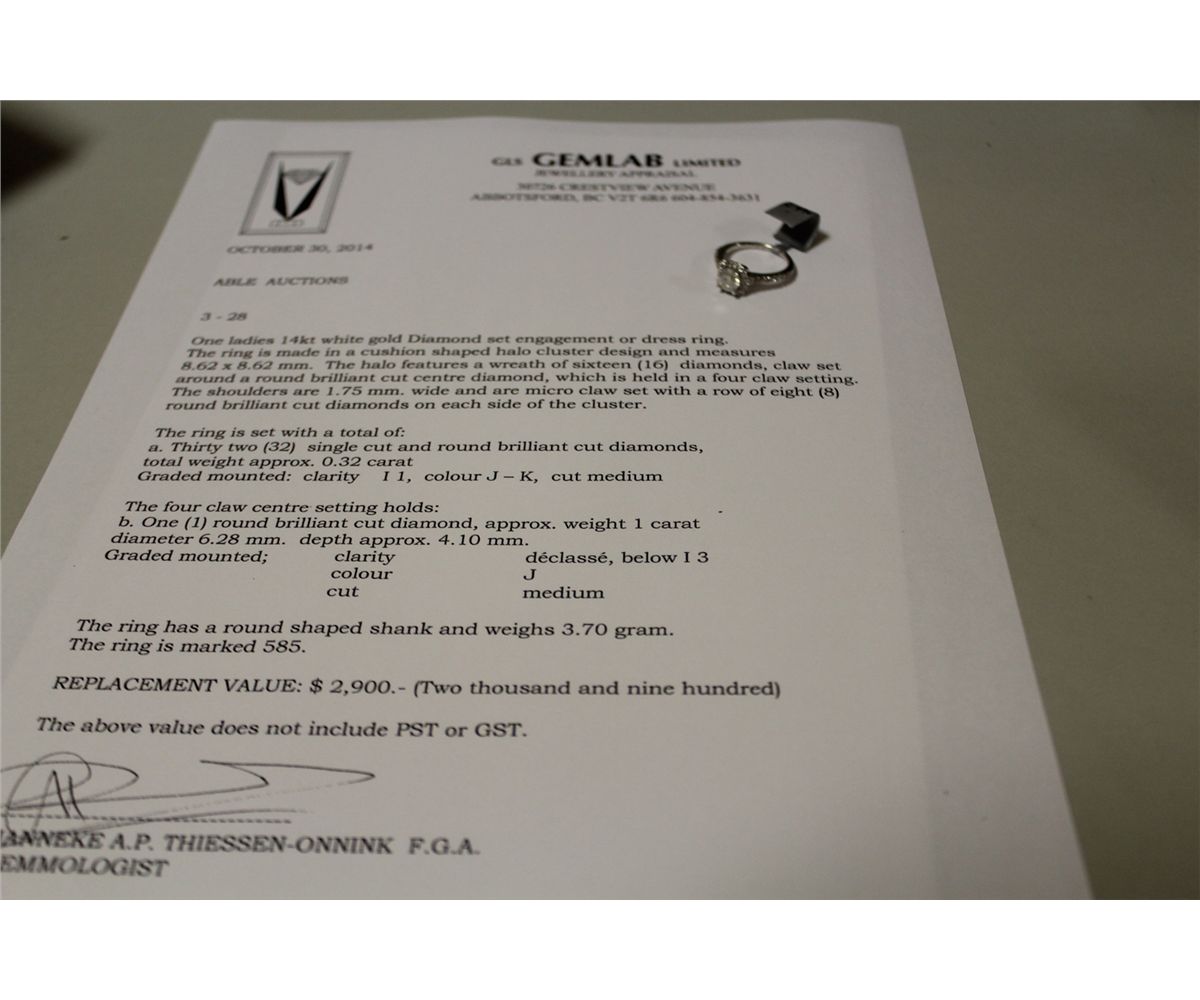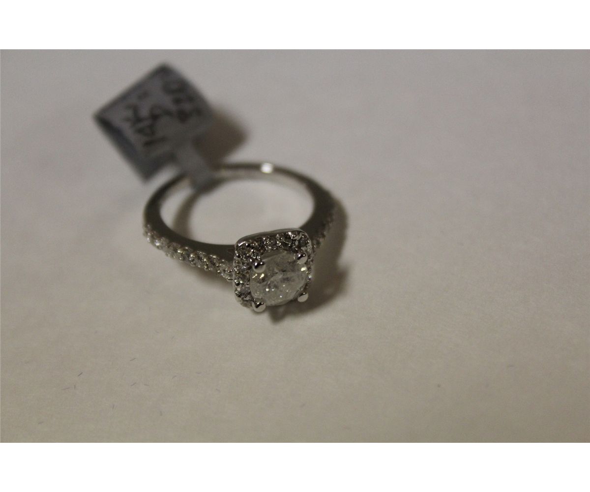 ONE LADIES 14KT WHITE GOLD DIAMOND SET ENGAGEMENT OR DRESS RING. SET WITH 32 SINGLE CUT AND ROUND BRILLIANT CUT DIAMONDS APPROX 0.32CARAT AND CENTRE SETTING HOLDS ONE ROUND BRILLIANT CUT DIAMOND APPROX WEIGHT 1CARAT. REPLACEMENT VALUE $2900.00