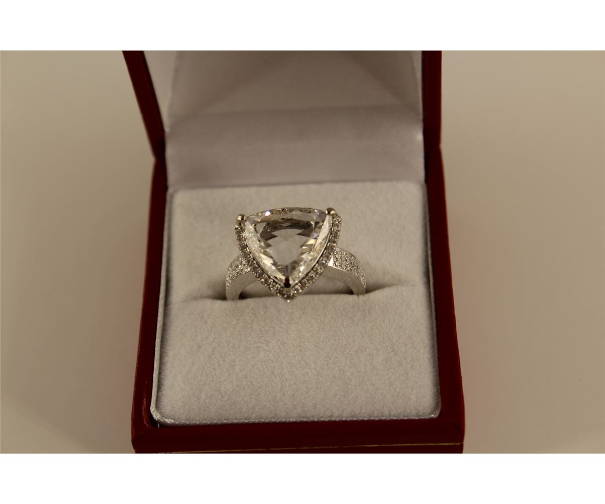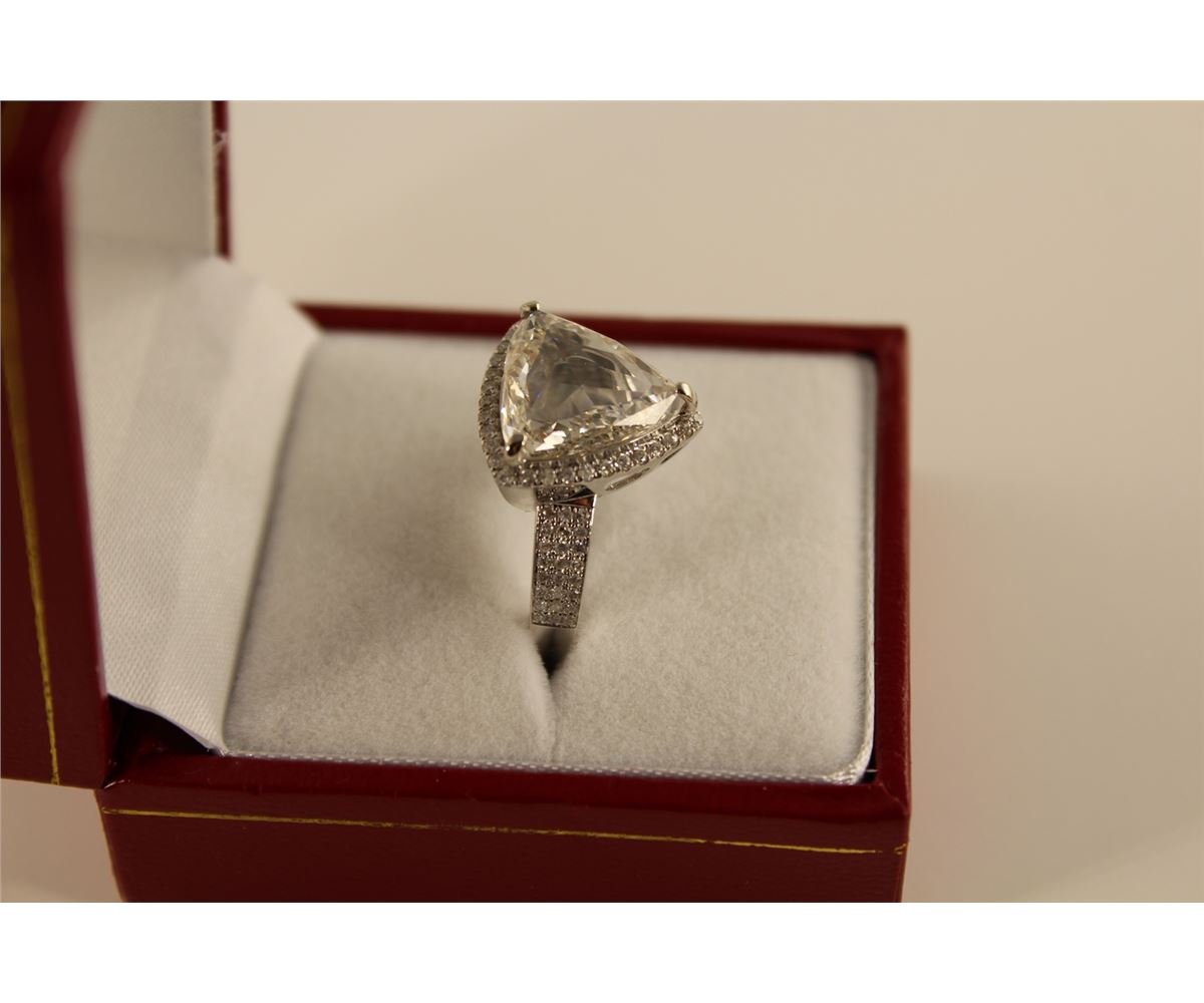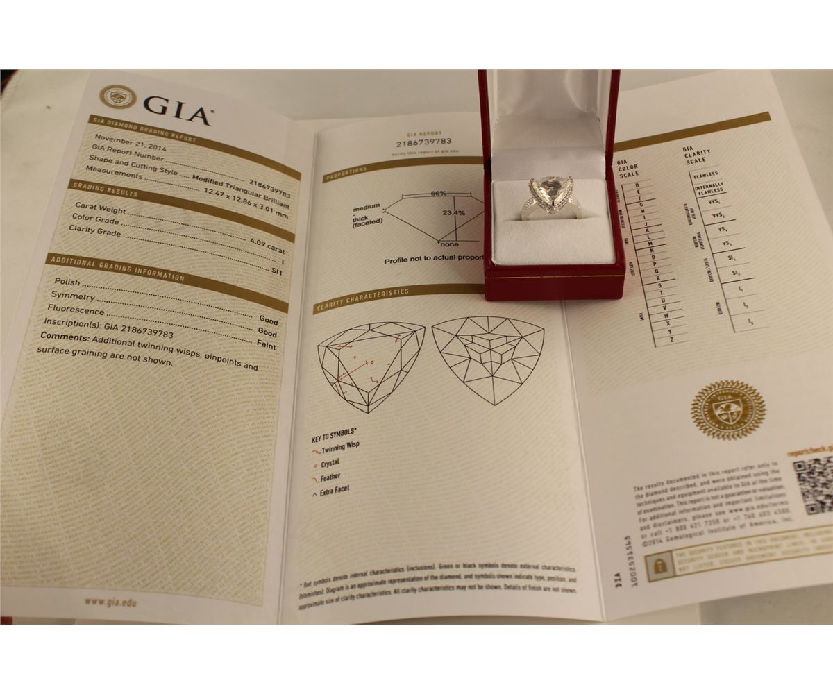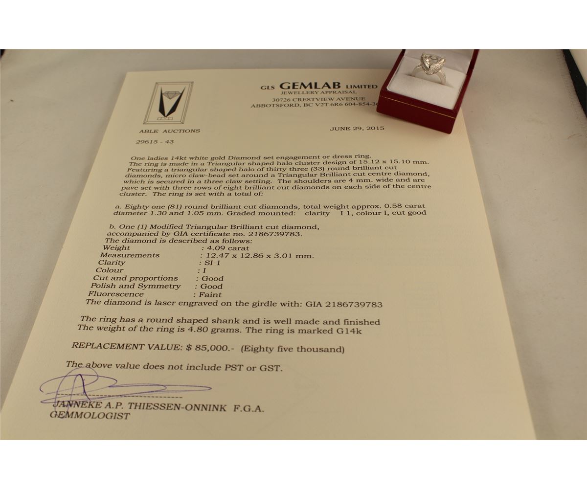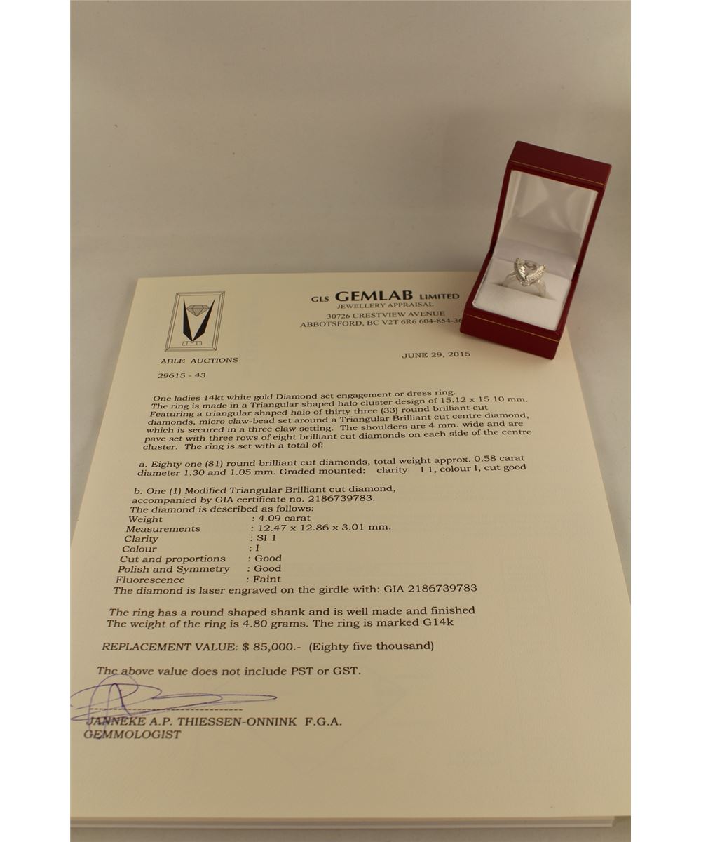 ONE LADIES 14KT WHITE GOLD DIAMOND SET ENGAGEMENT RING. MADE IN A TRIANGULAR SHAPED HALO CLUSTER, SET WITH ONE MODIFIED TRIANGULAR BRILLIANT CUT DIAMOND GIA CERTIFICATE #2186739783 4.09CT, SI 1, I COLOUR AND 81 ROUND BRILLIANT CUT DIAMONDS 0.58CT, REPLACEMENT VALUE $85,000