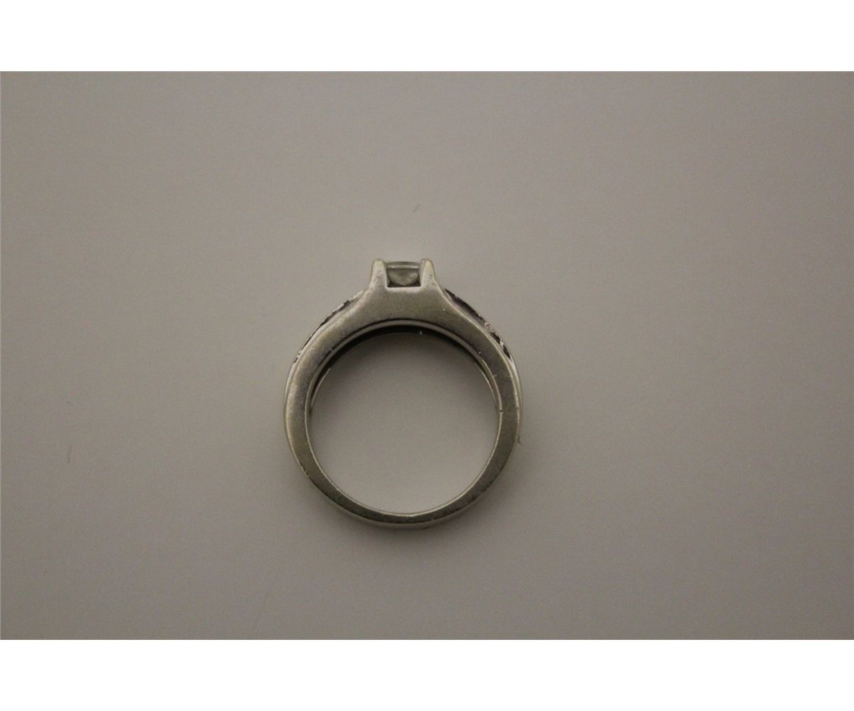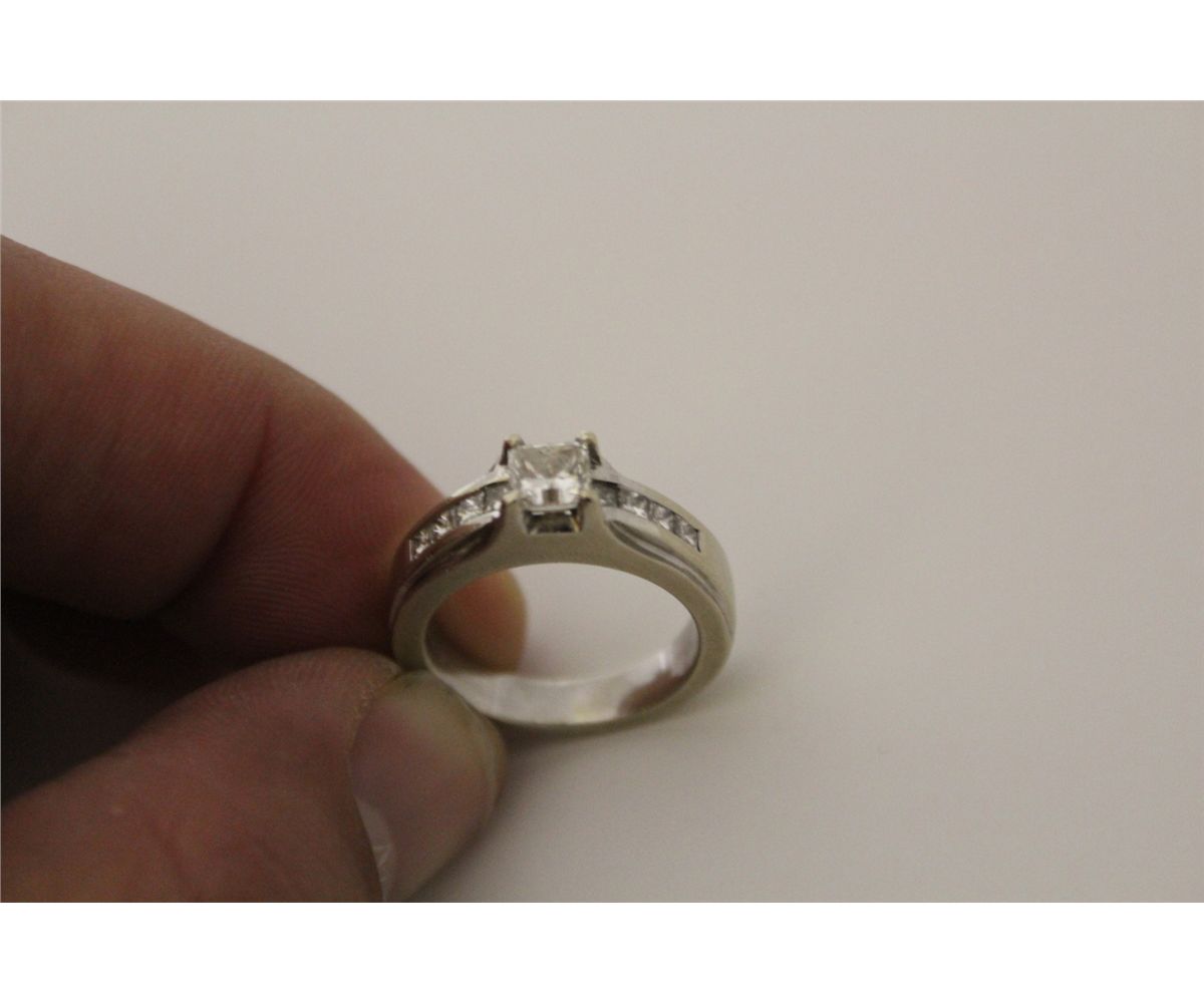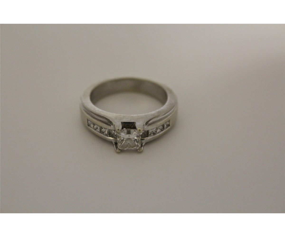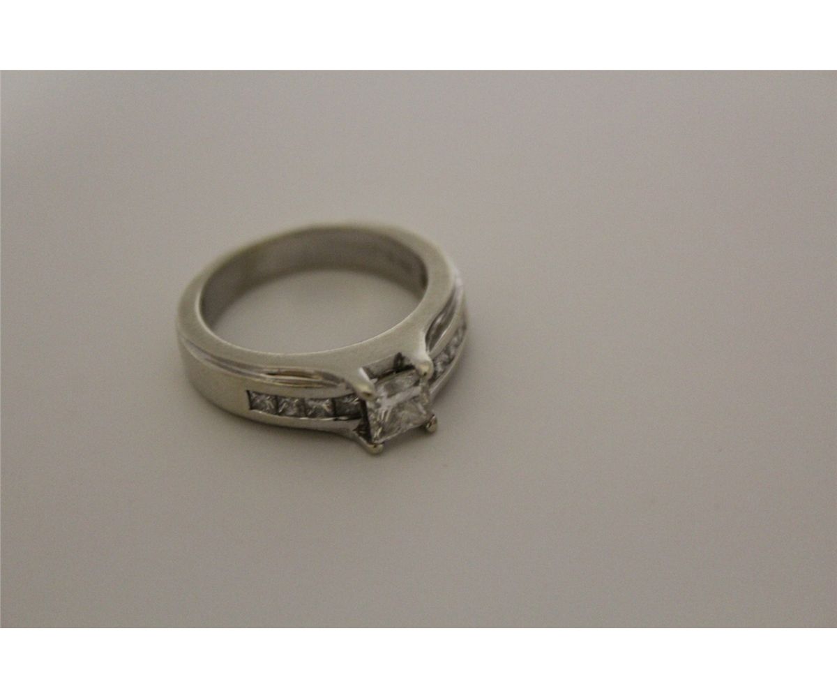 ONE LADIES 14KT WHITE GOLD DIAMOND SET ENGAGMENT OR DRESS RING. THE RING IS 6MM WIDE AND FEATURES A PRINCESS CUT CENTRE DIAMOND, FLANKED BY 4 CHANNEL SET PRINCESS CUT DIAMONDS ON EACH SIDE. THE CENTRE STONE IS APPROX. 0.77 CARATS, VS2, H-I, GOOD CUT. THE EIGHT (8) CHANNEL SET PRINCESS CUT DIAMONDS TOTAL WEIGHT, 0.50 CARATS. THE TOTAL DIAMOND WEIGHT IS APPOX. 1.27 CARATS. THE WEIGHT IS 7.20 GRAM AND IS WELL MADE AND FINISHED. INCLUDES GEMOLOGIST APPRAISAL WITH REPLACEMENT VALUE OF $7,400