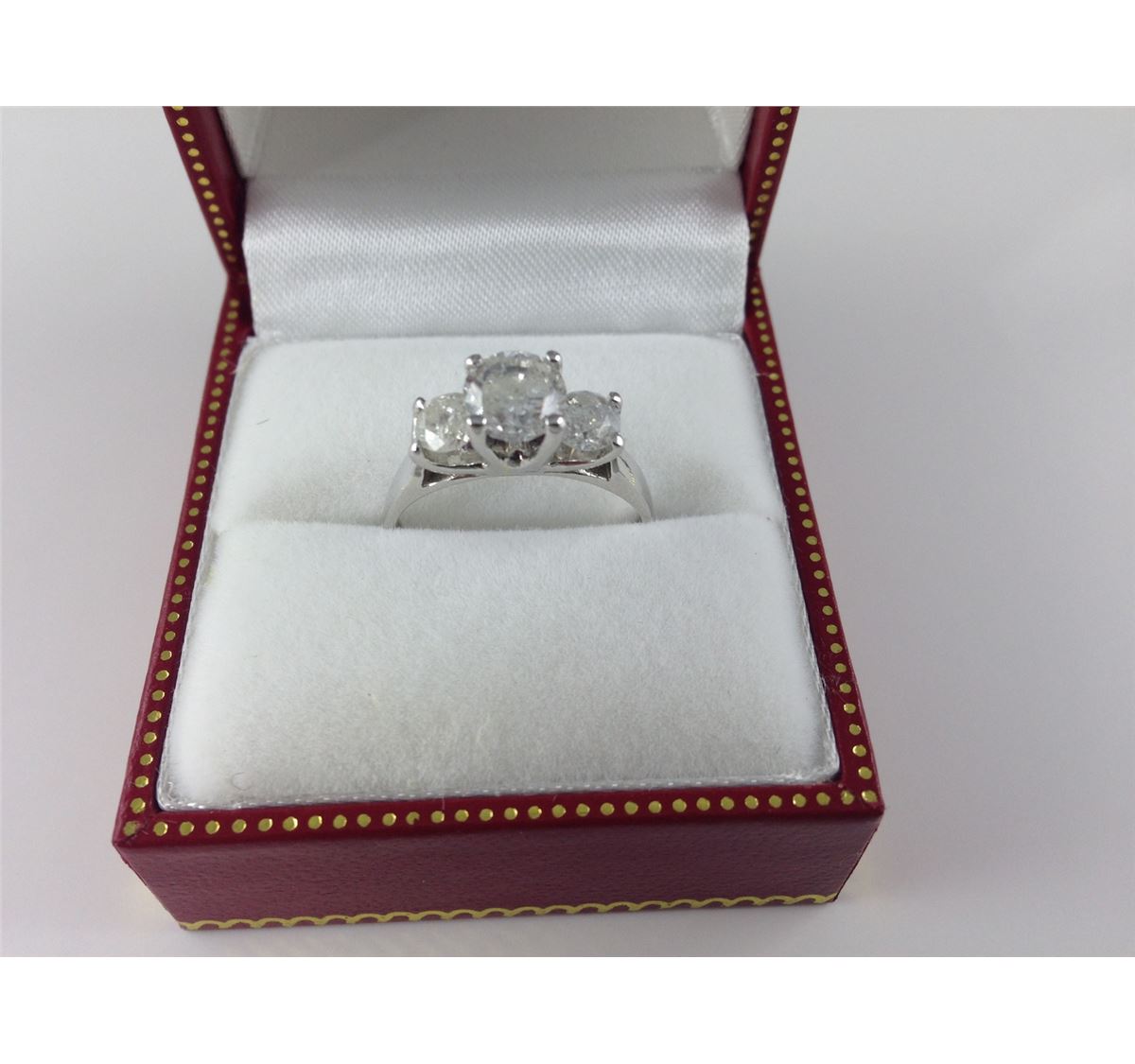 ONE LADIES 14KT WHITE GOLD DIAMOND SET TRINITY DRESS OR ENGAGEMENT RING. SET WITH ONE ROUND BRILLIANT CUT DIAMOND APPROX. 1.05 CARAT, I2-I3, I-J COLOUR AND TWO ROUND BRILLIANT CUT DIAMONDS APPROX. 0.65 CARAT I2-I3, I-J COLOUR. REPLACEMENT VALUE OF $5400