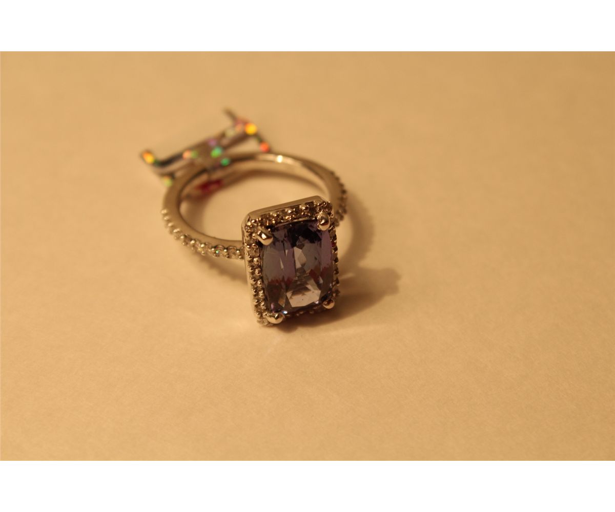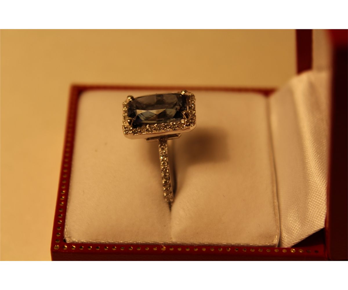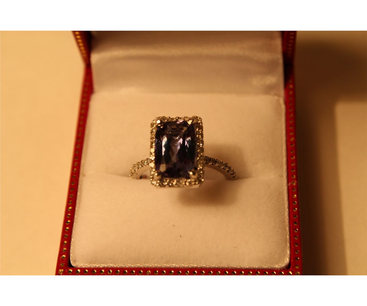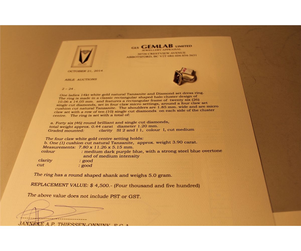 ONE LADIES 14KT WHITE GOLD NATURAL TANZANITE AND DIAMOND SET DRESS RING SET WITH 46 ROUND BRILLIANT AND SINGLE CUT DIAMONDS APPROX. 0.44 CARATS, 1 CUSHION CUT NATURAL TANZANITE APPROX. 3.90 CARATS. REPLACEMENT VALUE: $4500.00