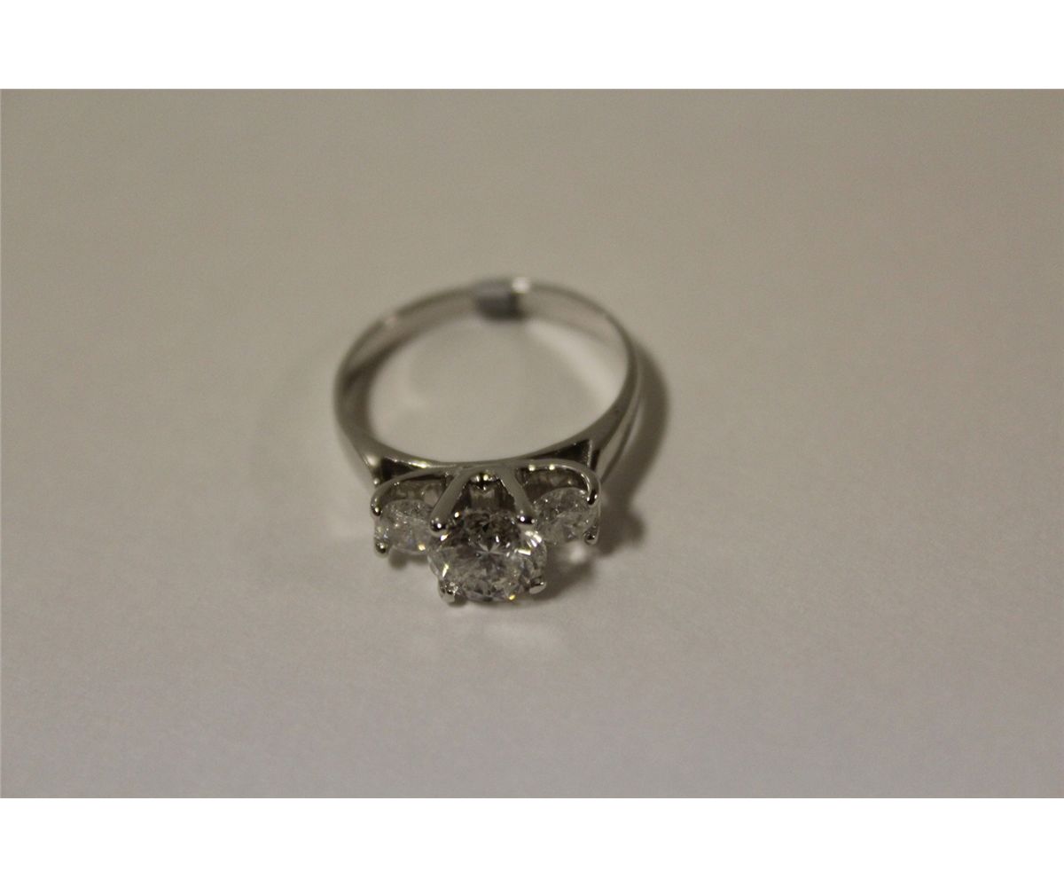 ONE LADIES 14KT WHITE GOLD TRINITY DESIGN DIAMOND SET ENGAGEMENT RING OR DRESS RING. THE TOTAL WEIGHT OF THE RING IS 1.79 CARAT, WEIGHT 3.5 GRAM AND MARKED 585. INCL. GEMMOLOGIST APPRAISAL OF $6700