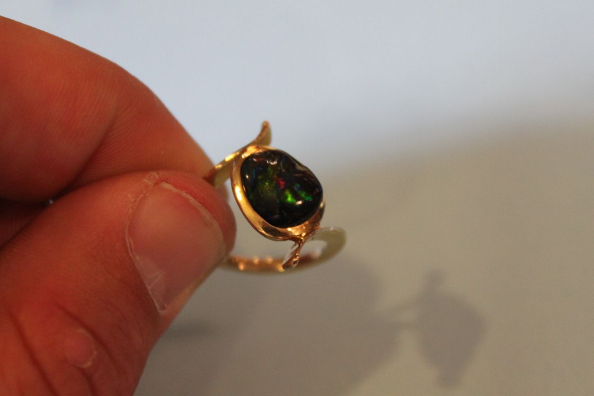 One ladies 14kt yellow gold Ammolite (Korite) dress ring.