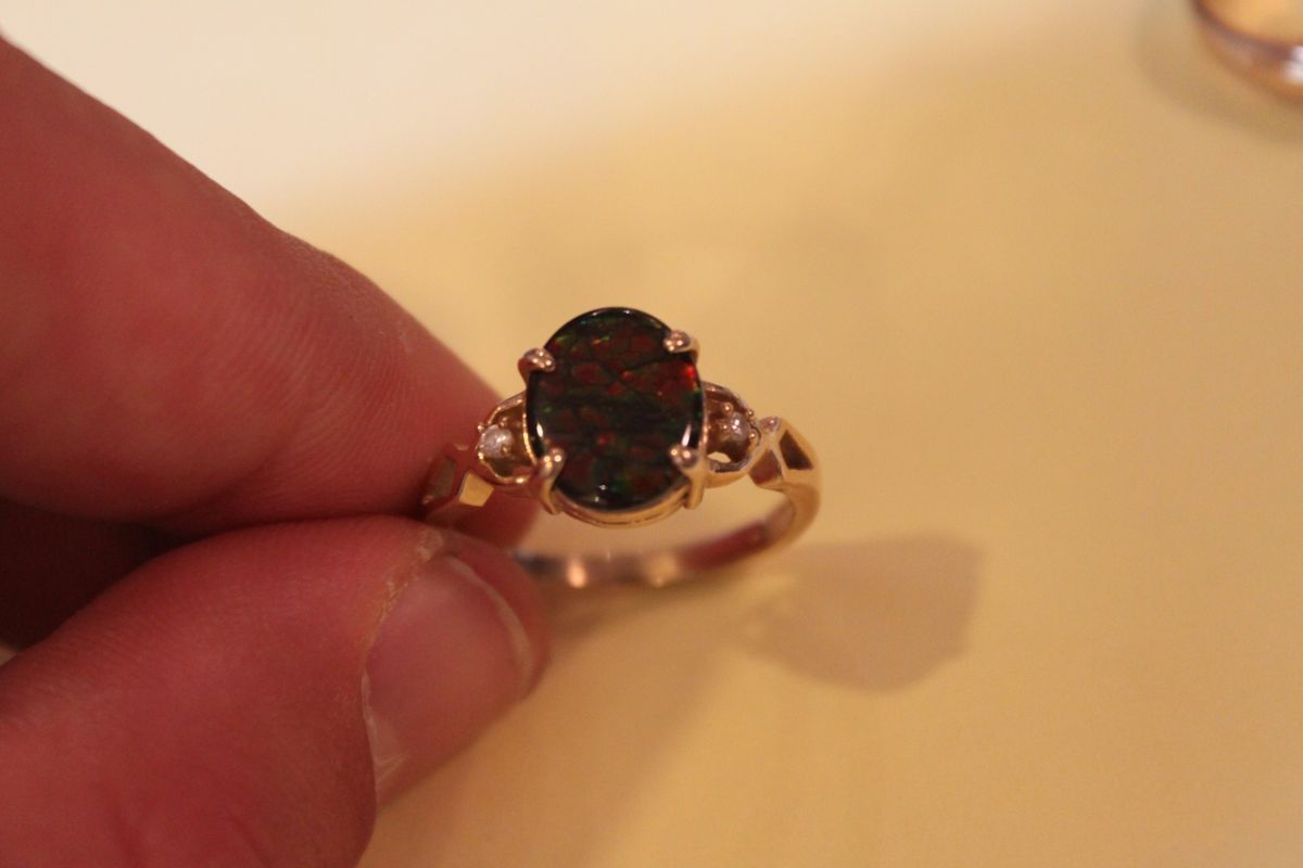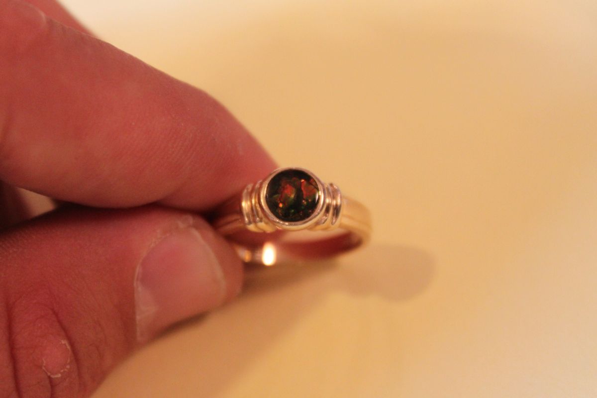 One ladies 14kt yellow gold Ammolite  (Korite) dress ring.