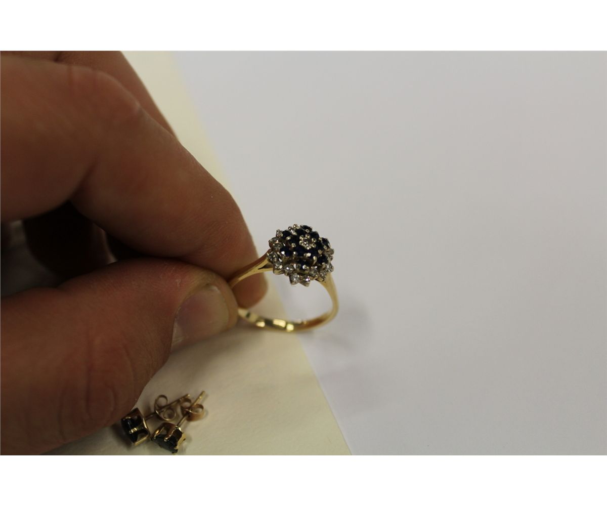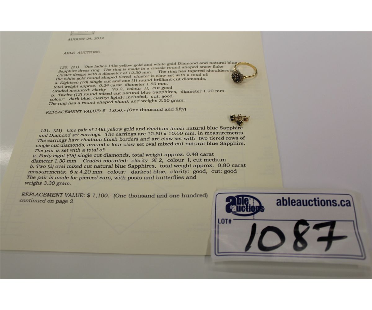 ONE LADIES 14KT YELLOW GOLD AND WHITE GOLD DIAMOND AND NATURAL BLUE SAPPHIRE DRESS RING. REPLACEMENT VALUE $1,050 PLUS ONE PAIR OF 14KT YELLOW GOLD AND RHODIUM FINISH NATURAL BLUE SAPPHIRE AND DIAMOND SET EARRINGS REPLACEMENT VALUE $1,100 INCLUDES PROFESSIONAL APPRAISAL