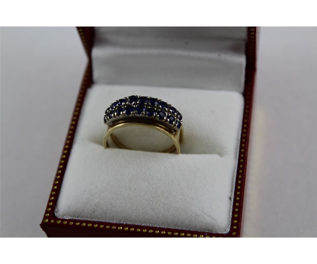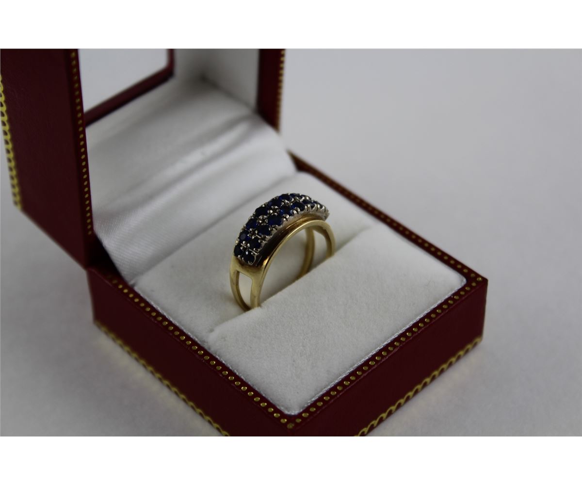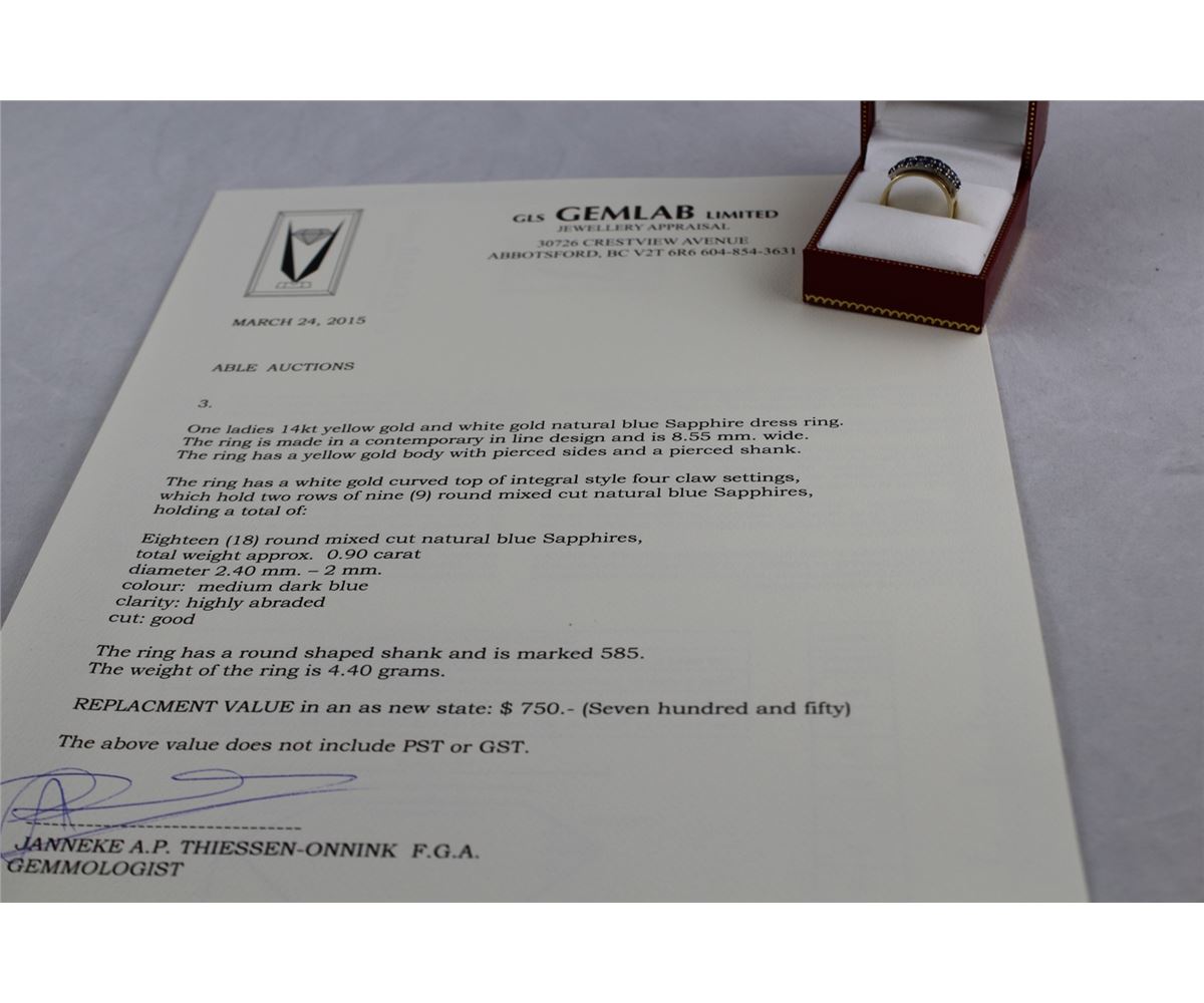 ONE LADIES 14KT YELLOW GOLD AND WHITE GOLD NATURAL BLUE SAPPHIRE DRESS RING. SET WITH 18 ROUND MIXED CUT NATURAL BLUE SAPPHIRES TOTAL WEIGHT APPROX. 0.90CT REPLACEMENT VALUE $750
