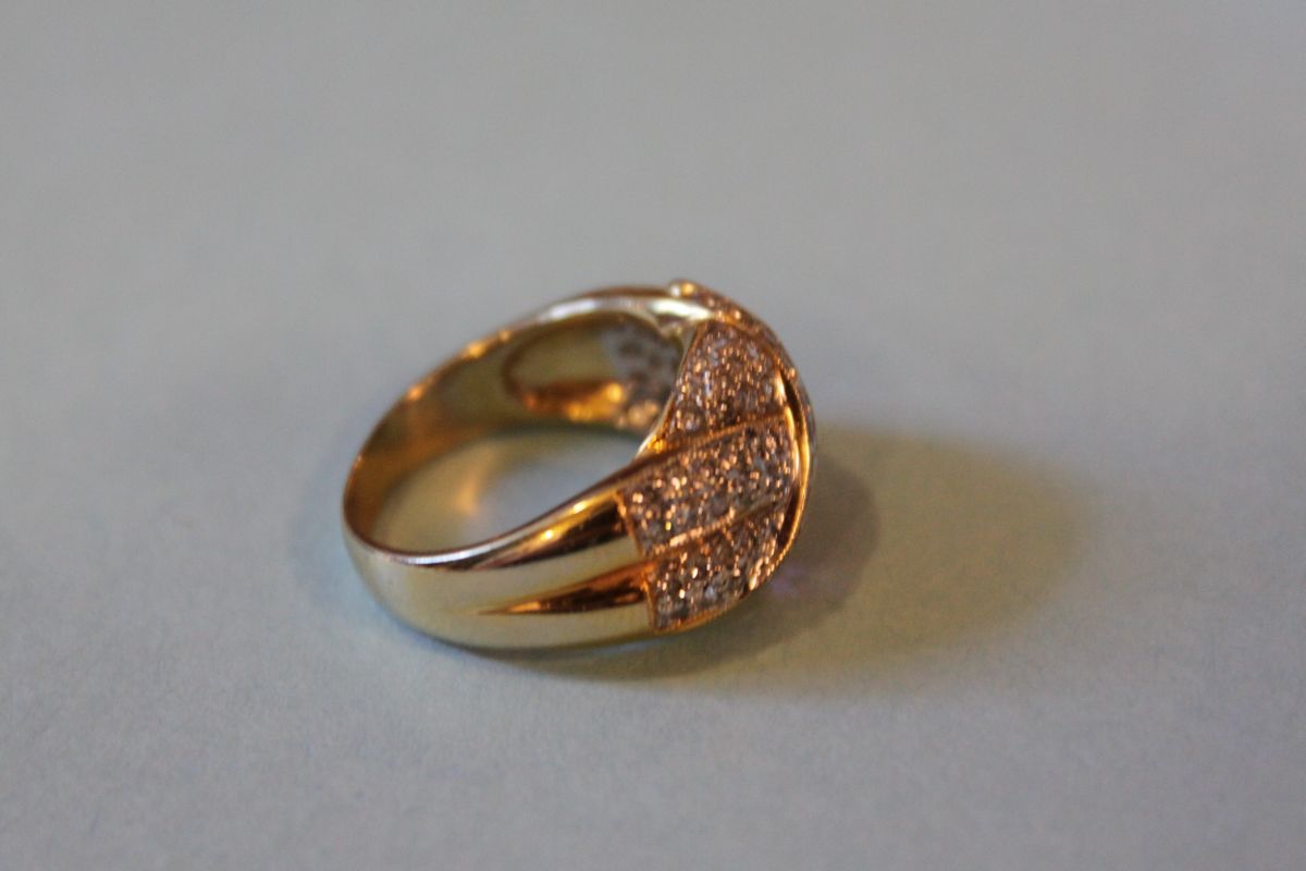 Diamond set dress ring.  The ring is made in a bold and Art Deco inspired pave set design and is 12.50 mm wide.  The ring has a yellow gold body with rhodium finish surfaces, accented by mille grain border. The ring is pave set with a total of:
