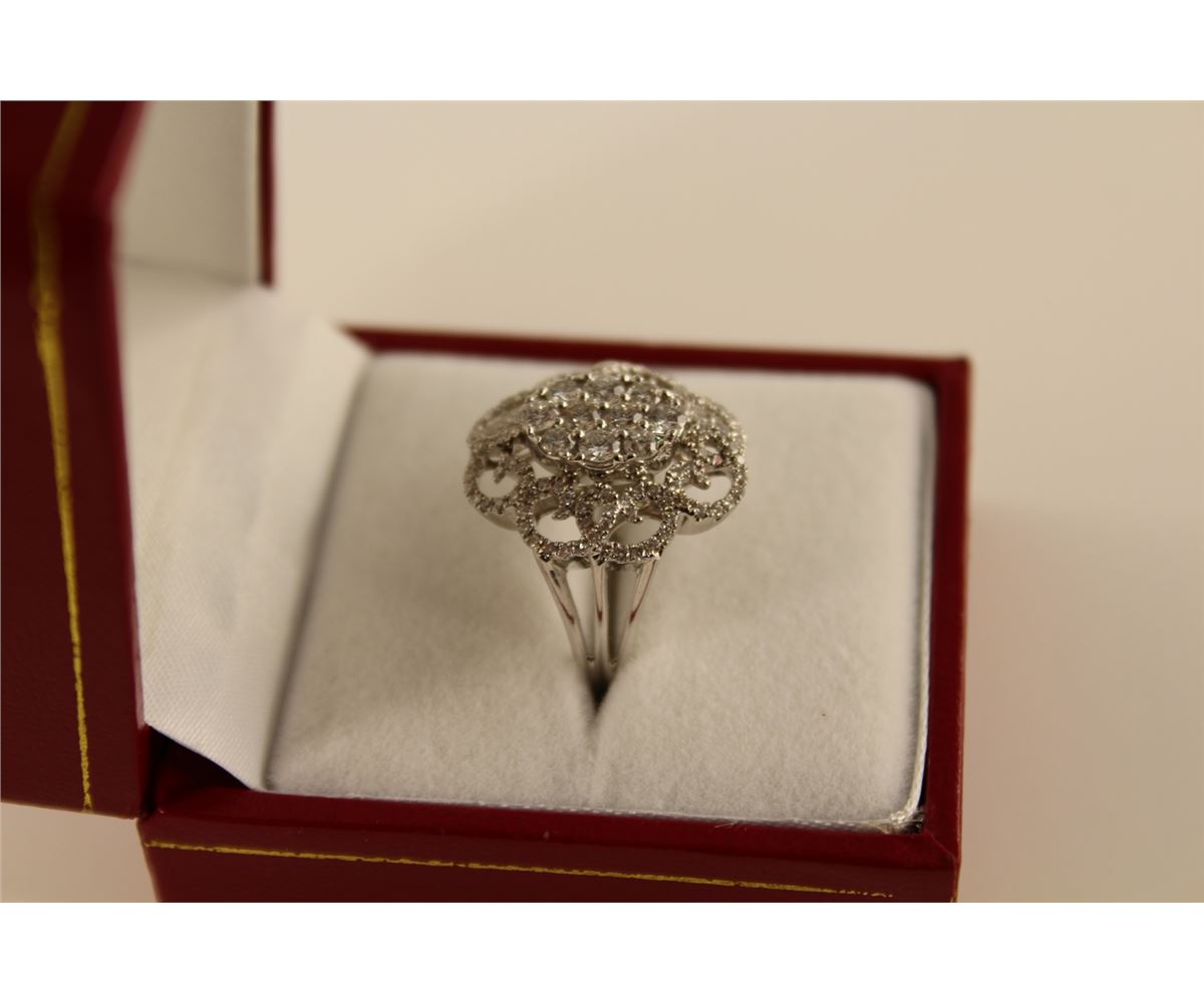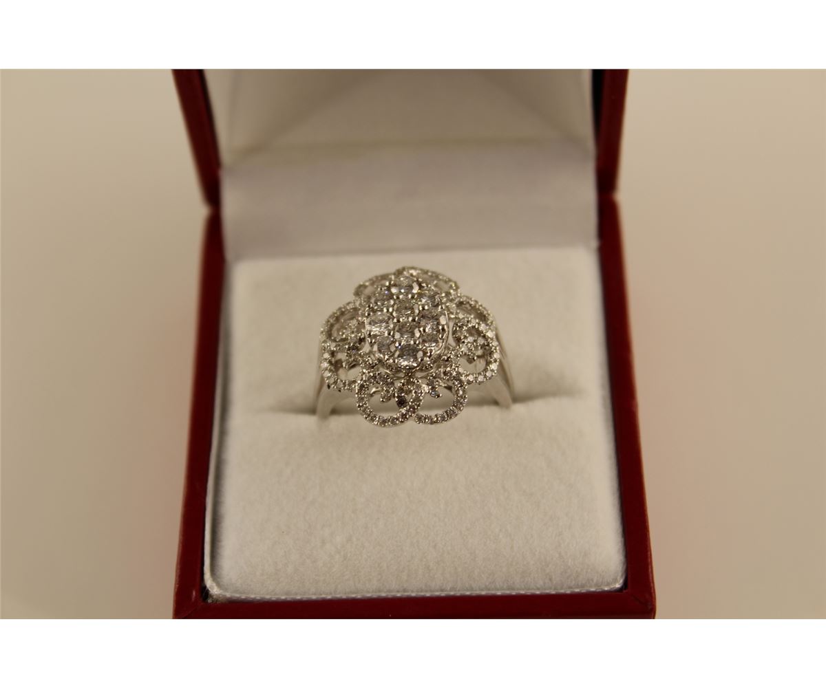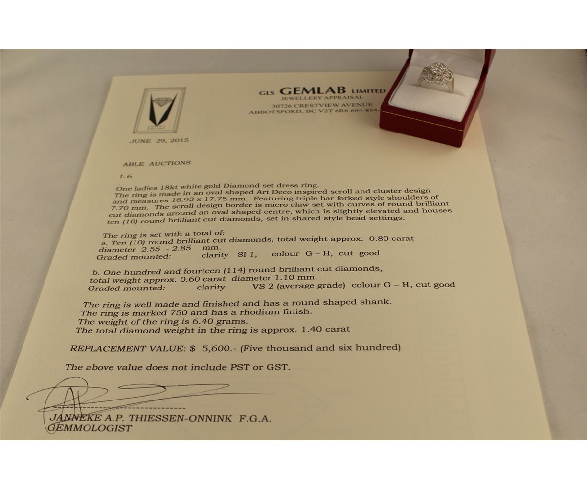 ONE LADIES 18KT WHITE GOLD DIAMOND SET ENGAGEMENT RING, MADE IN AN ART DECO STYLE AND SET WITH TEN ROUND BRILLIANT CUT DIAMONDS APPROX. 0.80CT, SI 1, G-H COLOUR AND 114 ROUND BRILLIANT CUT DIAMONDS VS 2, G-H COLOUR. REPLACEMENT VALUE $5600