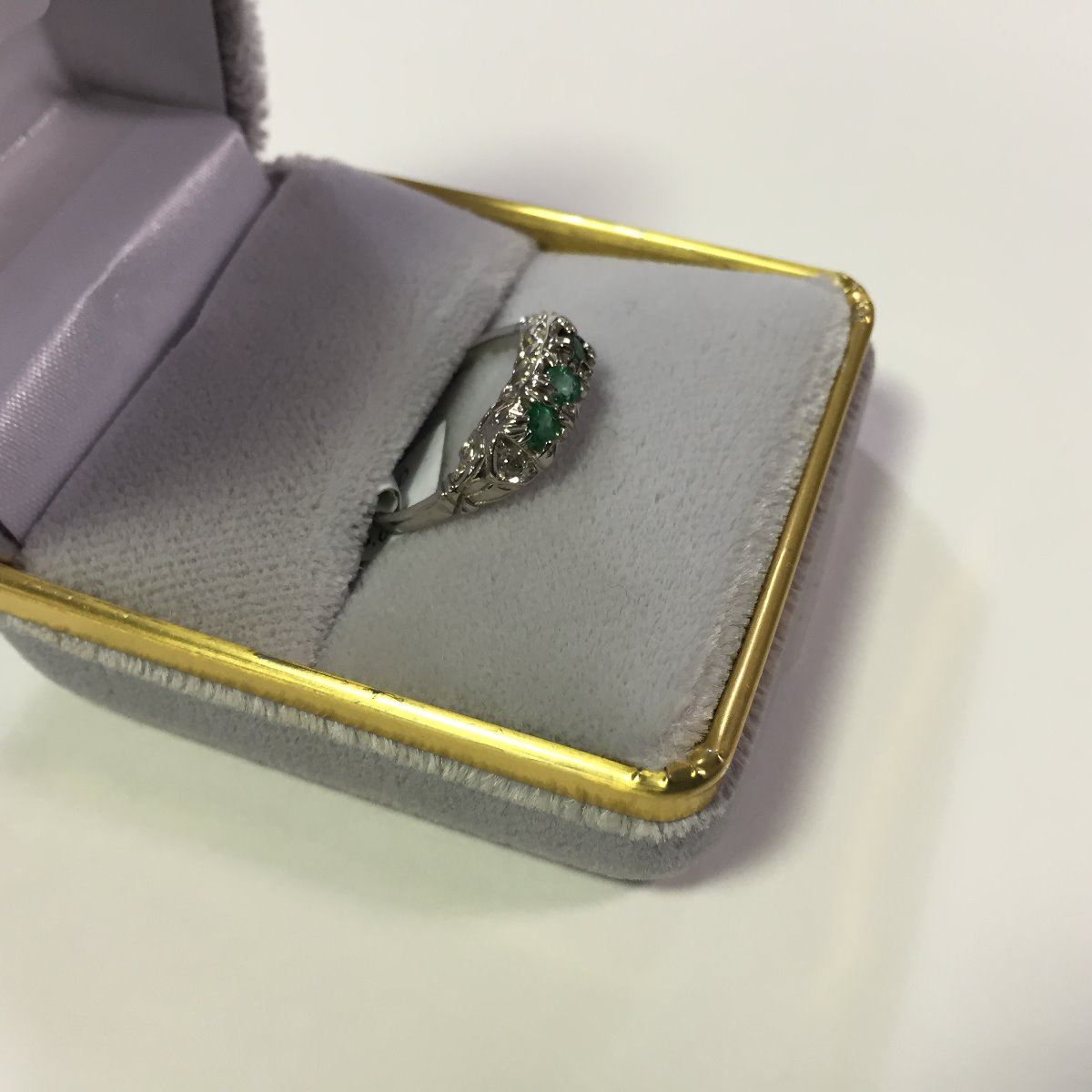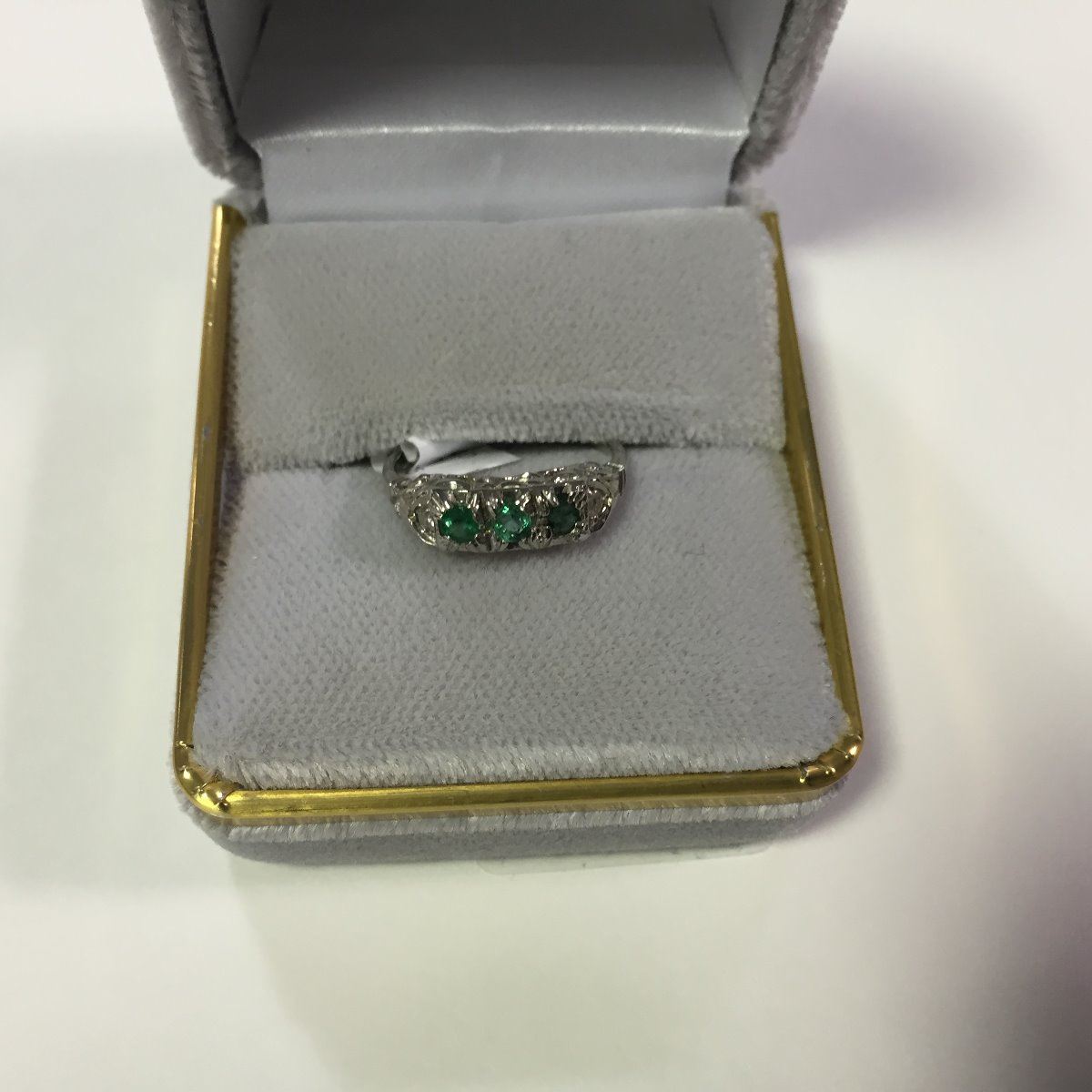 ONE LADIES 18KT WHITE GOLD NATURAL EMERALD & DIAMOND SET DRESS RING. ANTIQUE INSPIRED THREE ACROSS DESIGN 3 ROUND MIXED CUT EMERALDS 0.26CARAT 2 ROUND BRILLIANT CUT DIAMONDS 0.075CARAT WEIGHT 2.5GRAMS REPLACEMENT VALUE $600