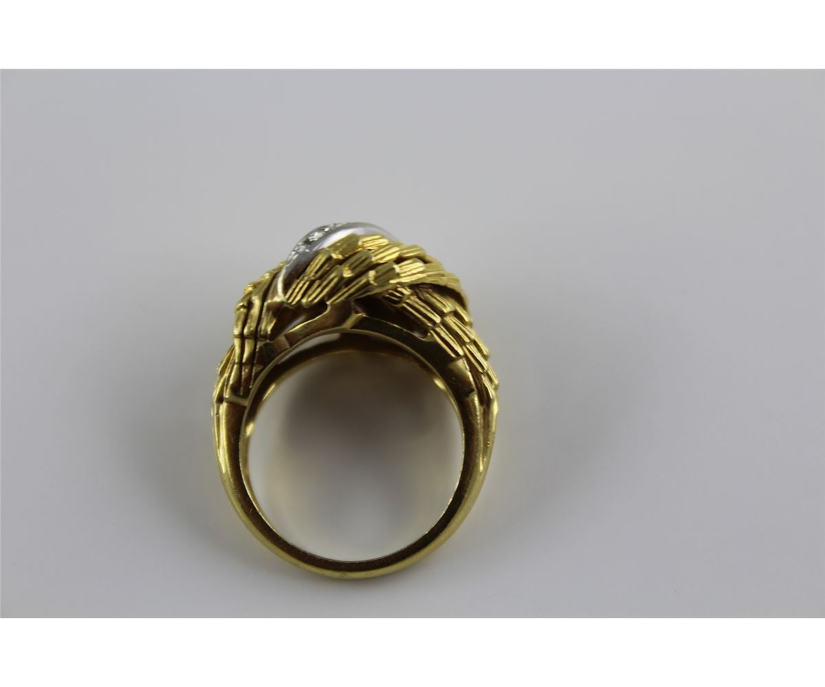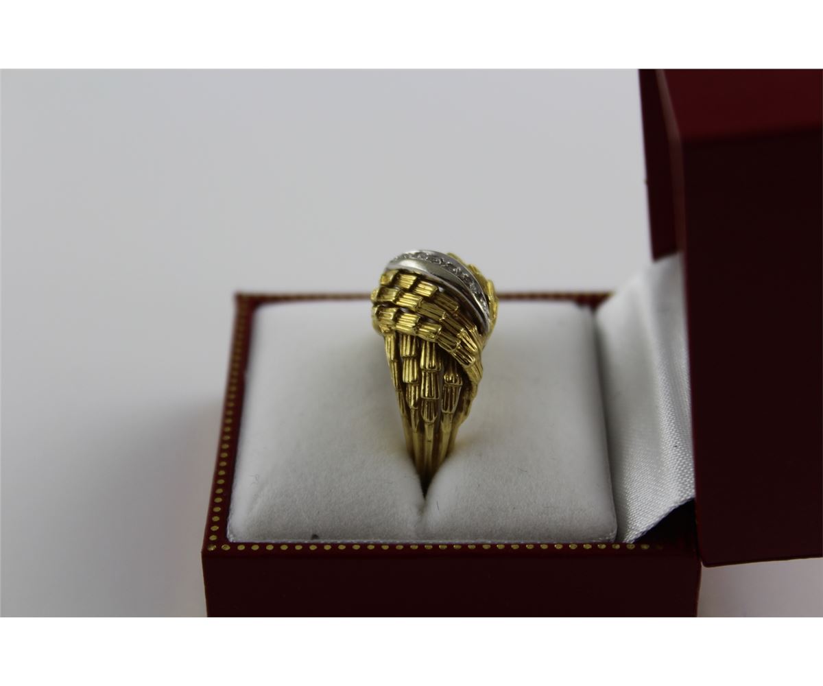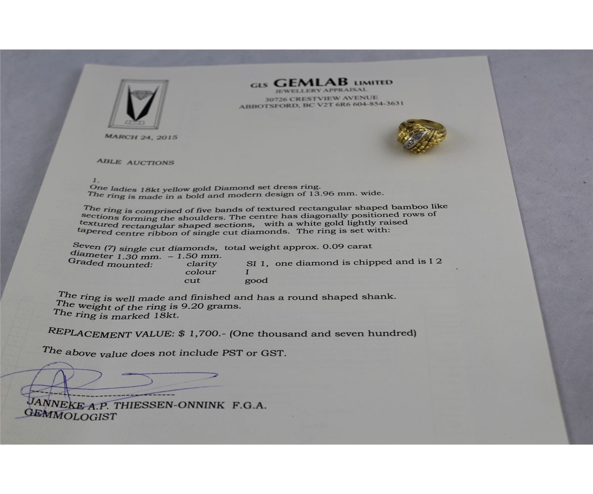 ONE LADIES 18KT YELLOW GOLD DIAMOND SET DRESS RING. SET WITH SEVEN SINGLE CUT DIAMONDS APPROX. 0.09CT SI1, I COLOUR. REPLACEMENT VALUE $1700