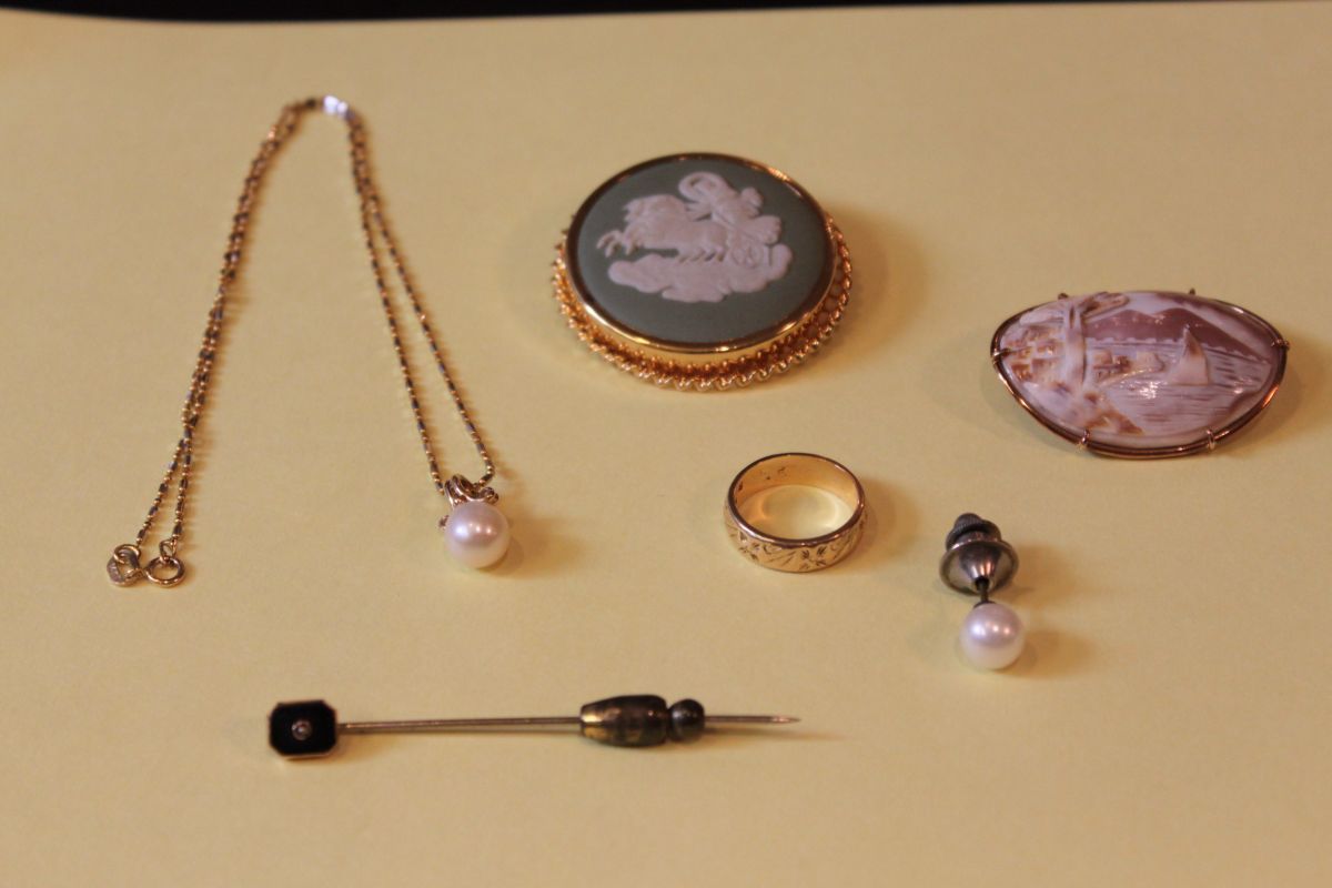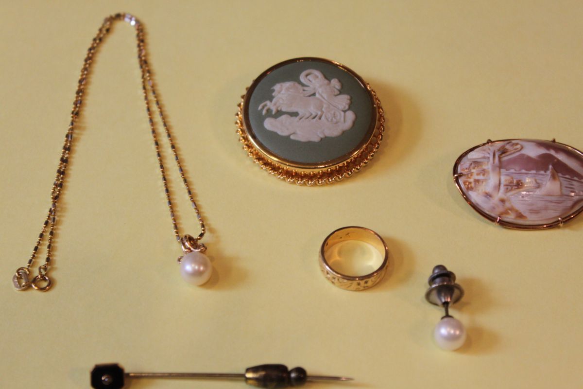 One green and white Wedgewood porcelain and yellow gold plated brooch.