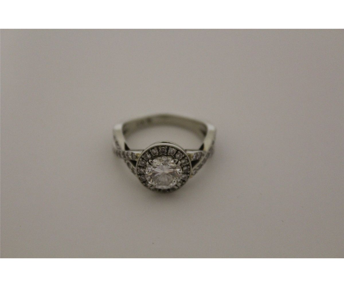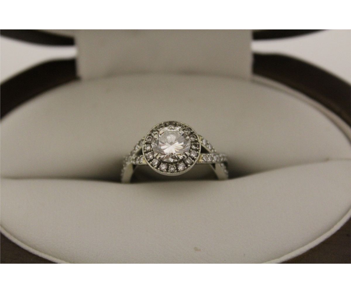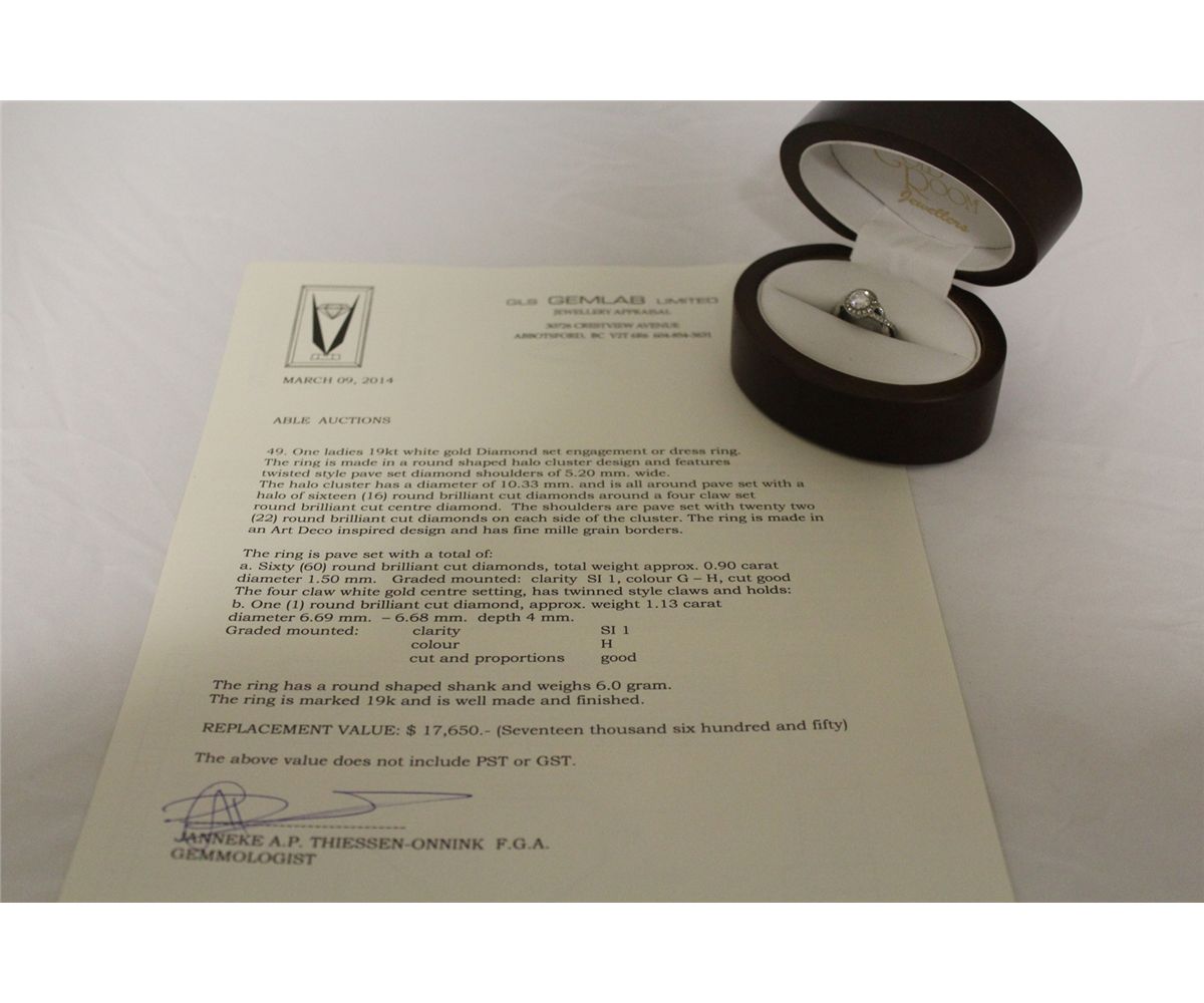 ONE LADIES 19KT WHITE GOLD DIAMOND ENGAGEMENT RING. MADE IN A ROUND SHAPED HALO CLUSTER AND FEATURES TWISTED STYLE PAVE SET SHOULDERS. ONE ROUND BRILLIANT CUT 1.13 CARAT, SI 1, H COLOUR, GOOD CUT AND SET WITH 60 ROUND BRILLIANT CUT DIAMONDS 0.90 CARAT, SI 1, G-H COLOUR. 6 GRAMS