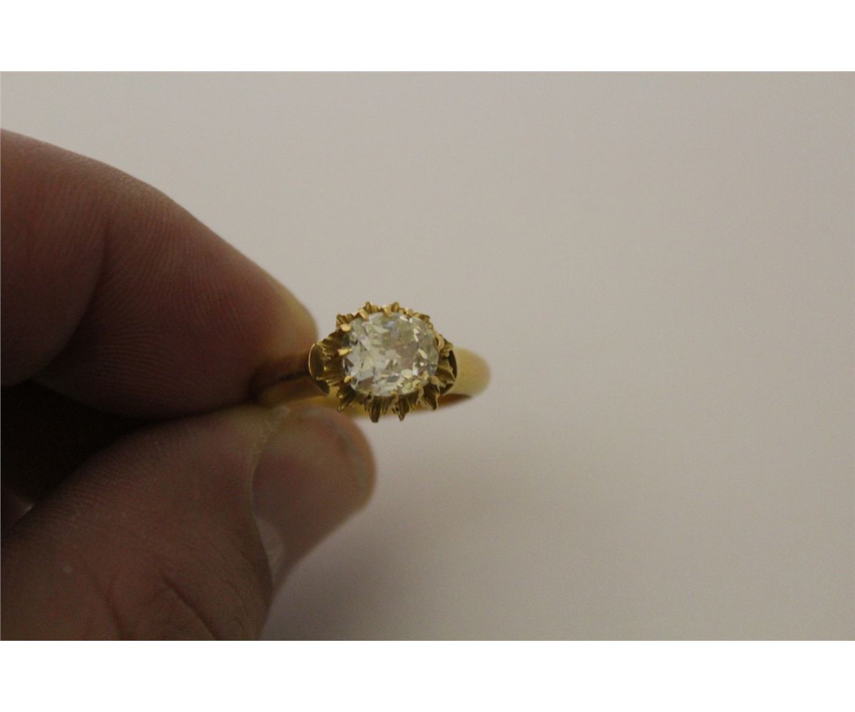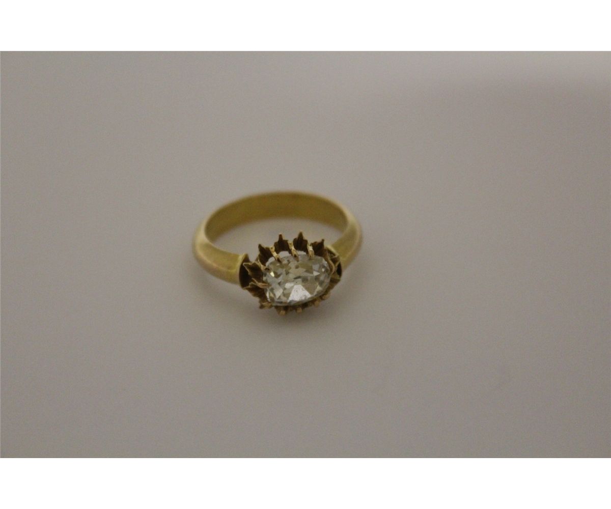 ONE LADIES 20KT YELLOW GOLD DIAMOND SET DRESS OR ENGAGEMENT RING. CIRCA 1860-1890. THE RING  HAS AN ELEVEN CLAW (ONE CLAW MISSING) SETTING WHICH HOLDS ONE (1) OVAL SHAPED EUROPEAN CUT DIAMOND APPROX. 1.18 CARAT. I1, M COLOUR SLIGHTLY TINTED, WEIGHT IS 4.70 GRAMS AND INCLUDES  GEMOLOGIST APPRAISAL WITH REPLACEMENT VALUE OF $4,250