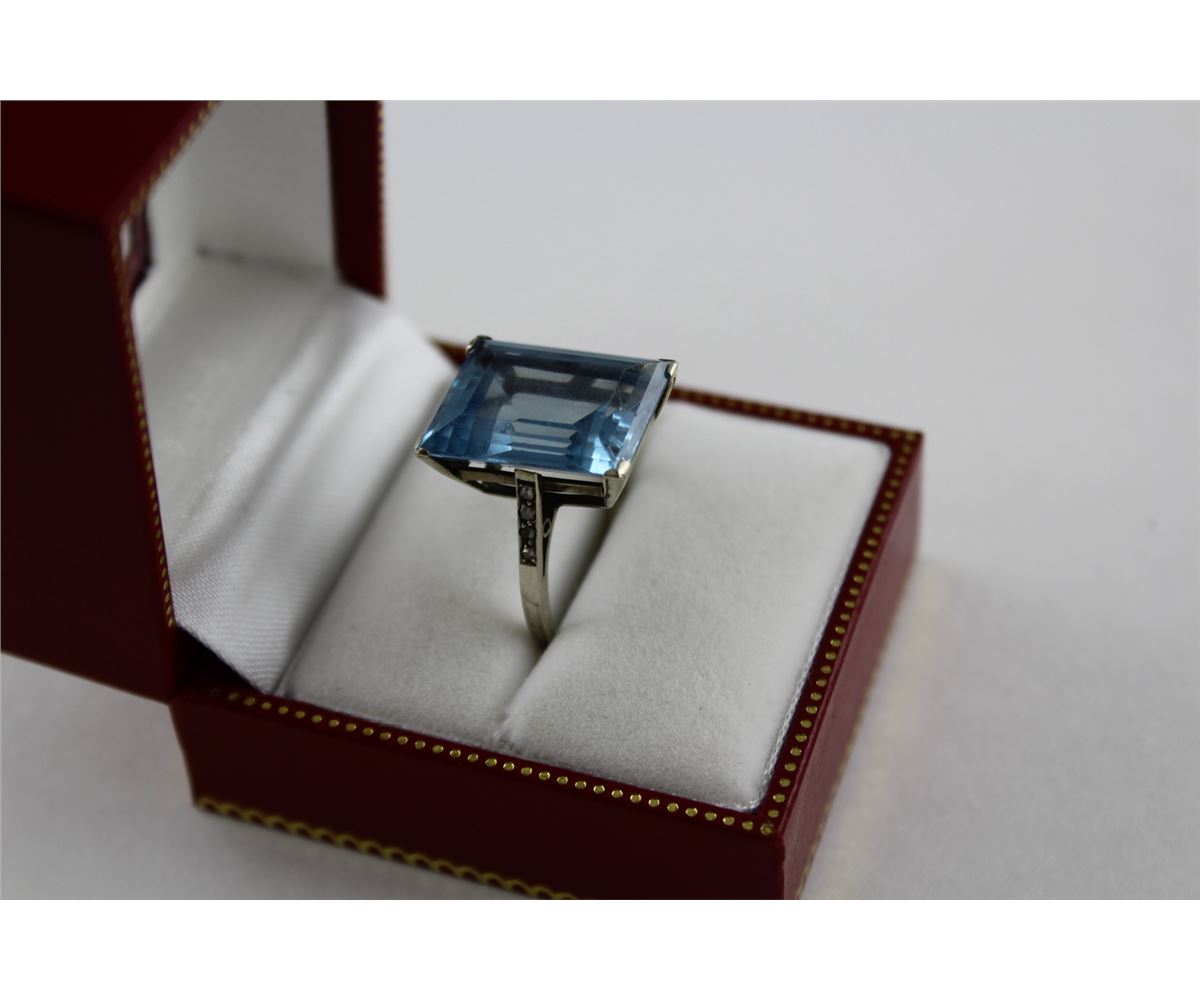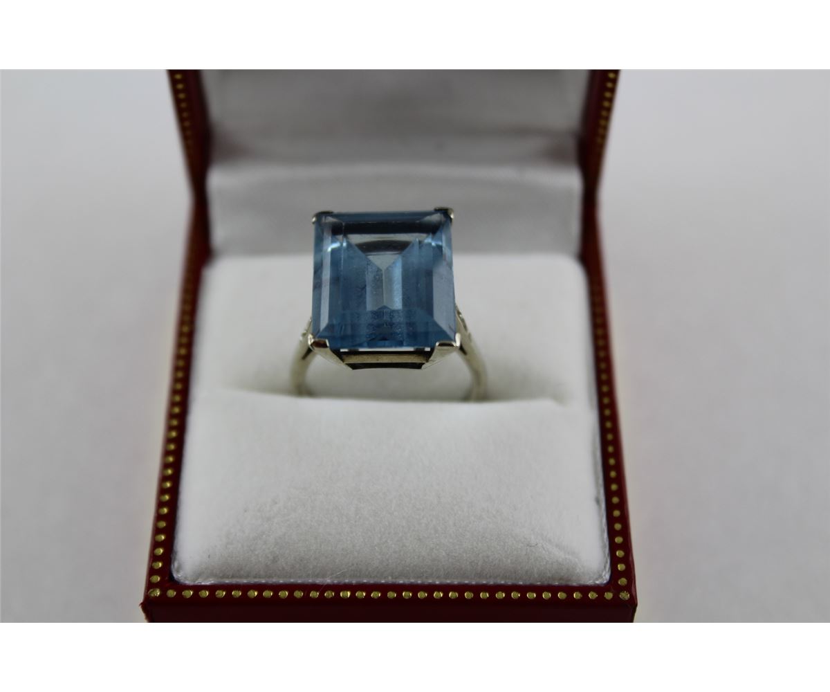 ONE LADIES HAND MADE 9KT WHITE GOLD BLUE SYNTHETIC SPINEL DRESS RING SET WITH ONE STEP CUT BLUE SYNTHETIC SPINEL AND 8 ROUND MODIFIED ANTIQUE ROSE CUT DIAMONDS REPLACEMENT VALUE $800