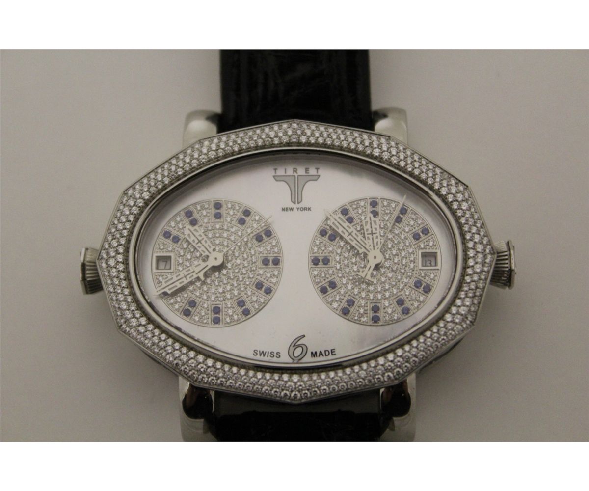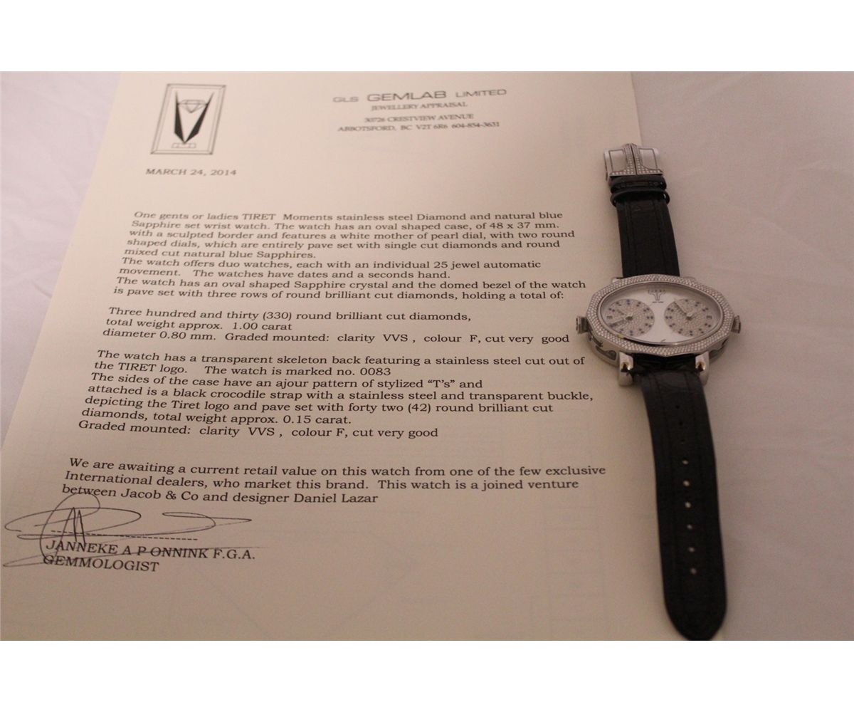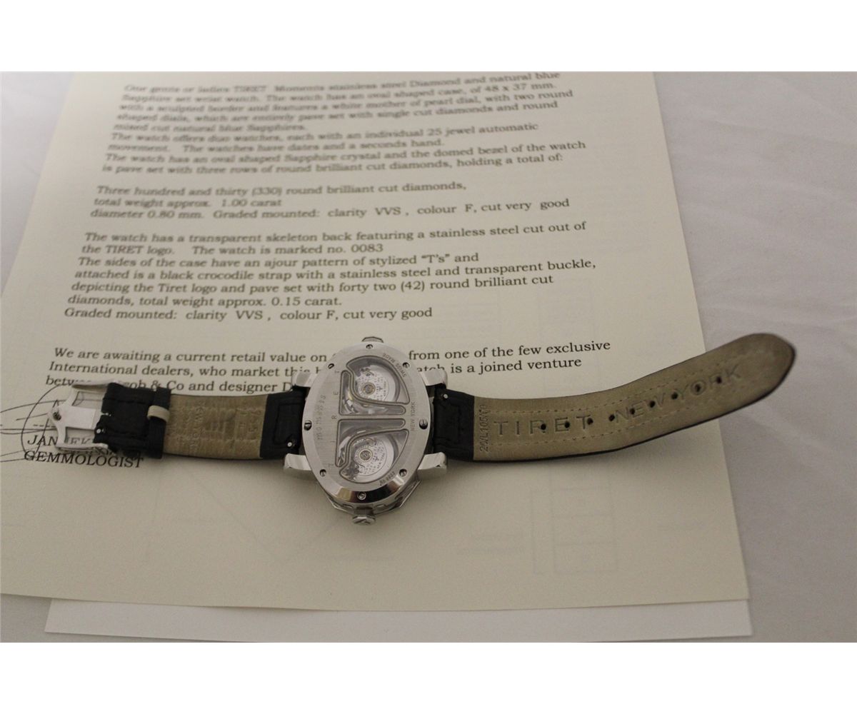 ONE LADIES OR GENTS TIRET MOMENTS STAINLESS STEEL DIAMOND AND NATURAL BLUE SAPPHIRE SET WRIST WATCH THE WATCH FEATURES DUO INDIVIDUAL 25 JEWEL AUTOMATIC MOVEMENTS. FEATURING 330 ROUND BRILLIANT CUT DIAMONDS 1.00 CARAT, VVS, COLOUR F. MARKED NO. 0083 THIS WATCH IS A JOINED VENTURE BETWEEN JACOB & CO AND DESIGNER DANIEL LAZAR AND IS ONLY OFFERED FOR SALE FROM A FEW EXCLUSIVE INTERNATIONAL DEALERS WHO MARKET THIS BRAND. TO FIND THIS PIECE AT AUCTION IN CANADA IS EXTREMELY RARE. INCL. GEMMOLOGIST APPRAISAL $21,105