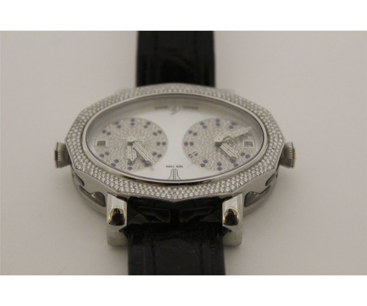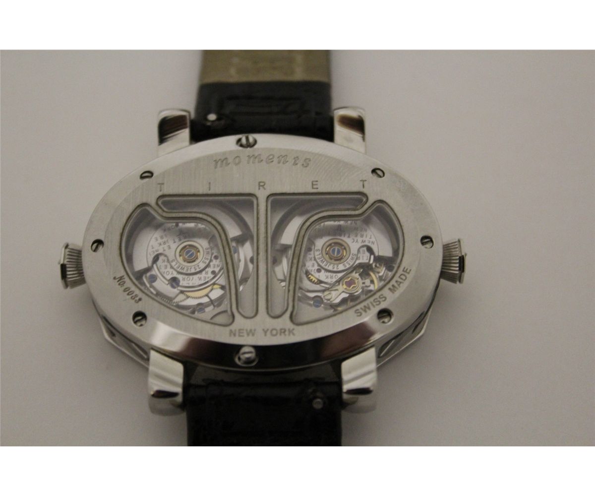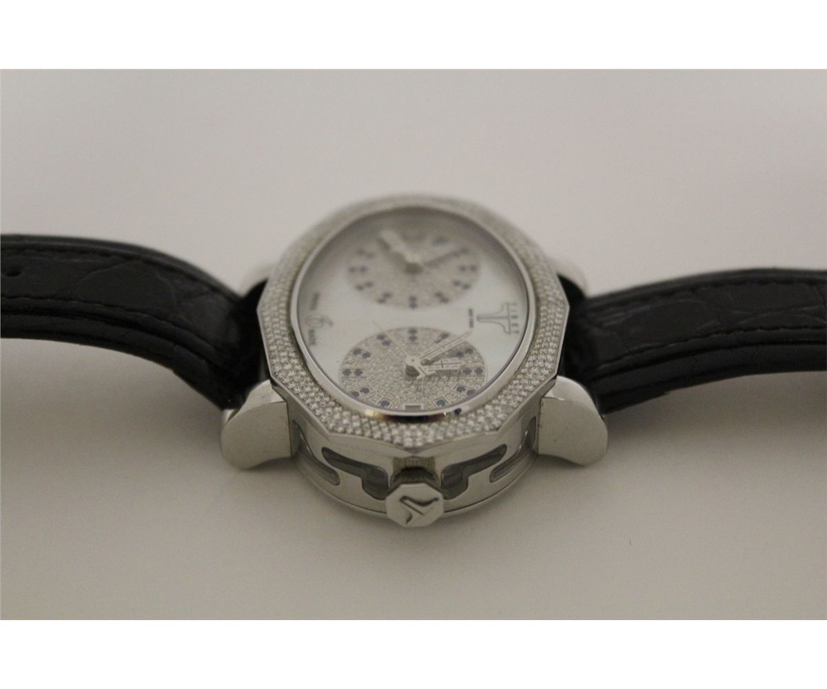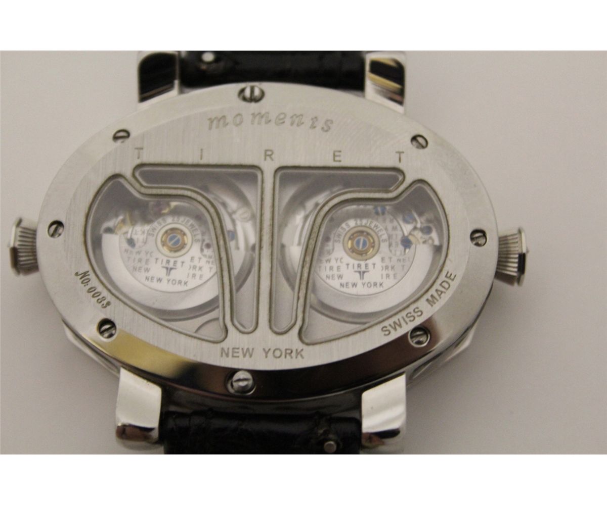 ONE LADIES OR GENTS TIRET MOMENTS STAINLESS STEEL DIAMOND AND NATURAL BLUE SAPPHIRE SET WRIST WATCH THE WATCH FEATURES DUO INDIVIDUAL 25 JEWEL AUTOMATIC MOVEMENTS. FEATURING 330 ROUND BRILLIANT CUT DIAMONDS 1.00 CARAT, VVS, COLOUR F. MARKED NO. 0083 THIS WATCH IS A JOINED VENTURE BETWEEN JACOB & CO AND DESIGNER DANIEL LAZAR AND IS ONLY OFFERED FOR SALE FROM A FEW EXCLUSIVE INTERNATIONAL DEALERS WHO MARKET THIS BRAND. TO FIND THIS PIECE AT AUCTION IN CANADA IS EXTREMELY RARE. INCL. GEMMOLOGIST APPRAISAL $21,105